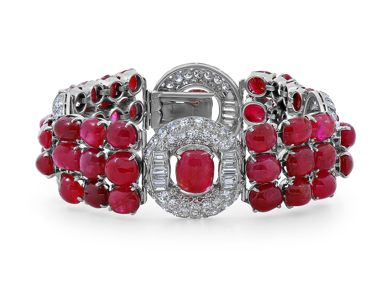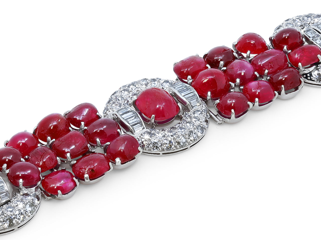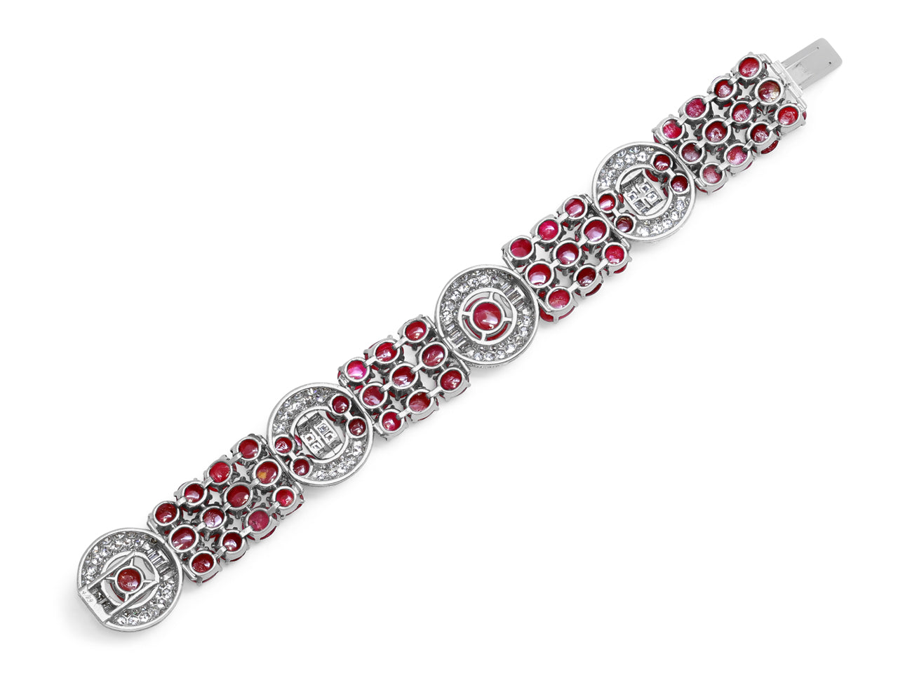 A platinum bracelet in the art deco style set with fifty-two cabochon rubies of approximately 85.0 carats, accented with round and step-cut diamonds of approximately 13.0 carats.