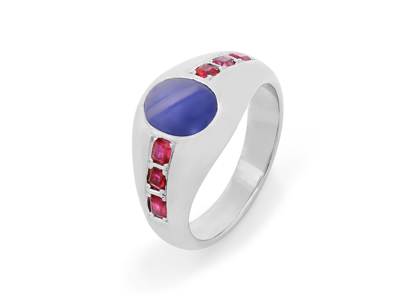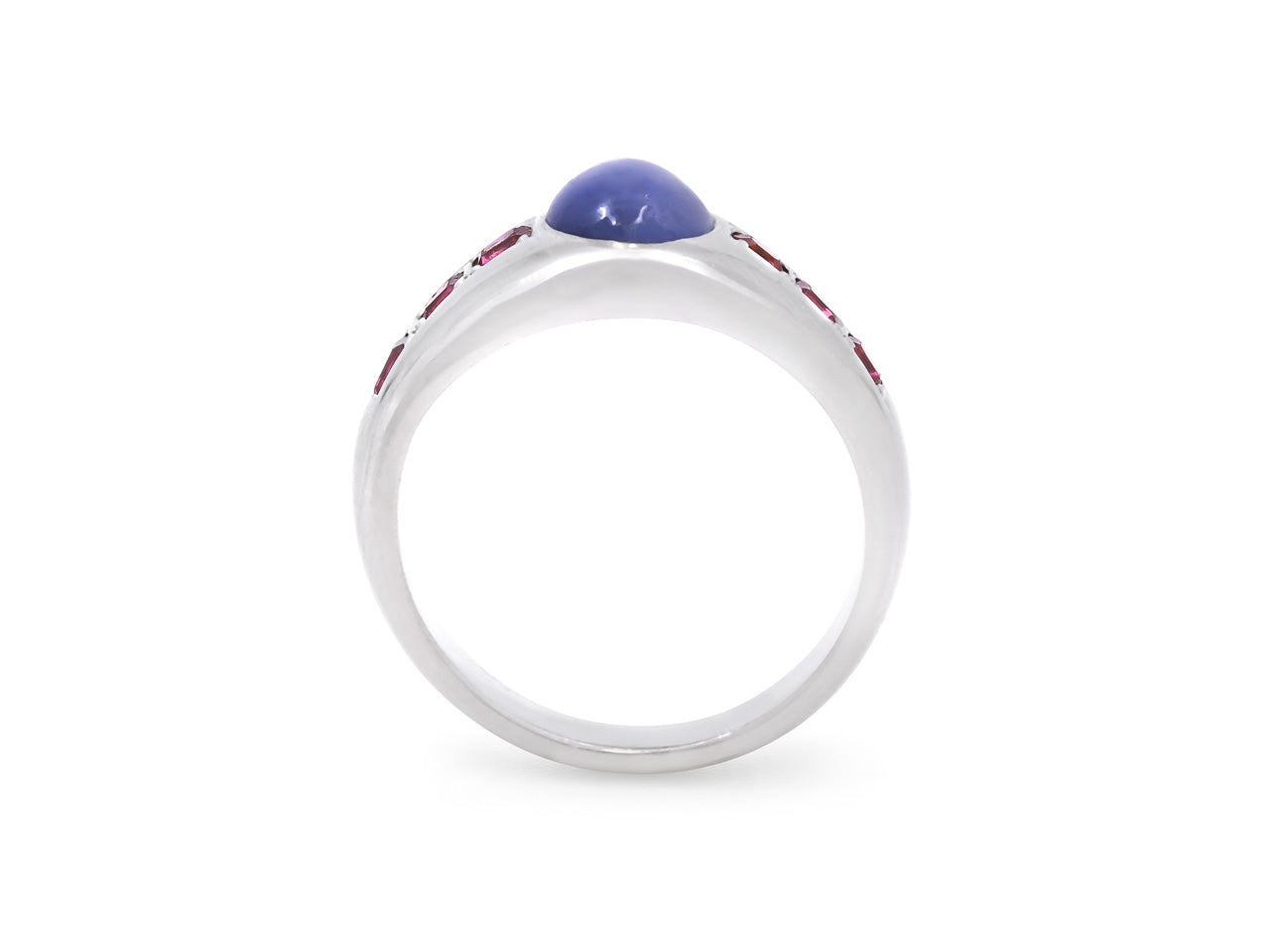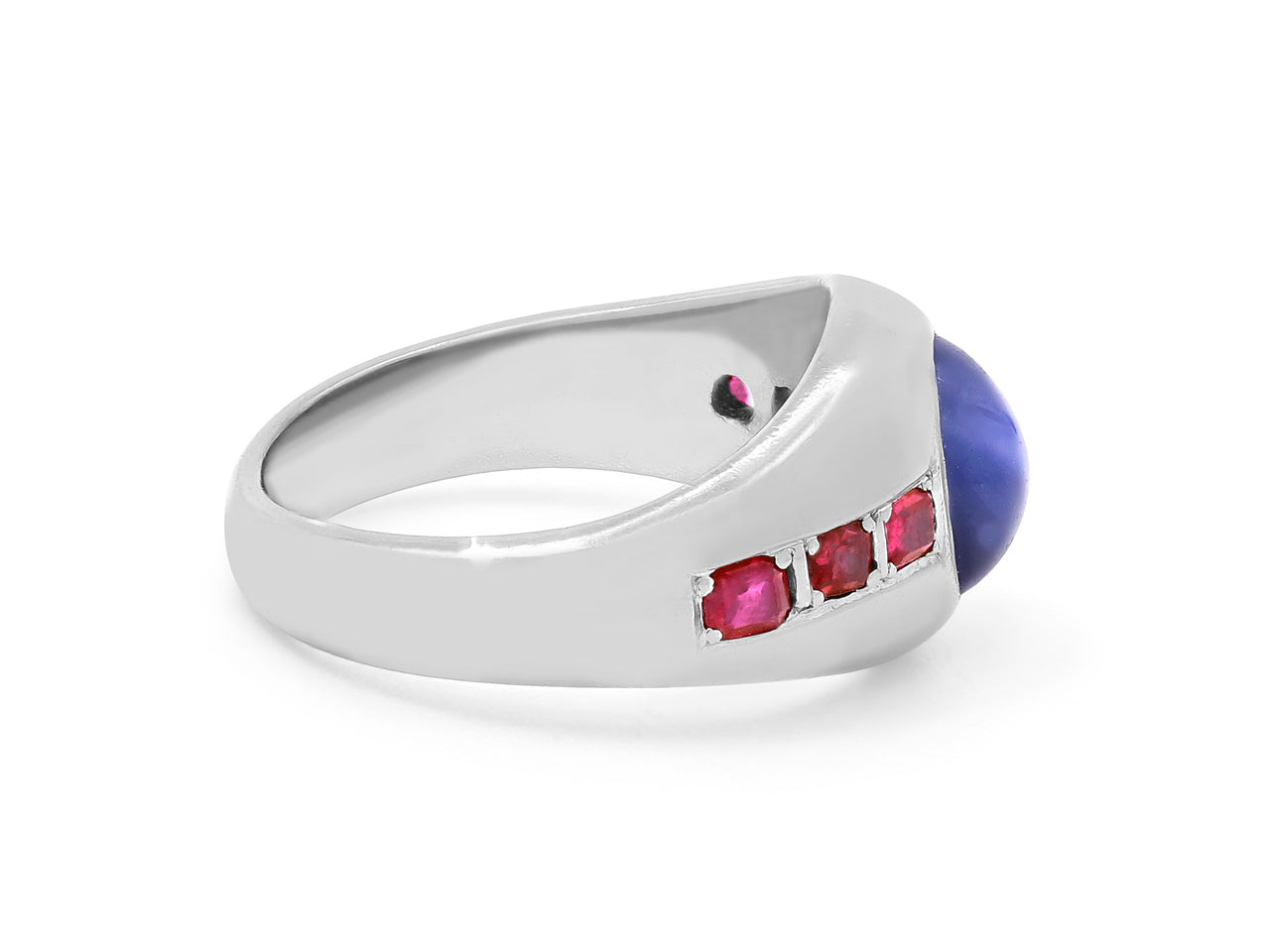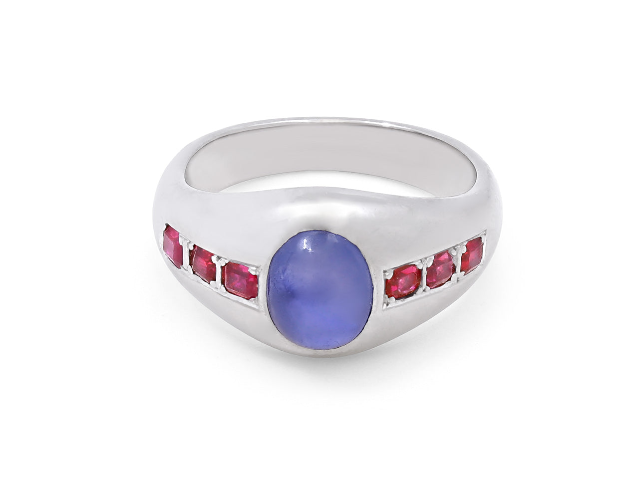 18k white gold cabochon sapphire gypsy ring set with six rubies.