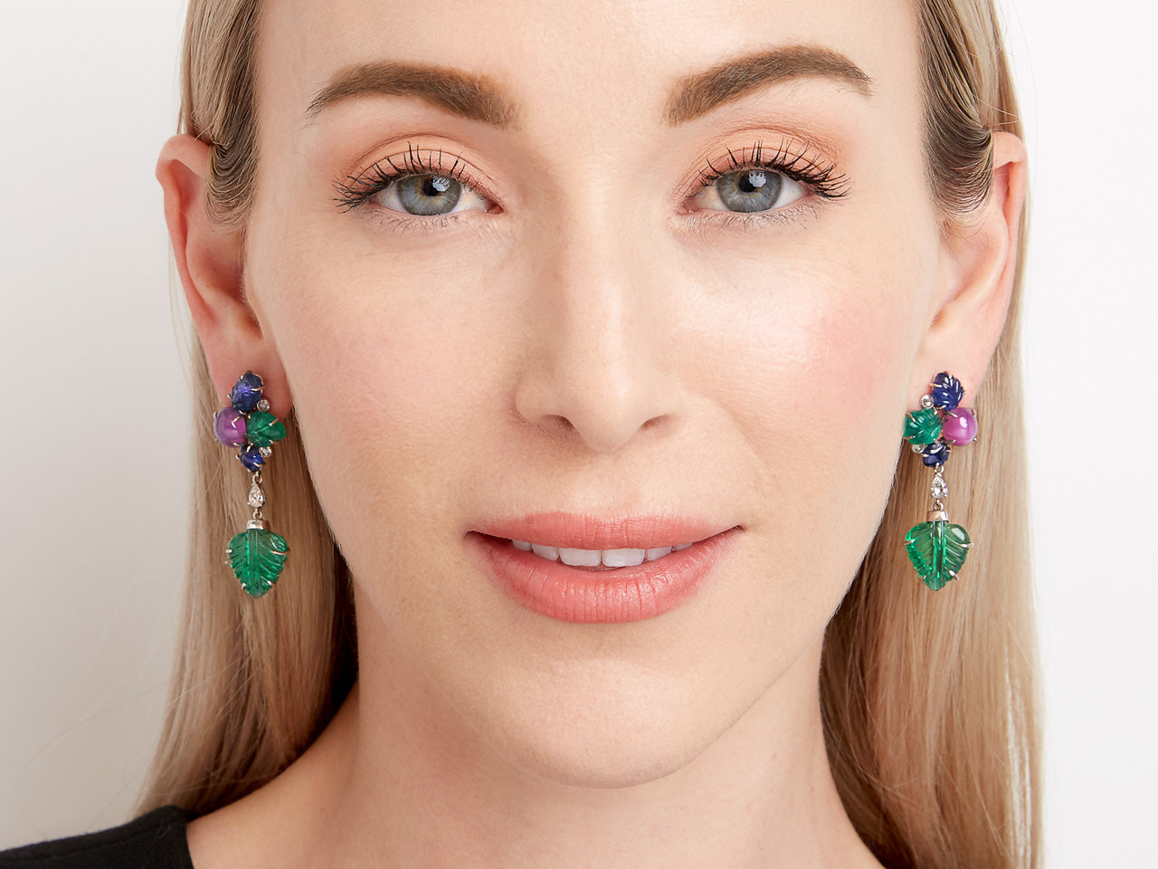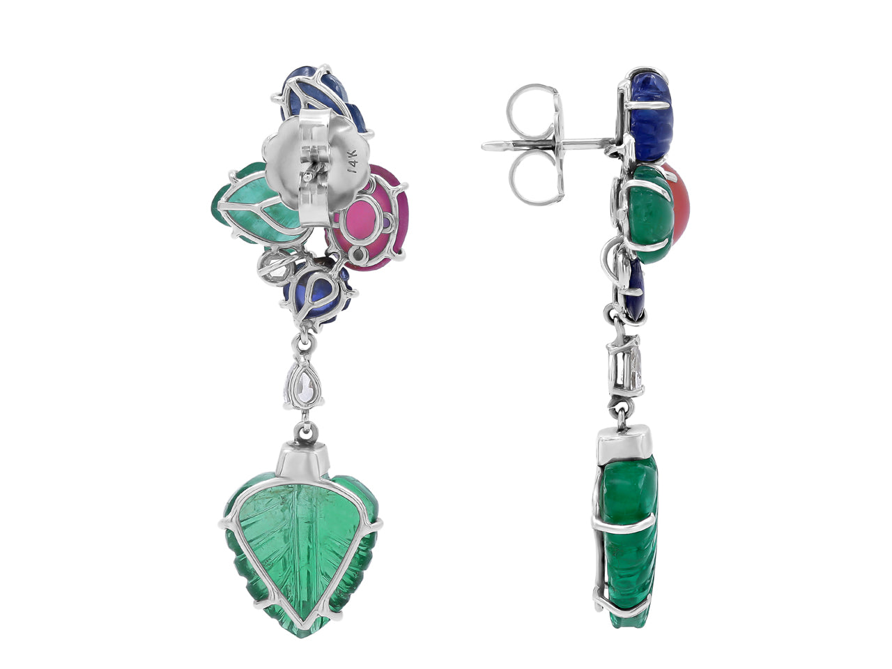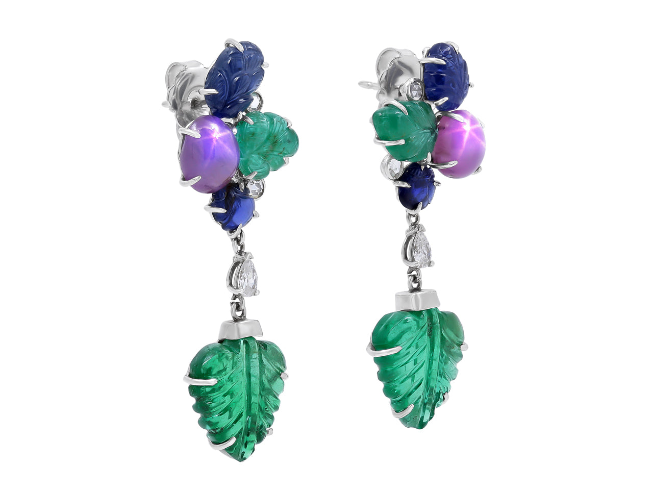 Carved emeralds and sapphires set with star rubies in leaf shaped earrings, with pear shape and rose cut diamonds.