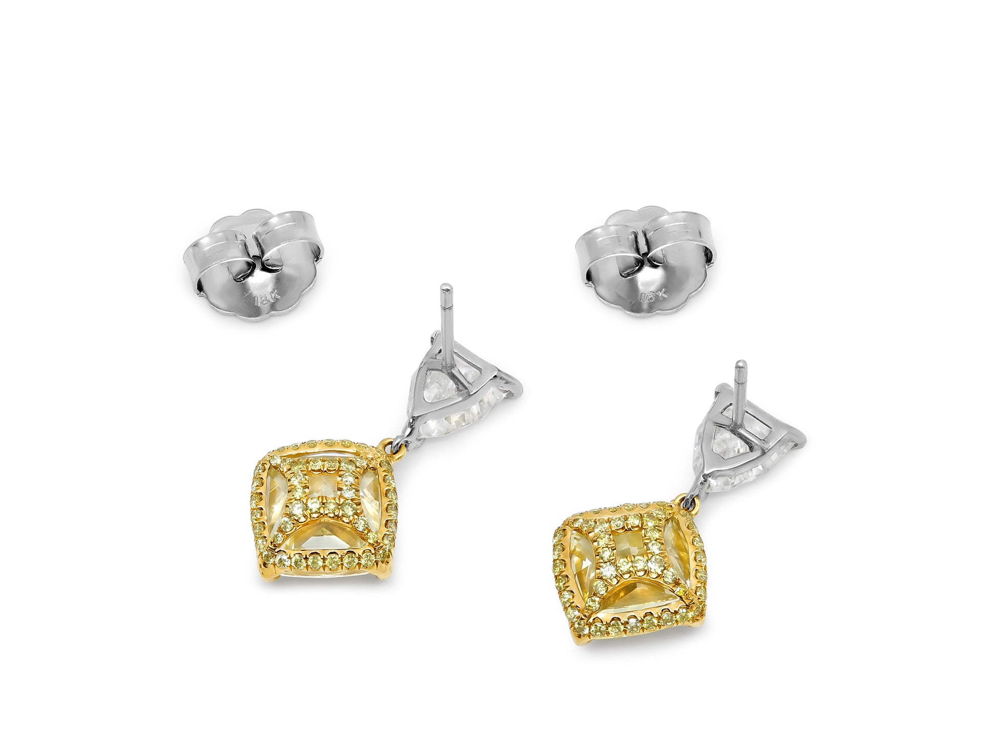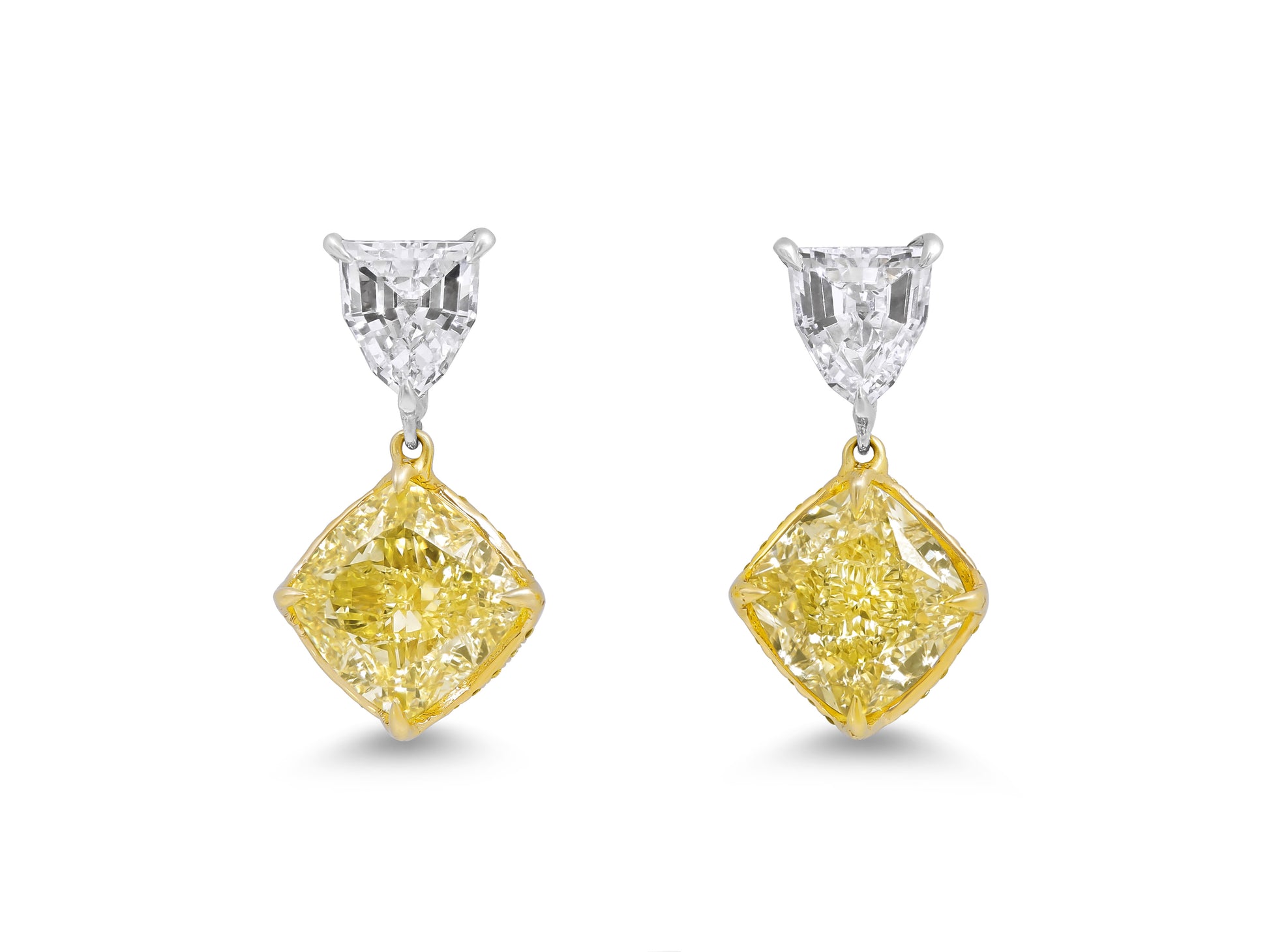 A pair of cushion-cut yellow diamonds prong-set in 18K yellow gold with pavé diamonds on the basket, mounted above a pair of shield-cut diamonds set in platinum.