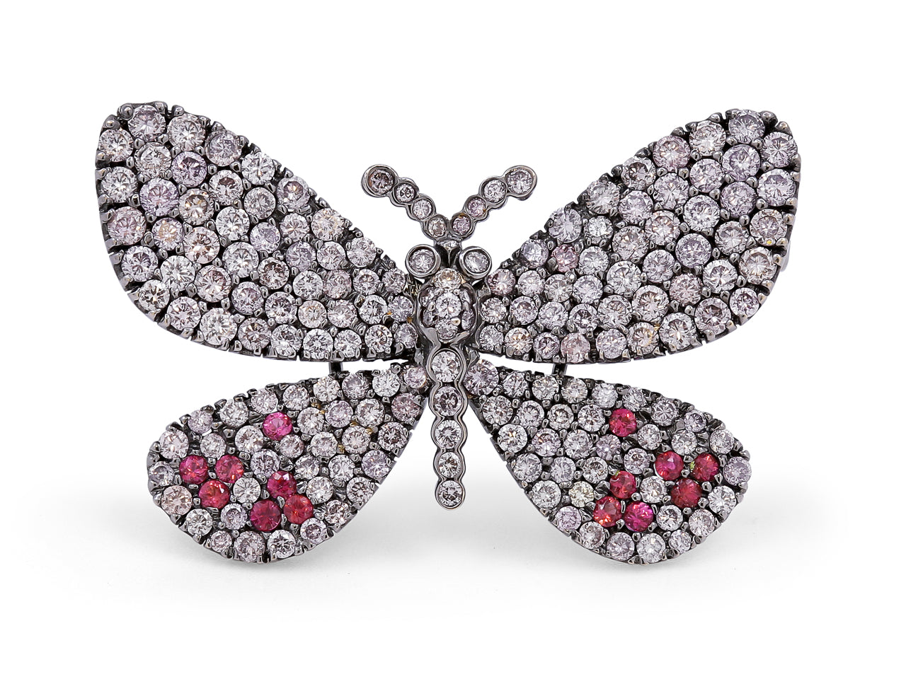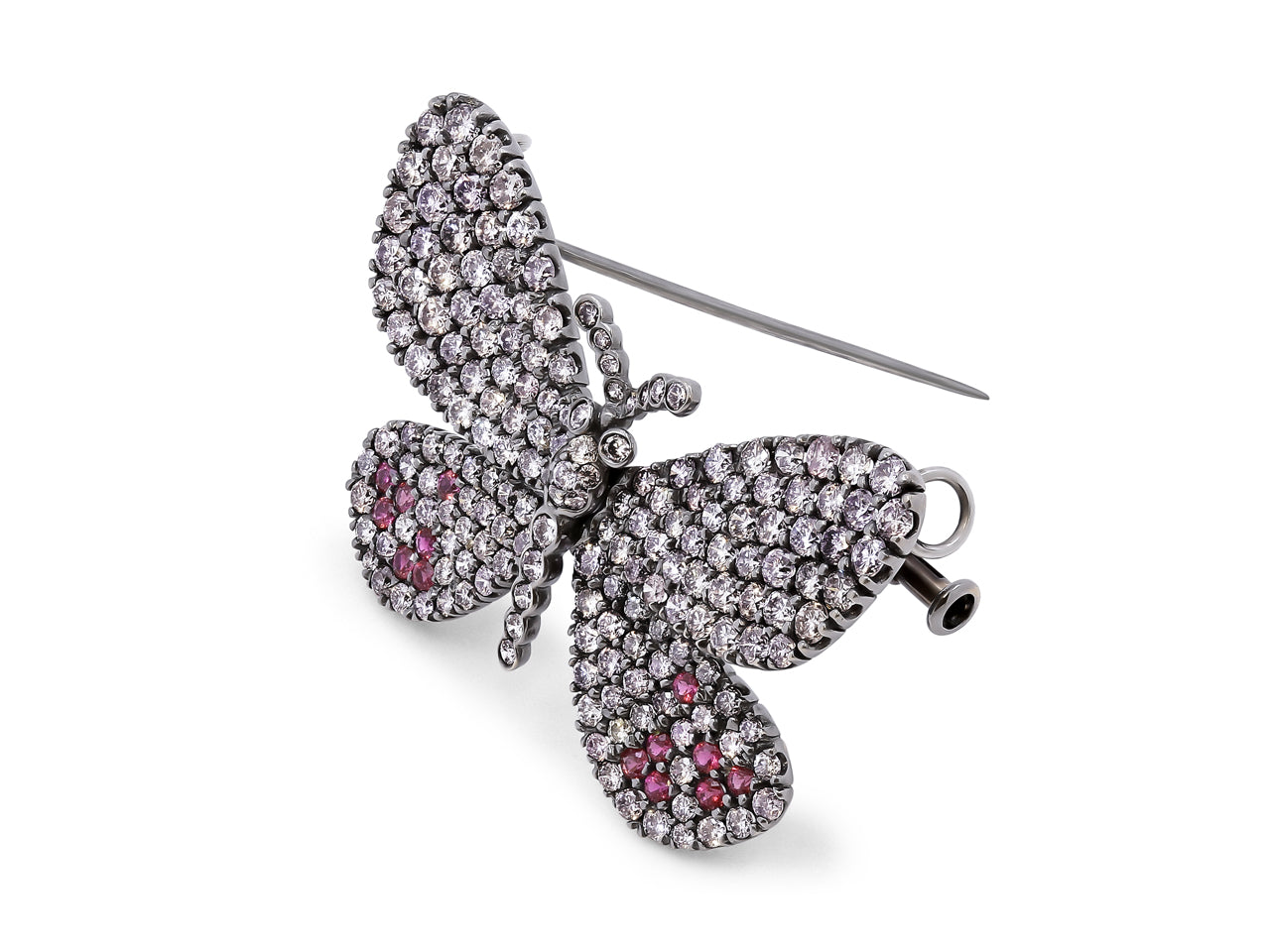 An 18K white gold butterfly brooch set with colorless and pink brilliant diamonds and brilliant cut pink sapphires.