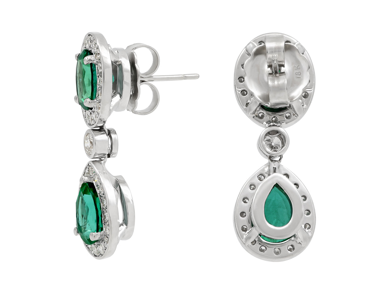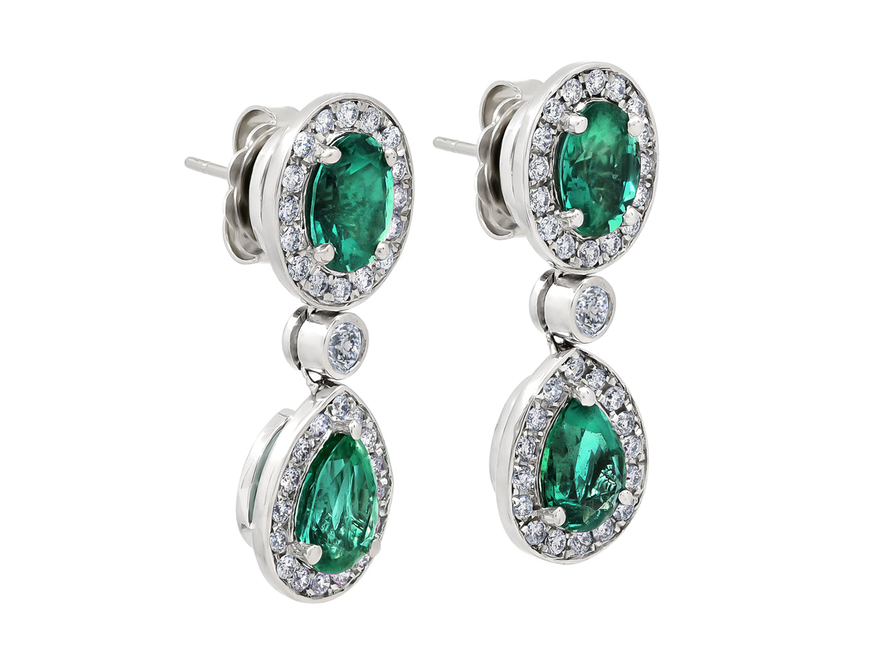 A pair of drop earrings composed of two oval-cut and two pear-shaped emeralds, surrounded by round brilliant diamonds of 1.50 carats total weight.