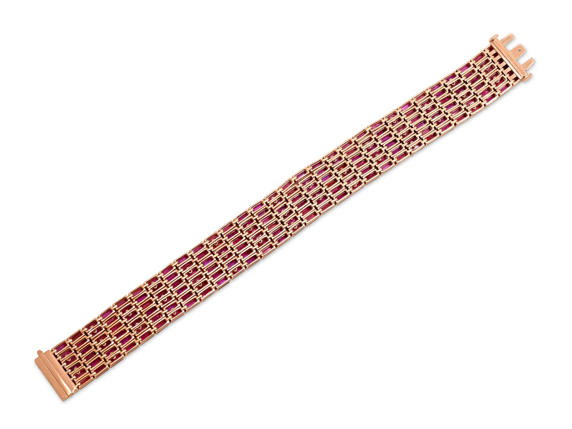 An 18K yellow gold bracelet featuring five rows of half-bezel-set rubies of Mozambique origin with indications of heating.
