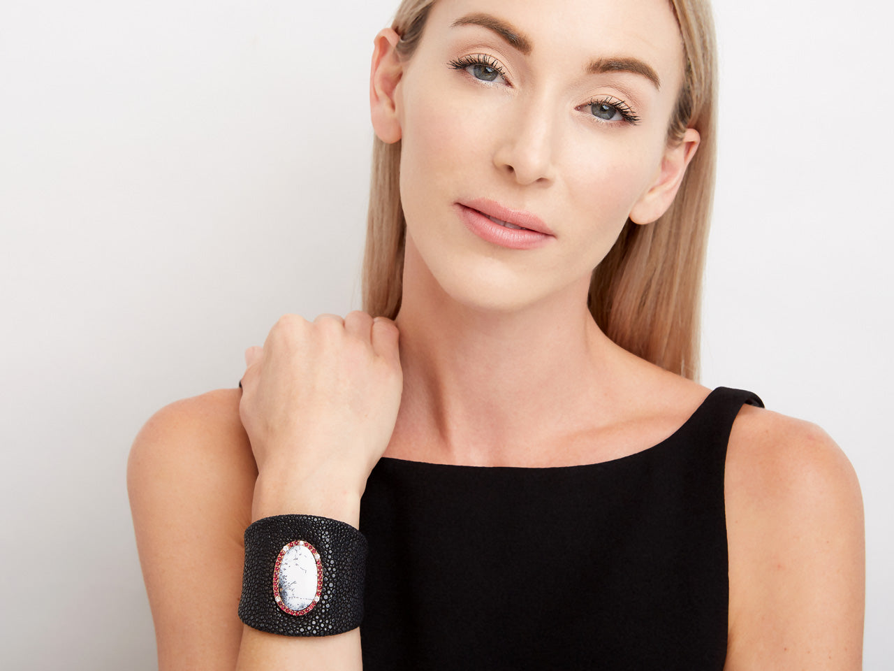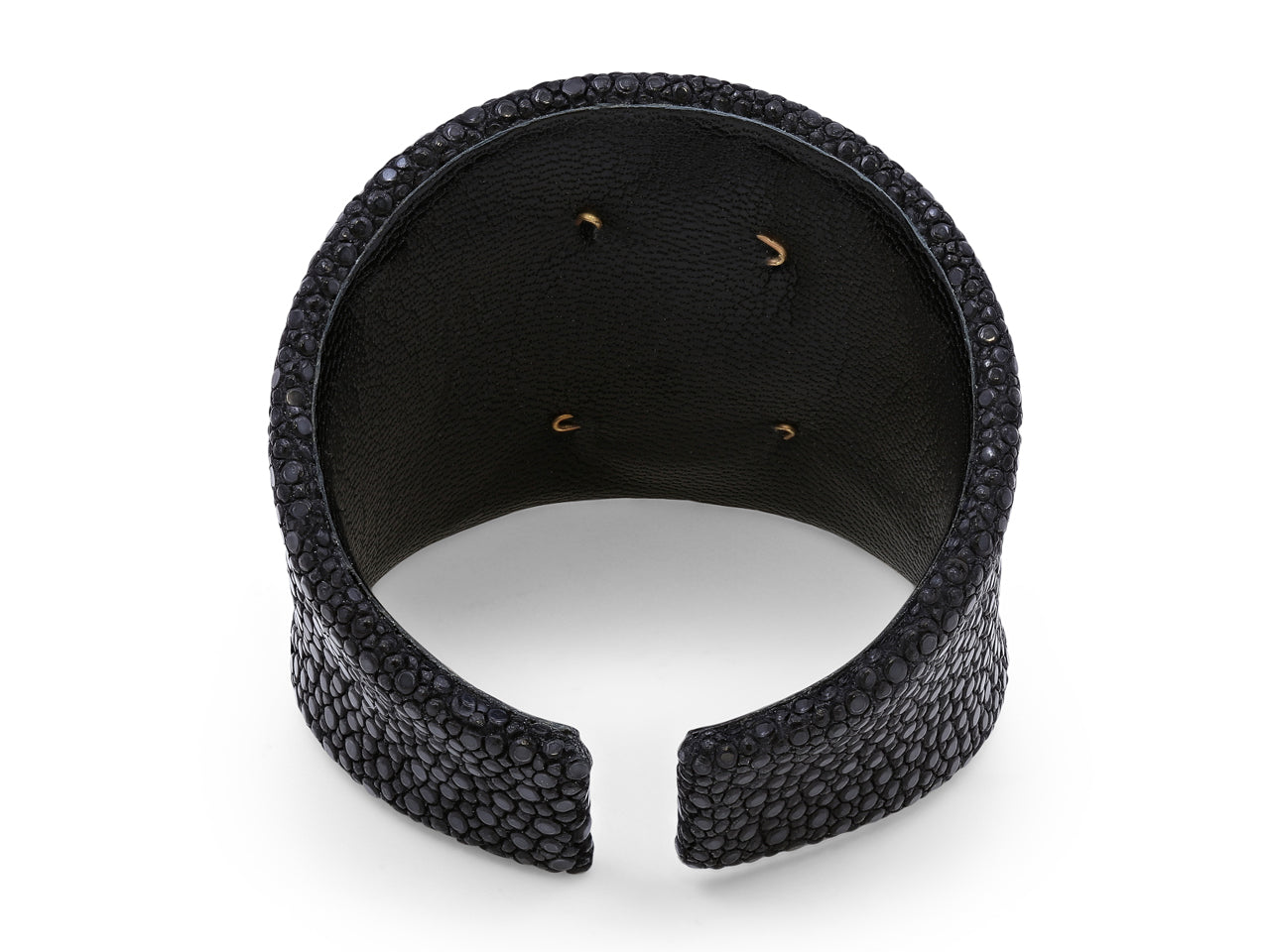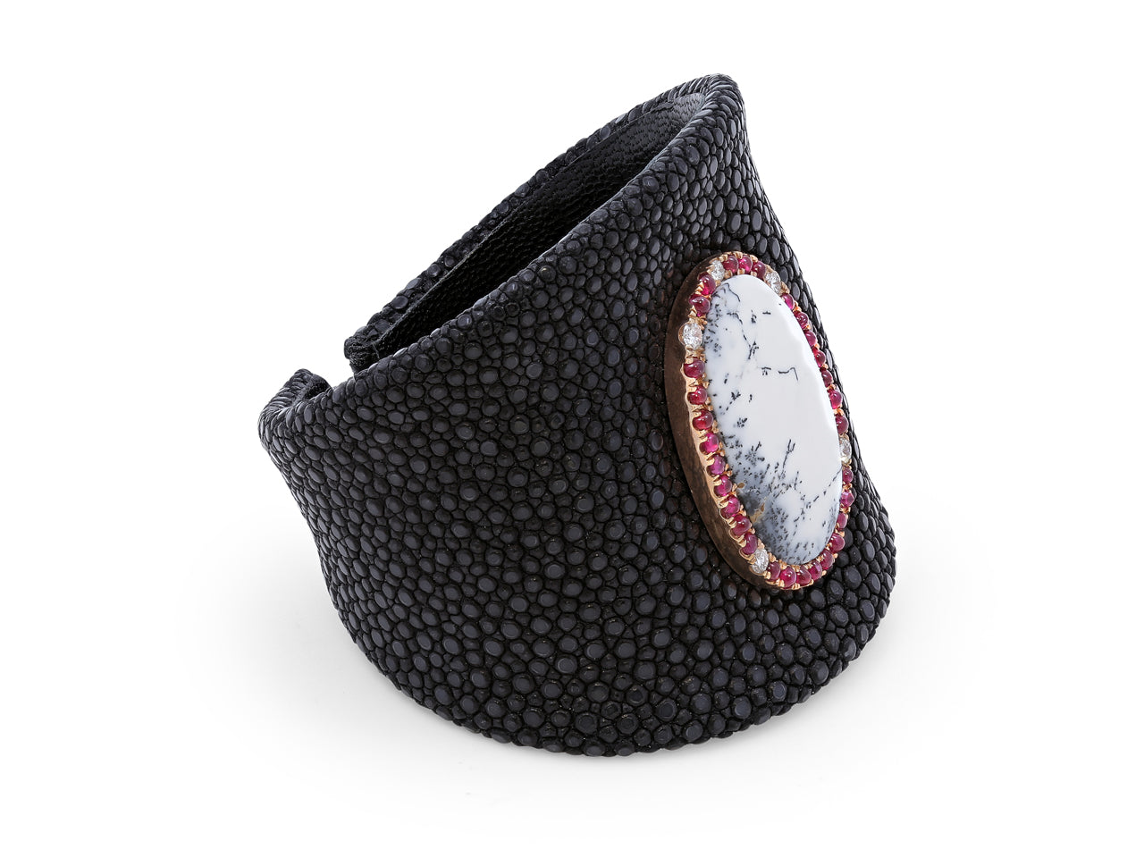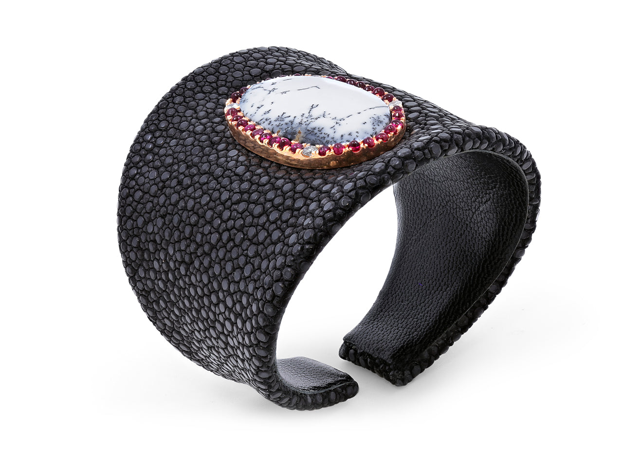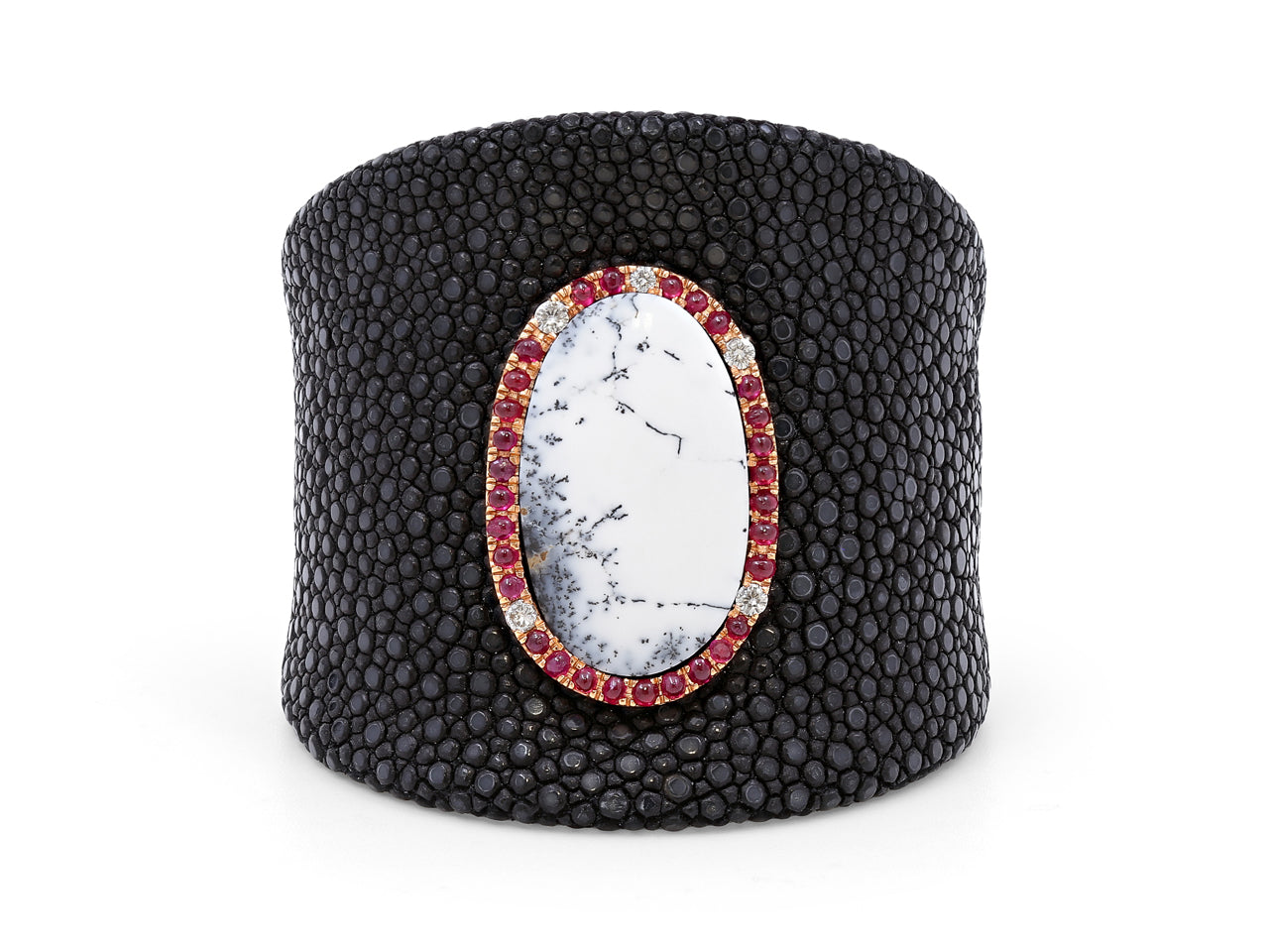 A black stingray cuff bracelet with one oval jasper, thirty cabochon ruby melee, and five round brilliant diamonds, set in 18K rose gold.