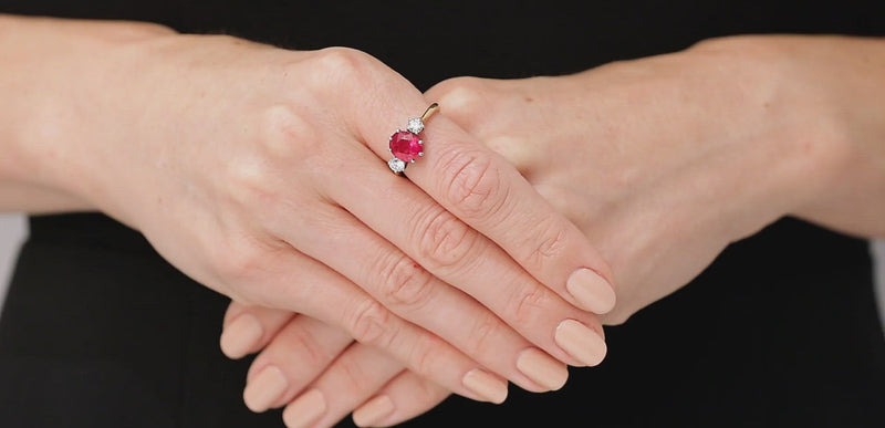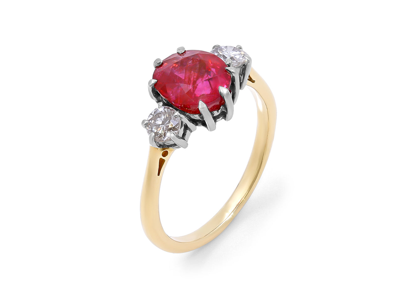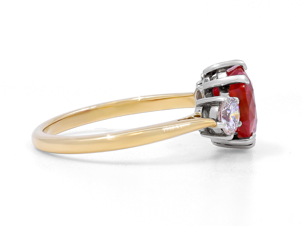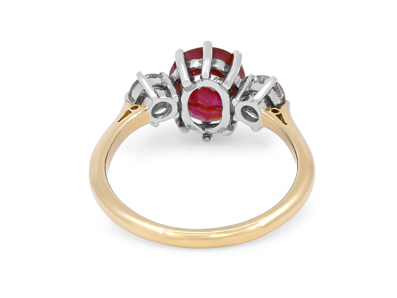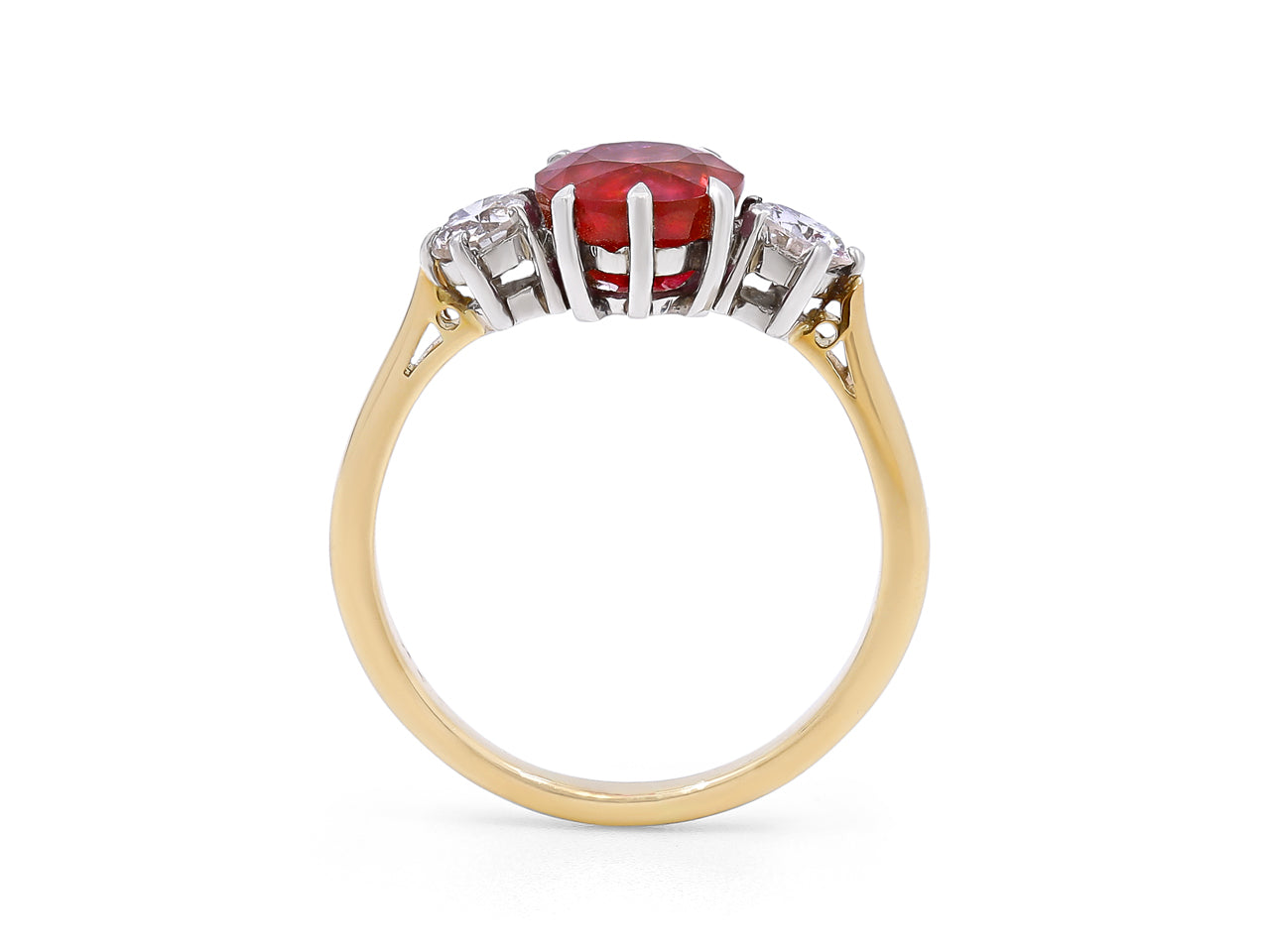 An oval ruby prong-set with two round diamond side stones in platinum, on an 18K yellow gold band. The American Gemological Laboratory (AGL) describes the ruby as having Burma origin and no indication of heating.