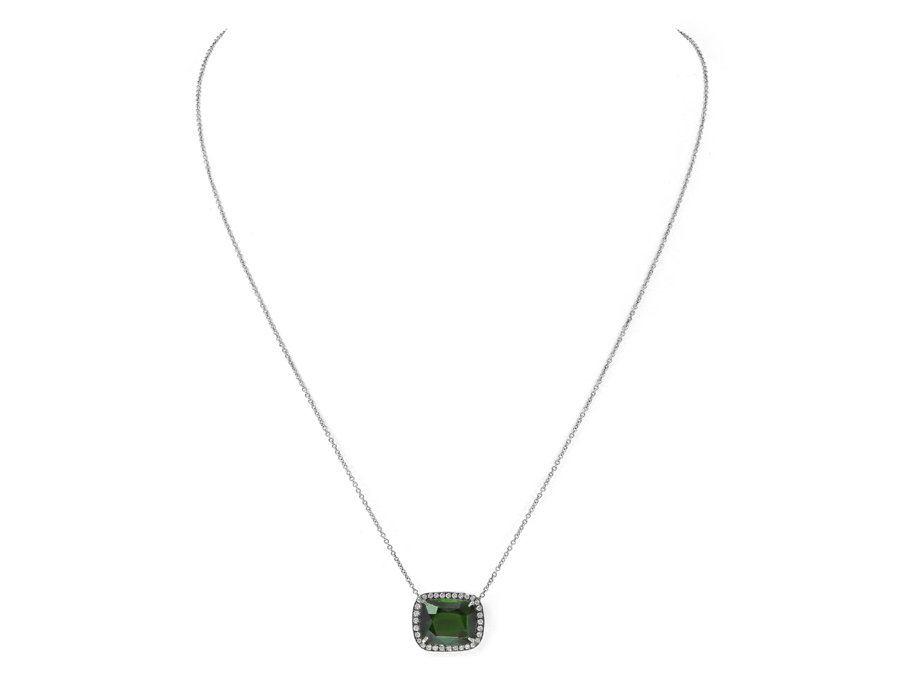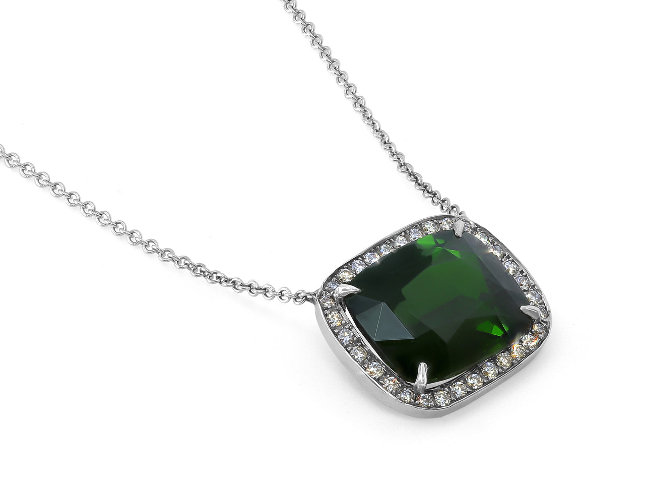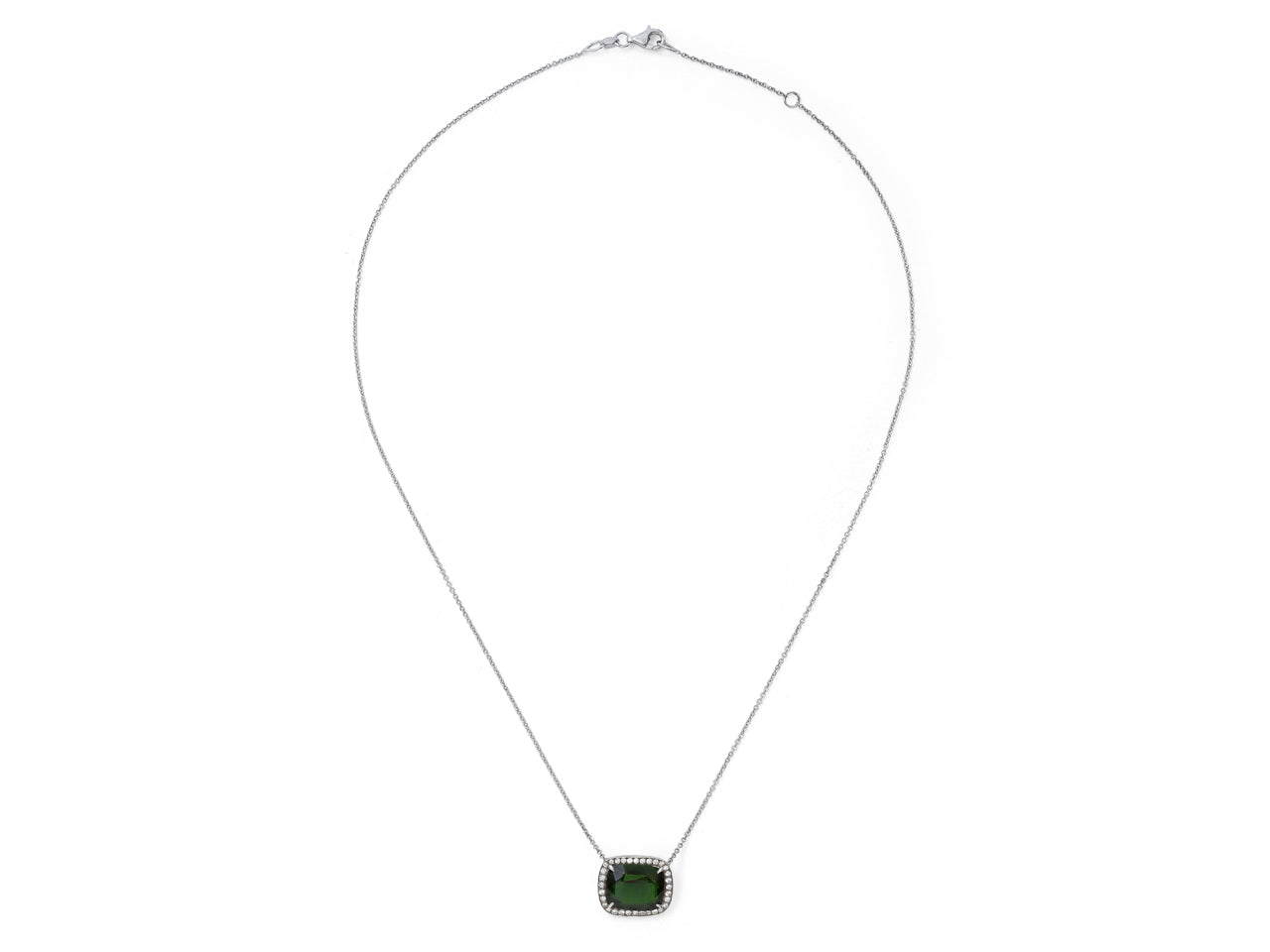 An 18K white gold pendant with a green chrome diopside set with round brilliant diamonds.