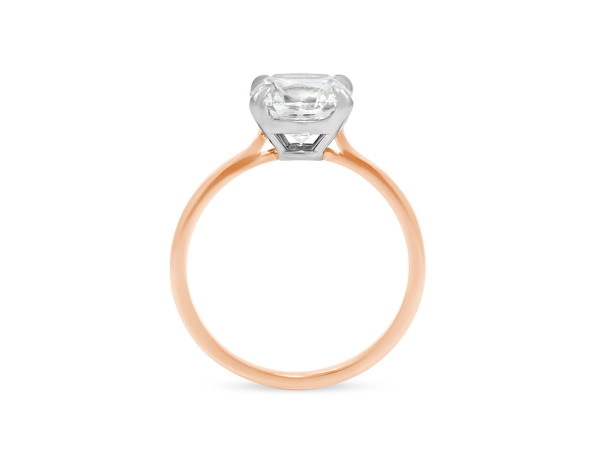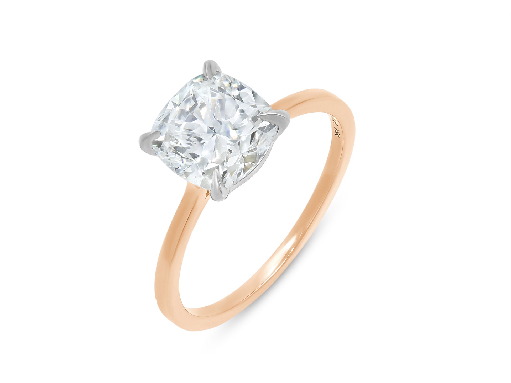 A cushion cut diamond, prong set in platinum, set on a 16K red gold solitaire mounting. The Gemological Institute of America (GIA) describes the diamond as having D color and VS1 clarity.