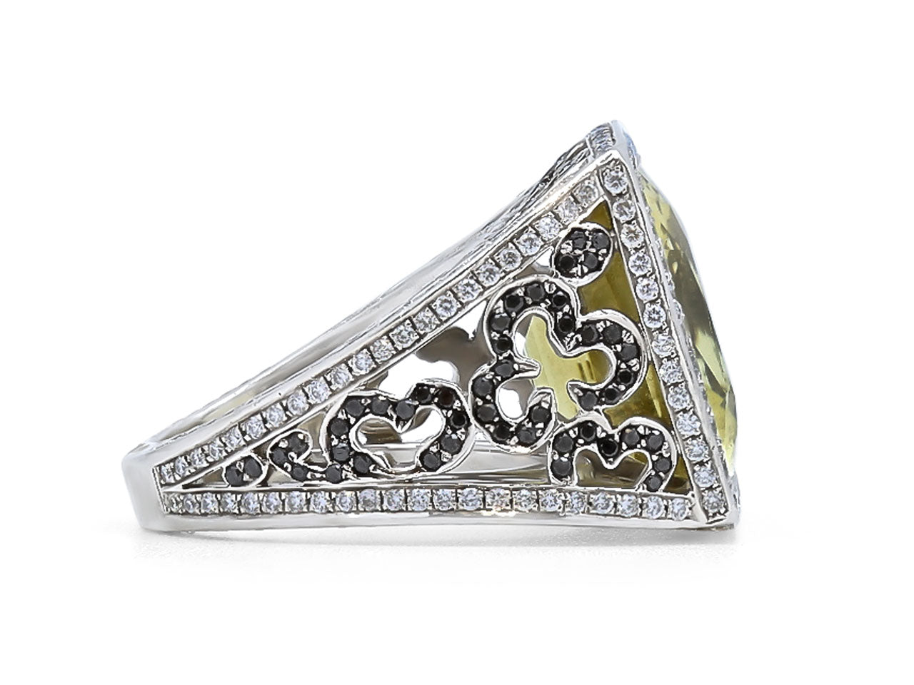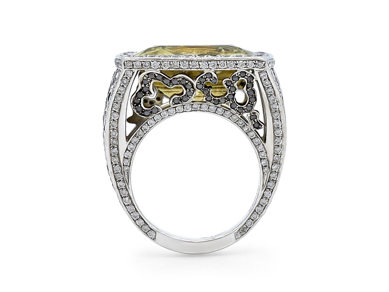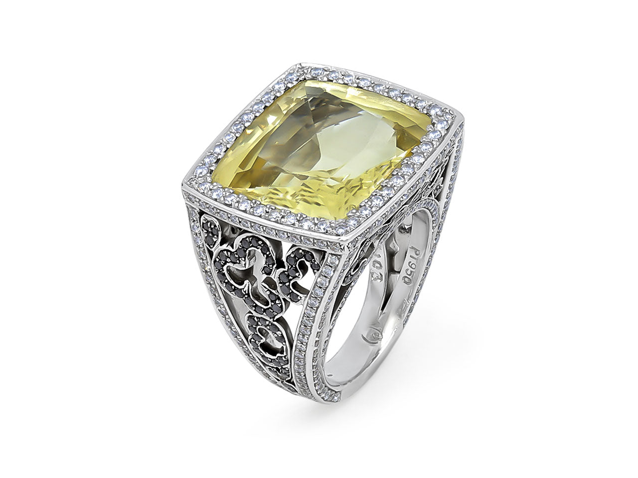 A vibrant cushion-cut danburite of 15.21 carats set in a platinum ring surrounded in a halo and along the shank by colorless diamonds of 1.86 carats and black diamonds of 0.59 carats. Gemresearch Swisslab describes the danburite as Burmese with no evidence of treatment.