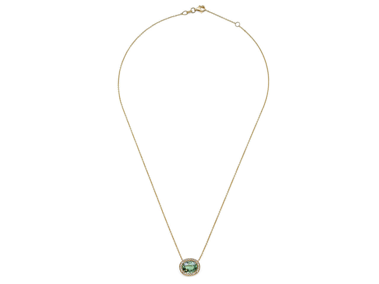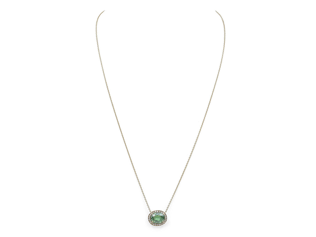 A graceful oval demantoid garnet surrounded by twenty-six round cut diamonds on an 18K yellow gold chain. The Gemological Institute of America (GIA) describes the garnet as having Yellowish-Green color.