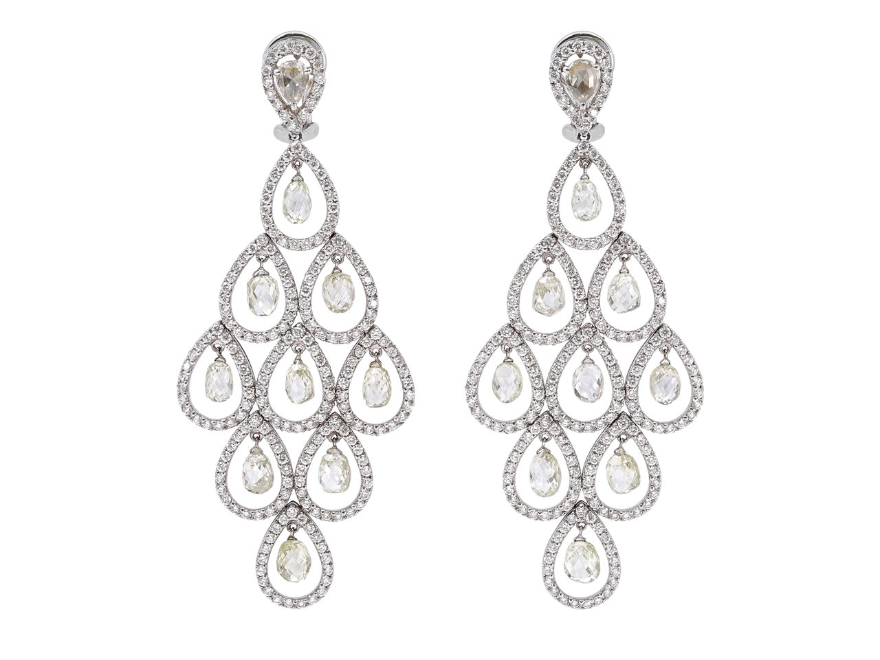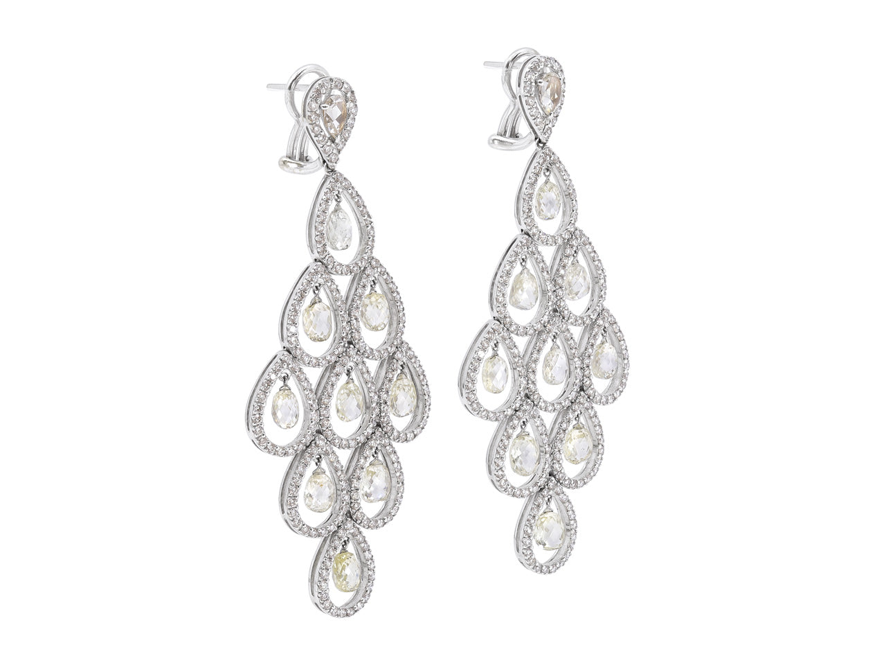 18K white gold chandelier earrings set with eighteen briolette diamonds, two pear shape diamonds, and three-hundred seventy-nine round diamonds.