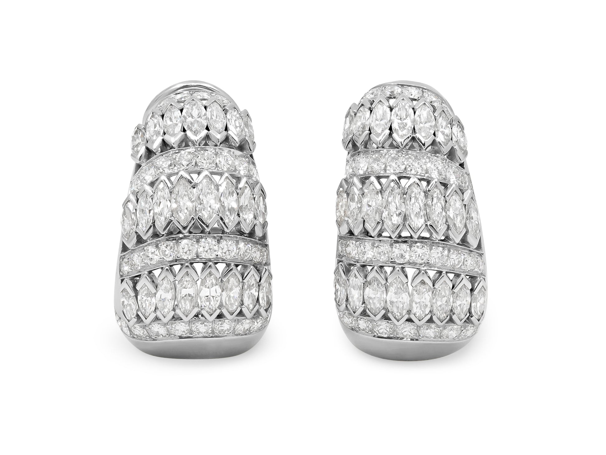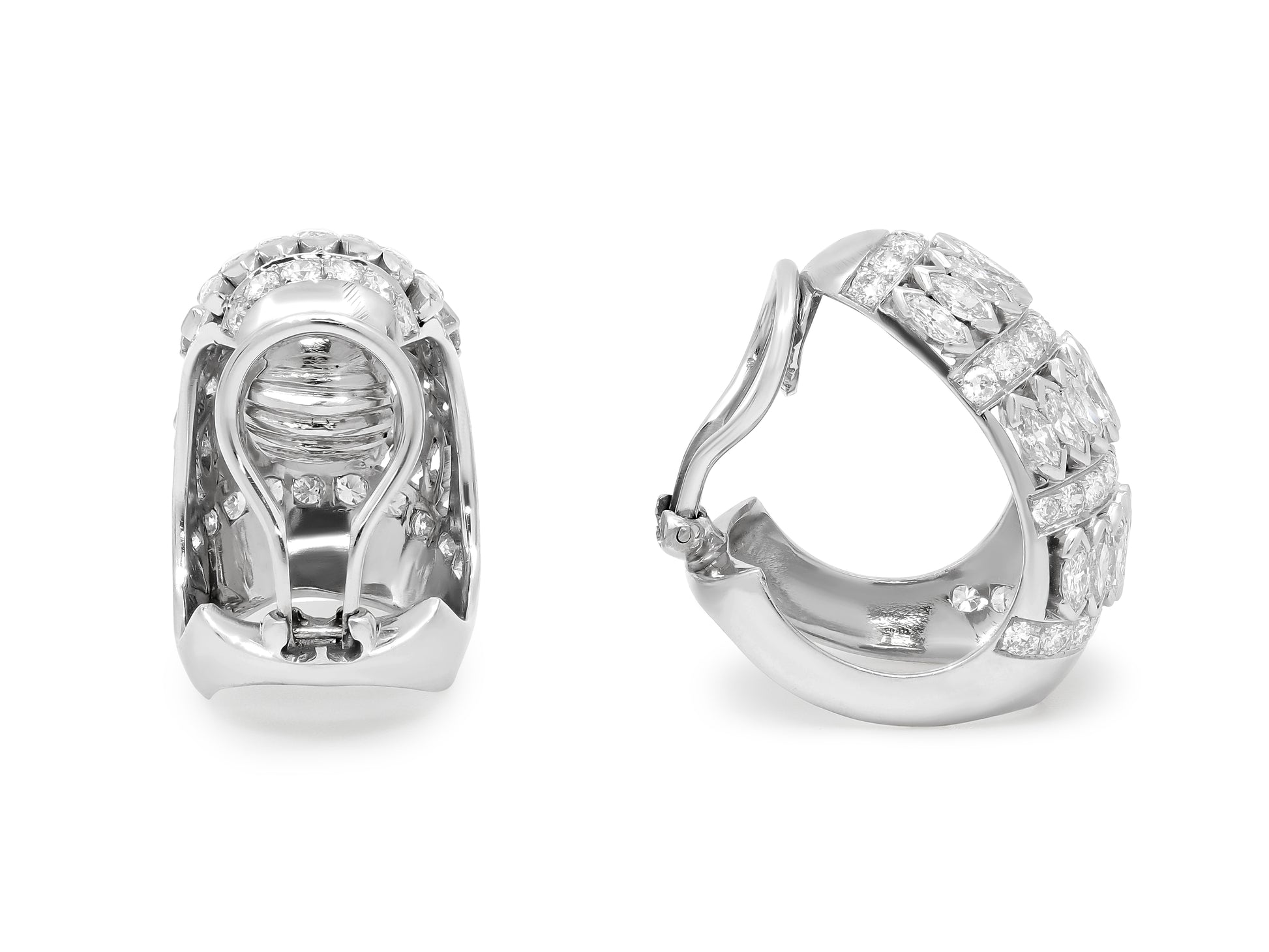 A pair of 18K white gold ear clips set with sixty-eight round diamonds and forty-six marquise diamonds.