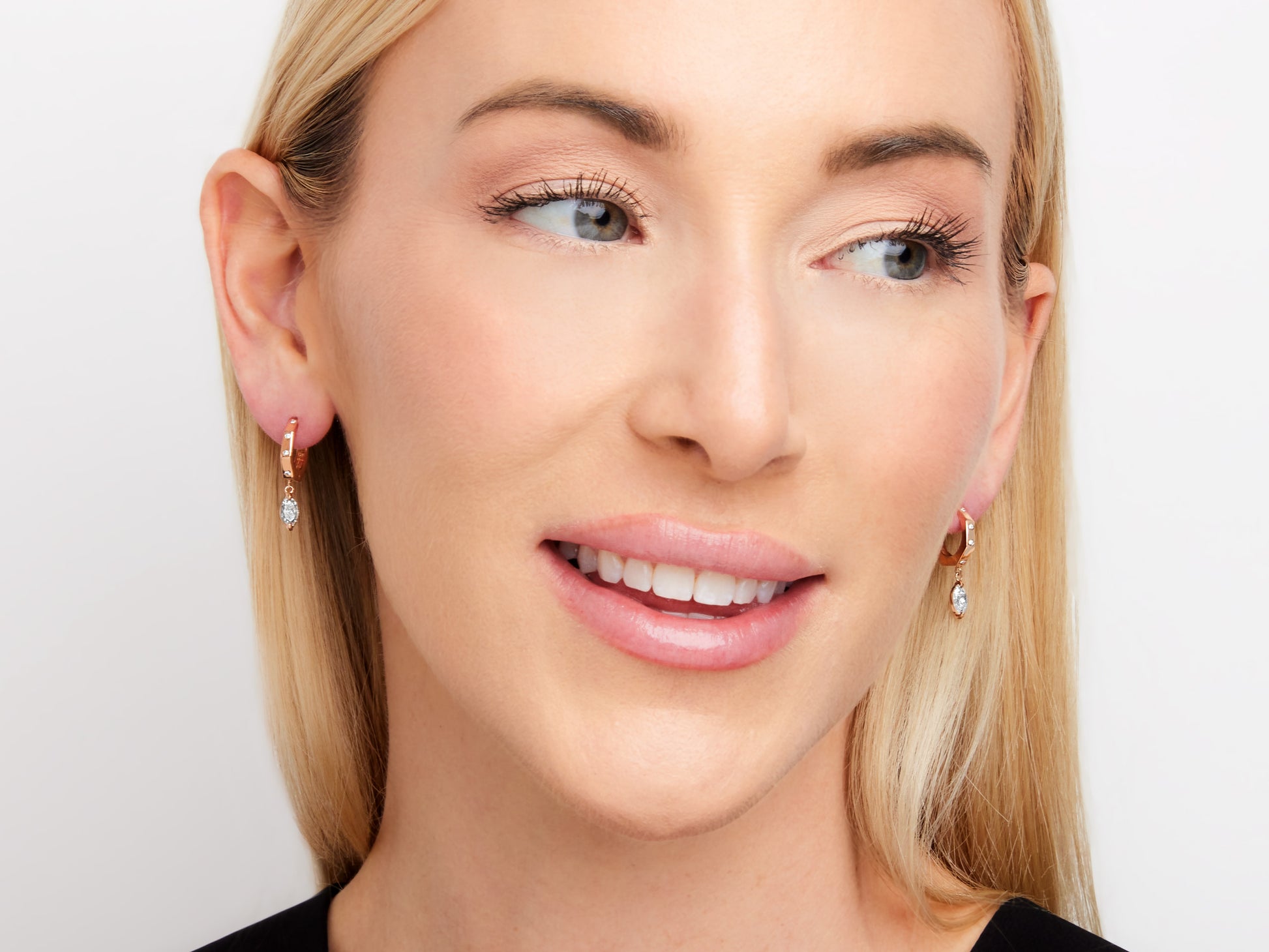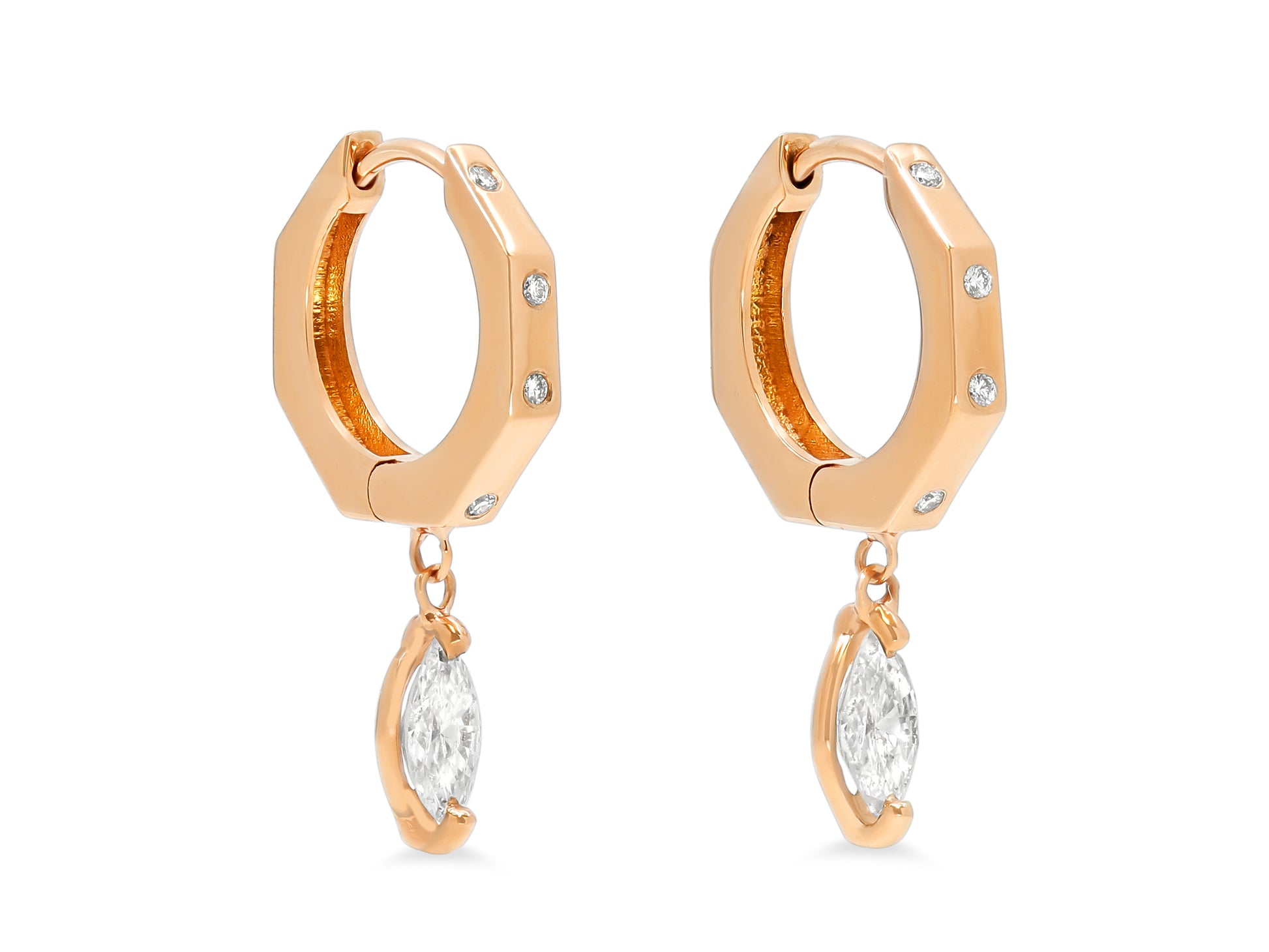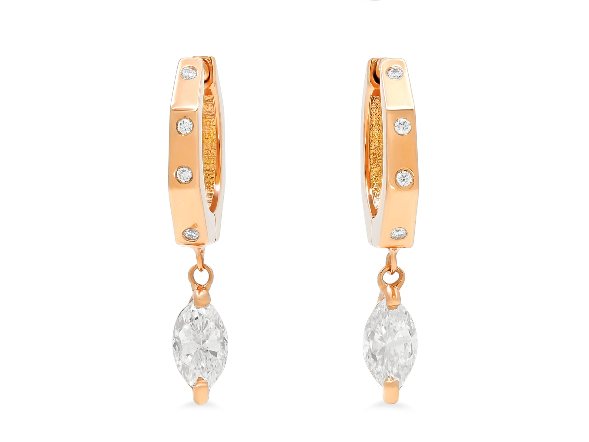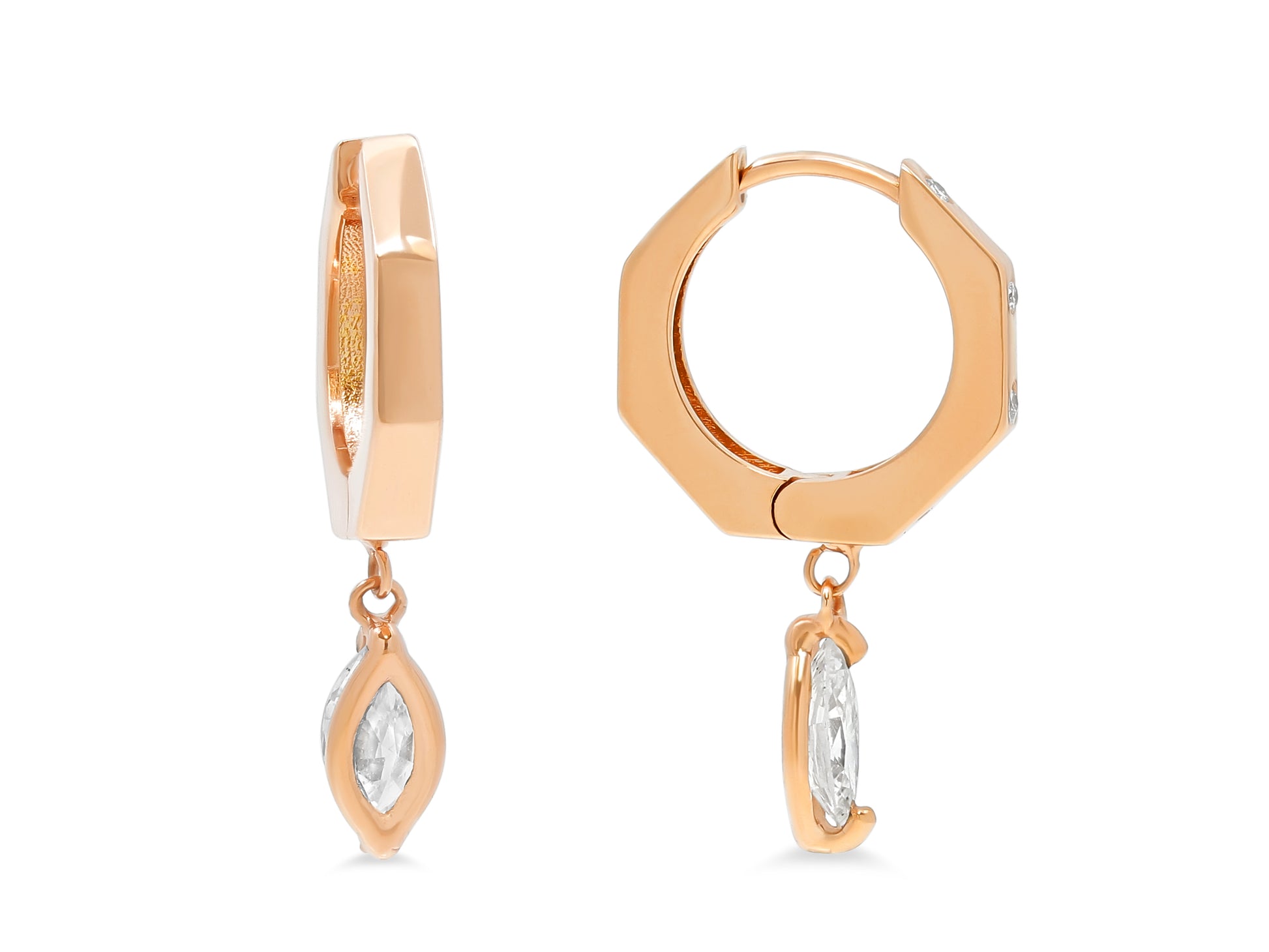 A pair of geometric 16K red gold huggie earrings set with marquise diamond drops.