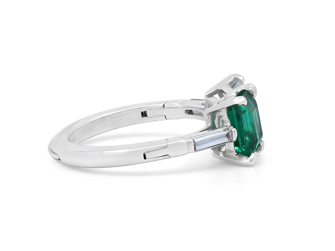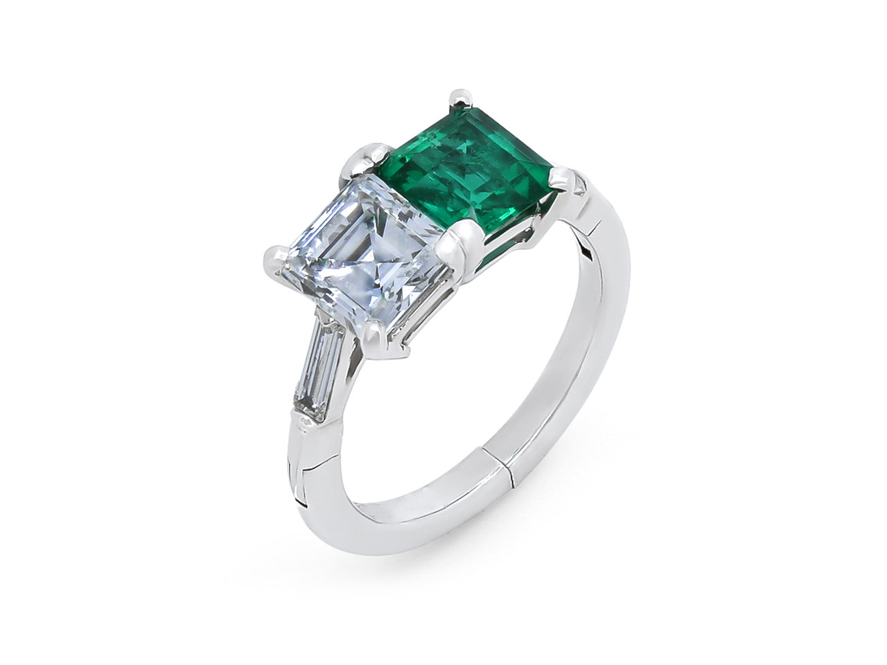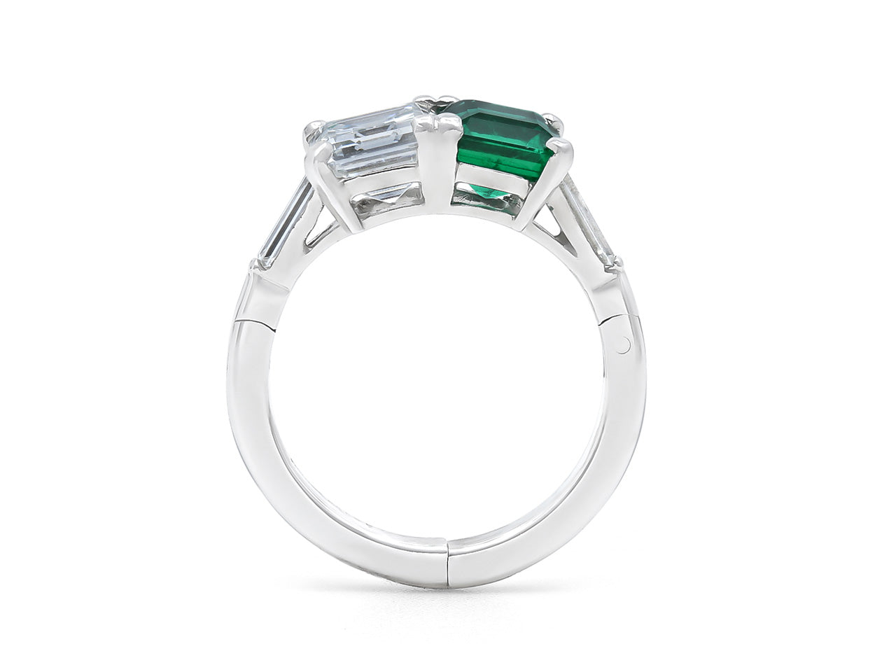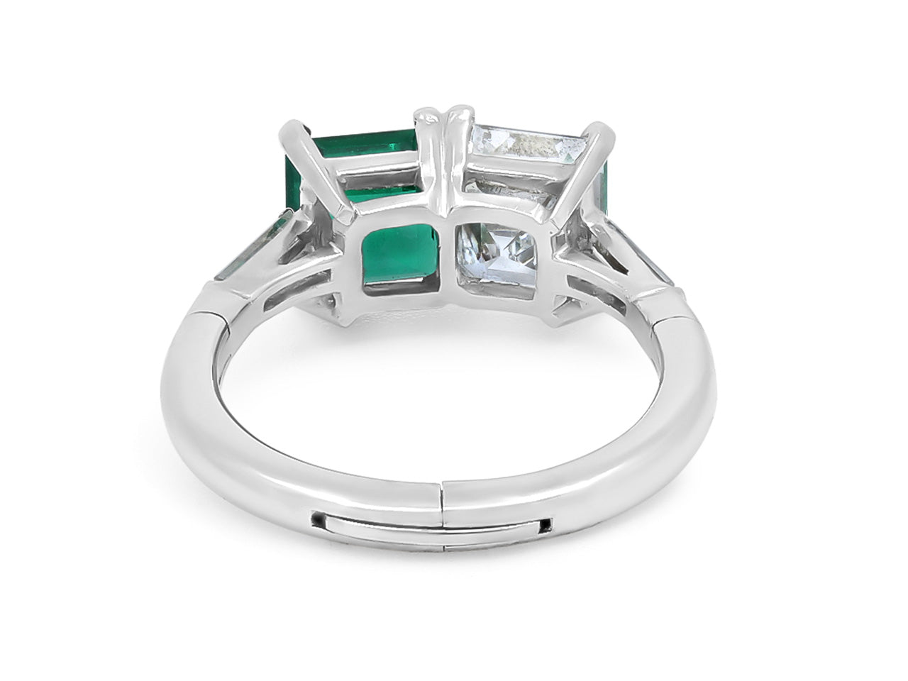 An elegant platinum ring set with an emerald-cut diamond of 1.66 carats twinned with an step-cut emerald of 1.29 carats. The Gemological Institute of America (GIA) describes the diamond as having D color and VVS2 clarity; describes the emerald as having Colombian origin with FI, minor clarity enhancement.