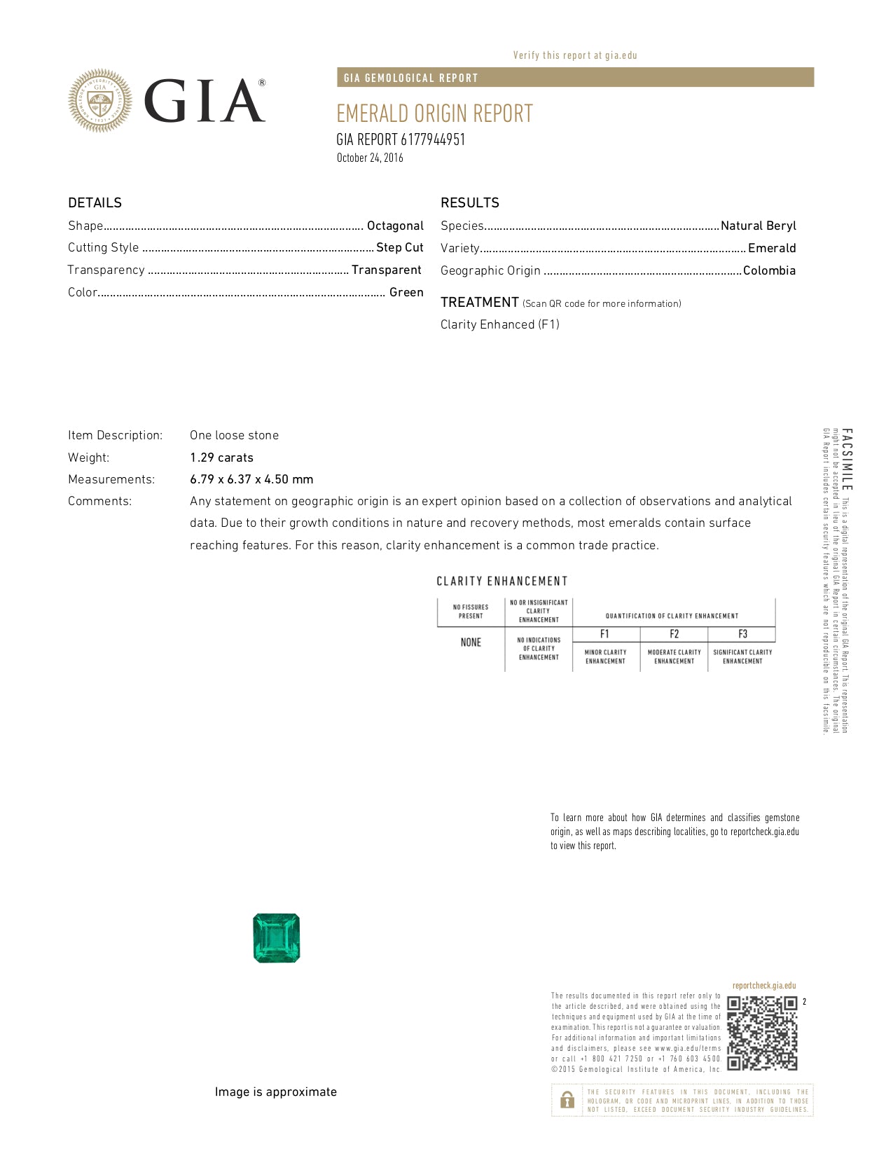 Gemstone: Emerald: 1.29 carats. GIA Report #6177944951