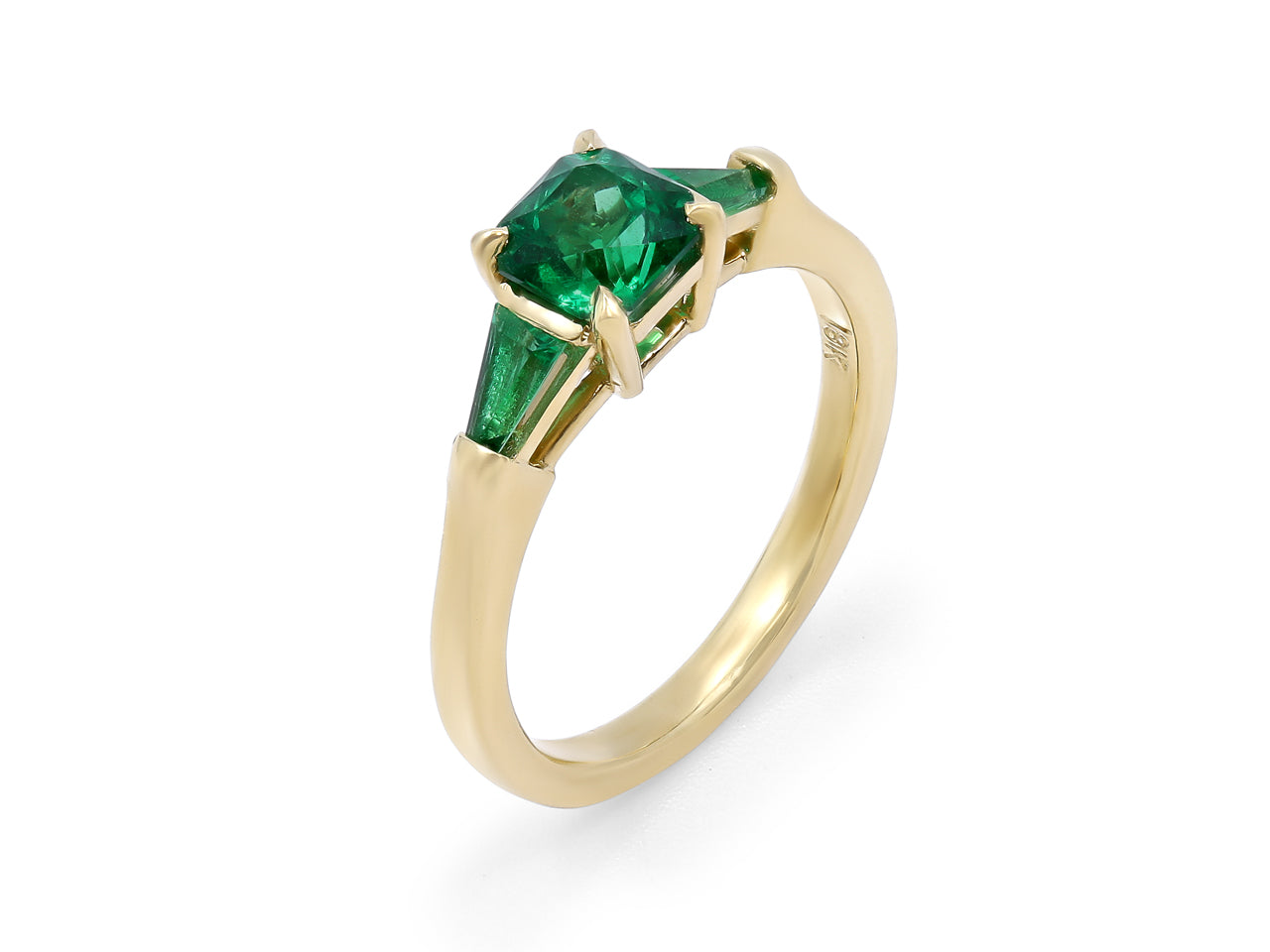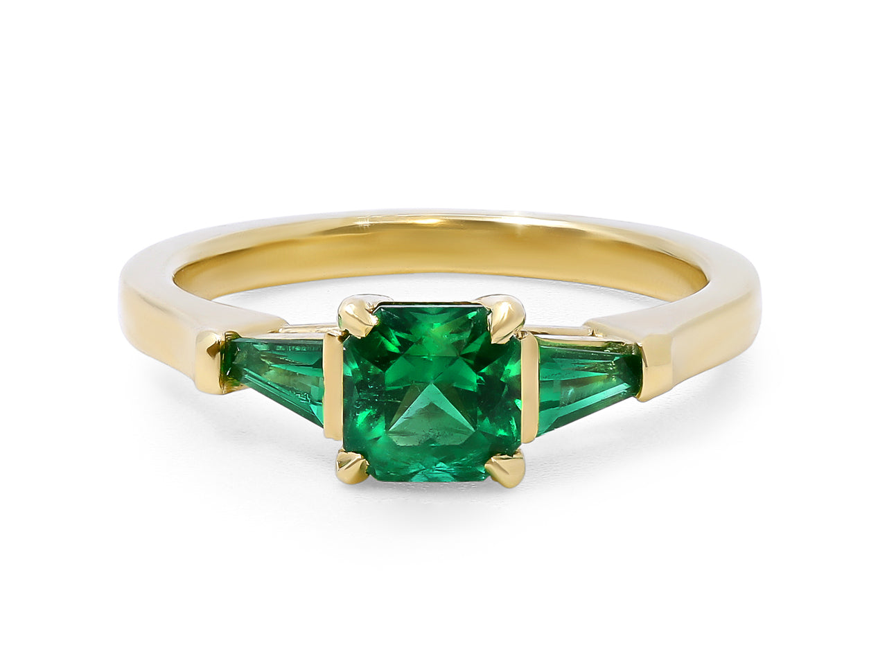 A dainty 18K yellow gold ring set with one cushion cut emerald and two tapered baguette emerald side stones.