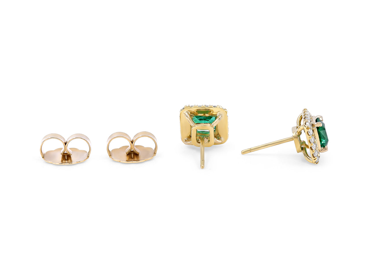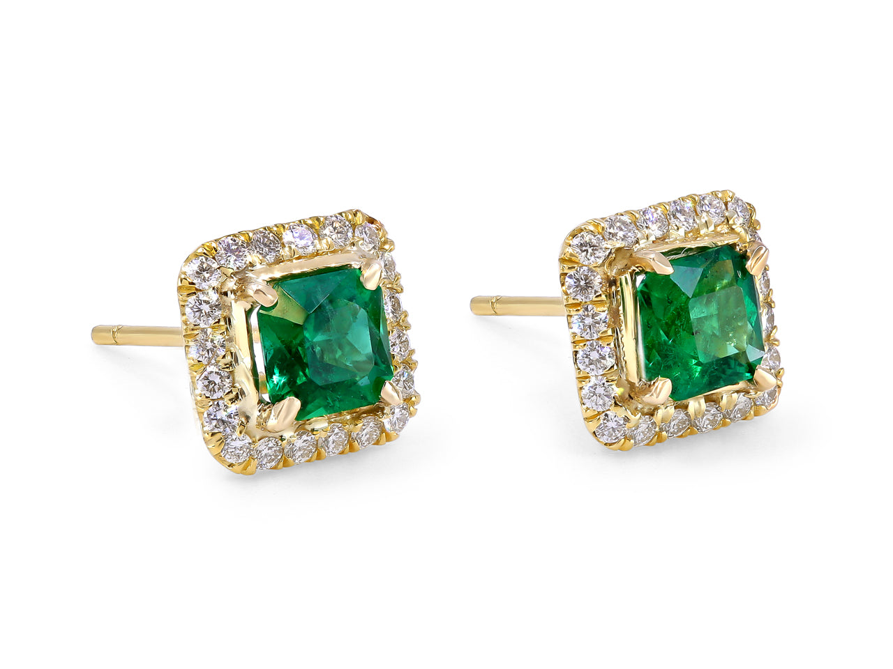 A vibrant pair of emeralds surrounded by 40 round brilliant diamonds, set in 14K yellow gold.