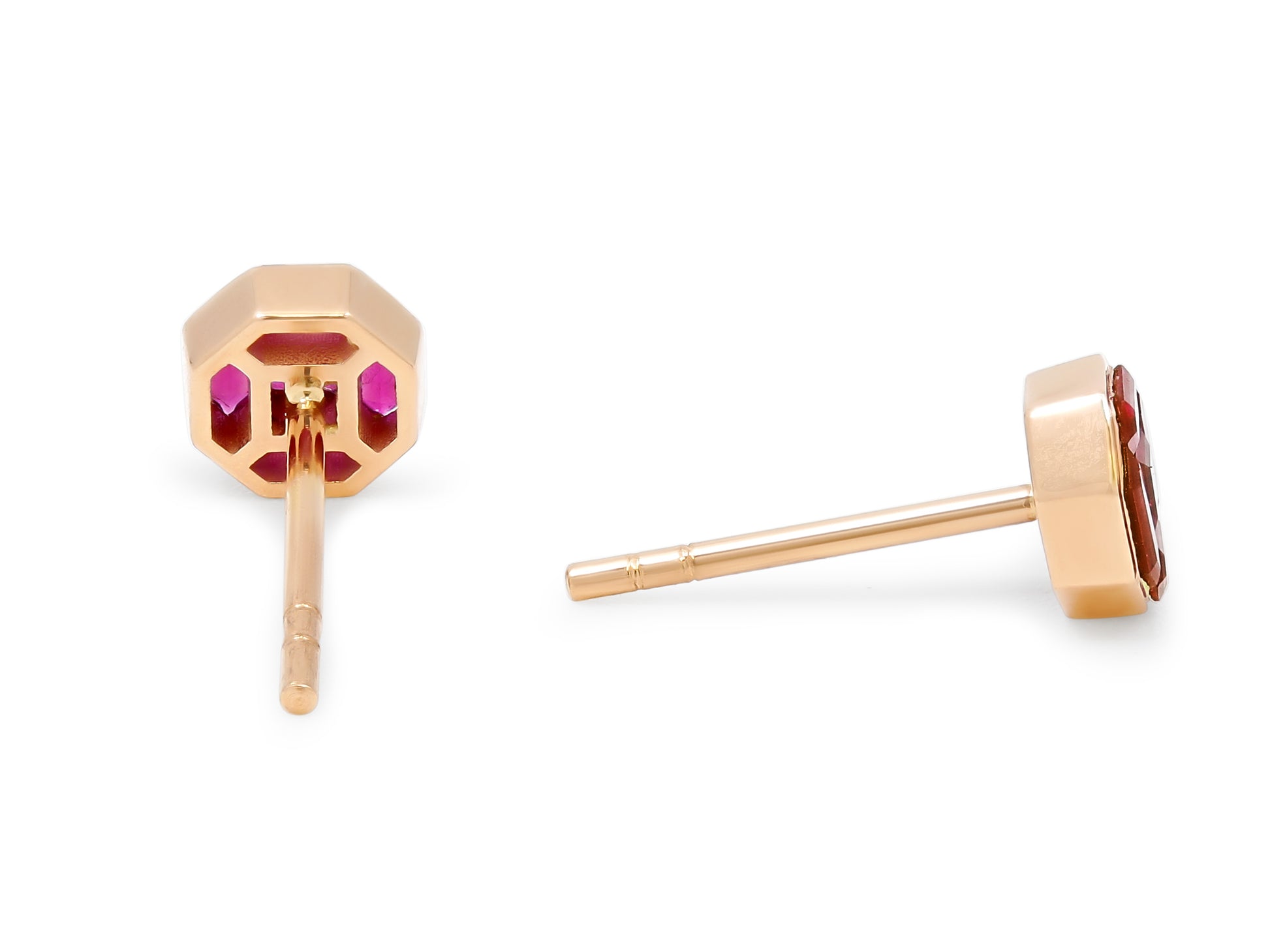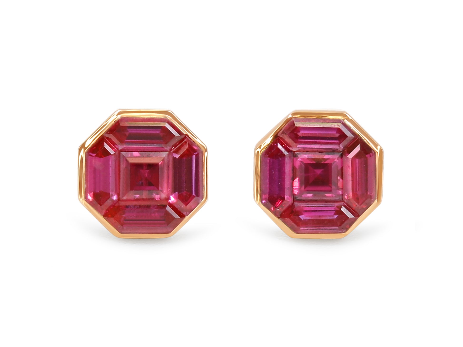 16K red gold studs set with illusion cut rubies, cut to fit perfectly together.