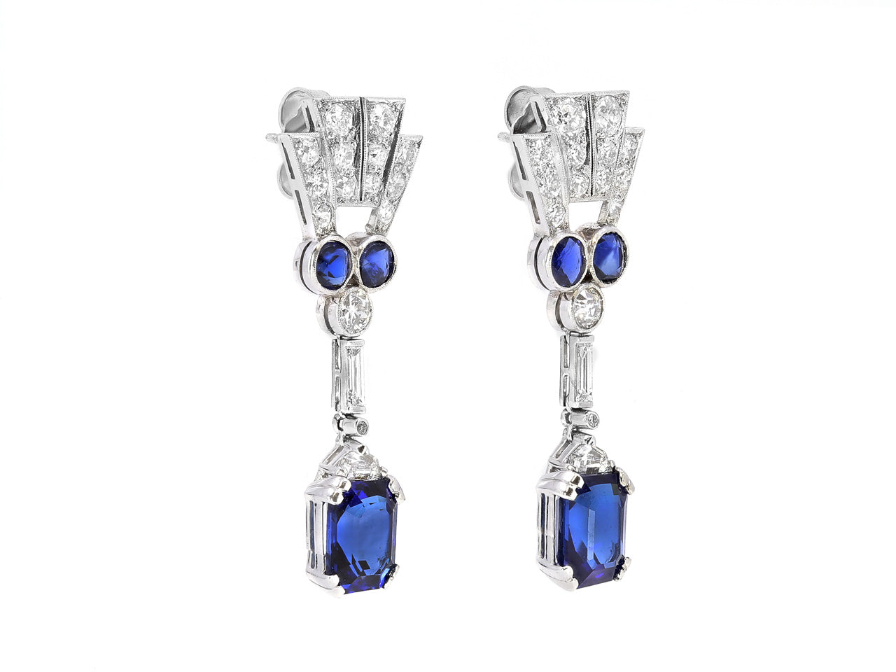 Platinum earrings set with two emerald cut sapphires, two round sapphires, and round brilliant and baguette diamonds. GRA Laboratories describes the 3.93 carat sapphire as having Madagascar origin, Royal Blue color, and indications of heat treatment; describes the 4.46 carat sapphire as having Madagascar origin, Royal Blue color, and no indications of heat treatment.