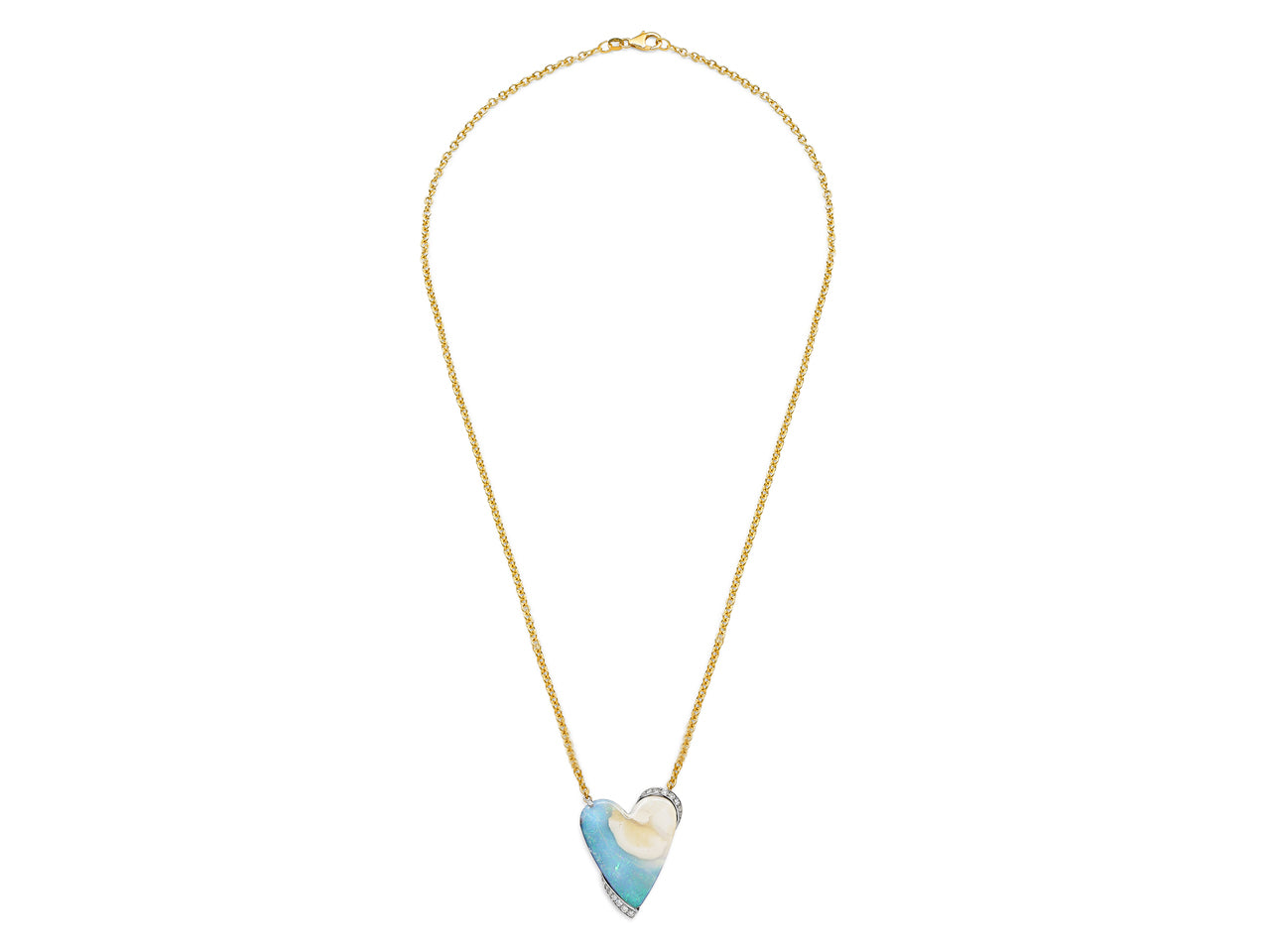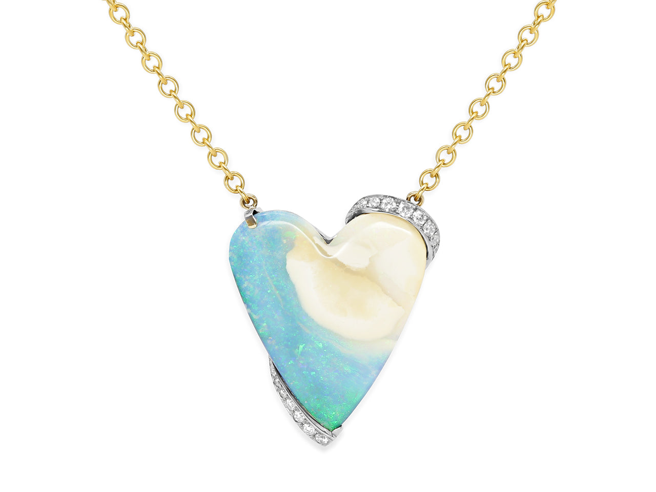 A heart shape opal pendant set with diamonds on a yellow gold chain.