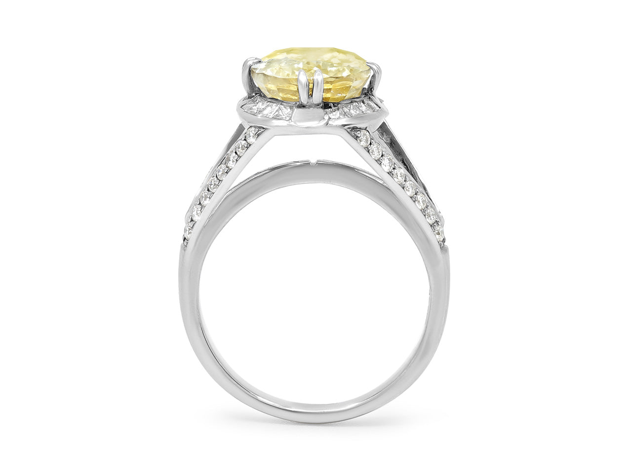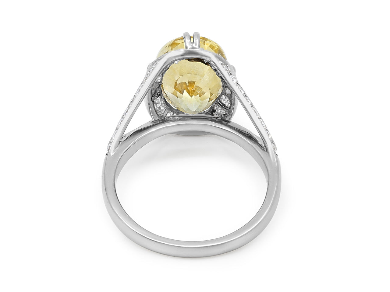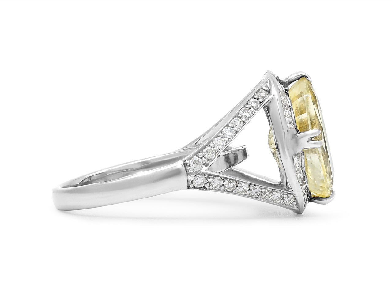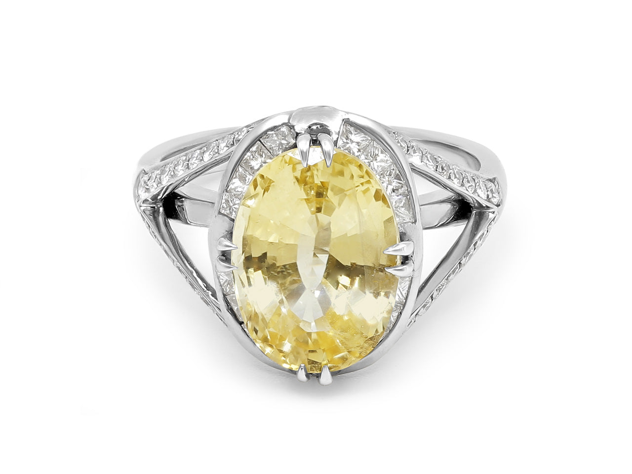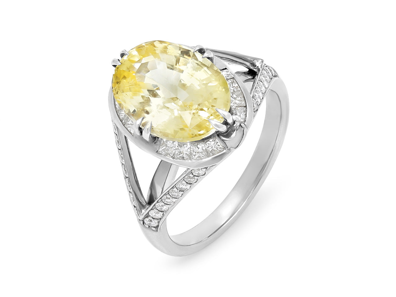 Platinum ring set with an oval yellow sapphire set on a split shank mounting with round brilliant diamonds.
