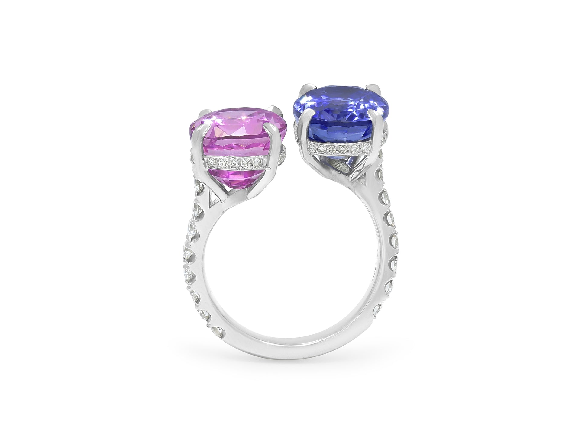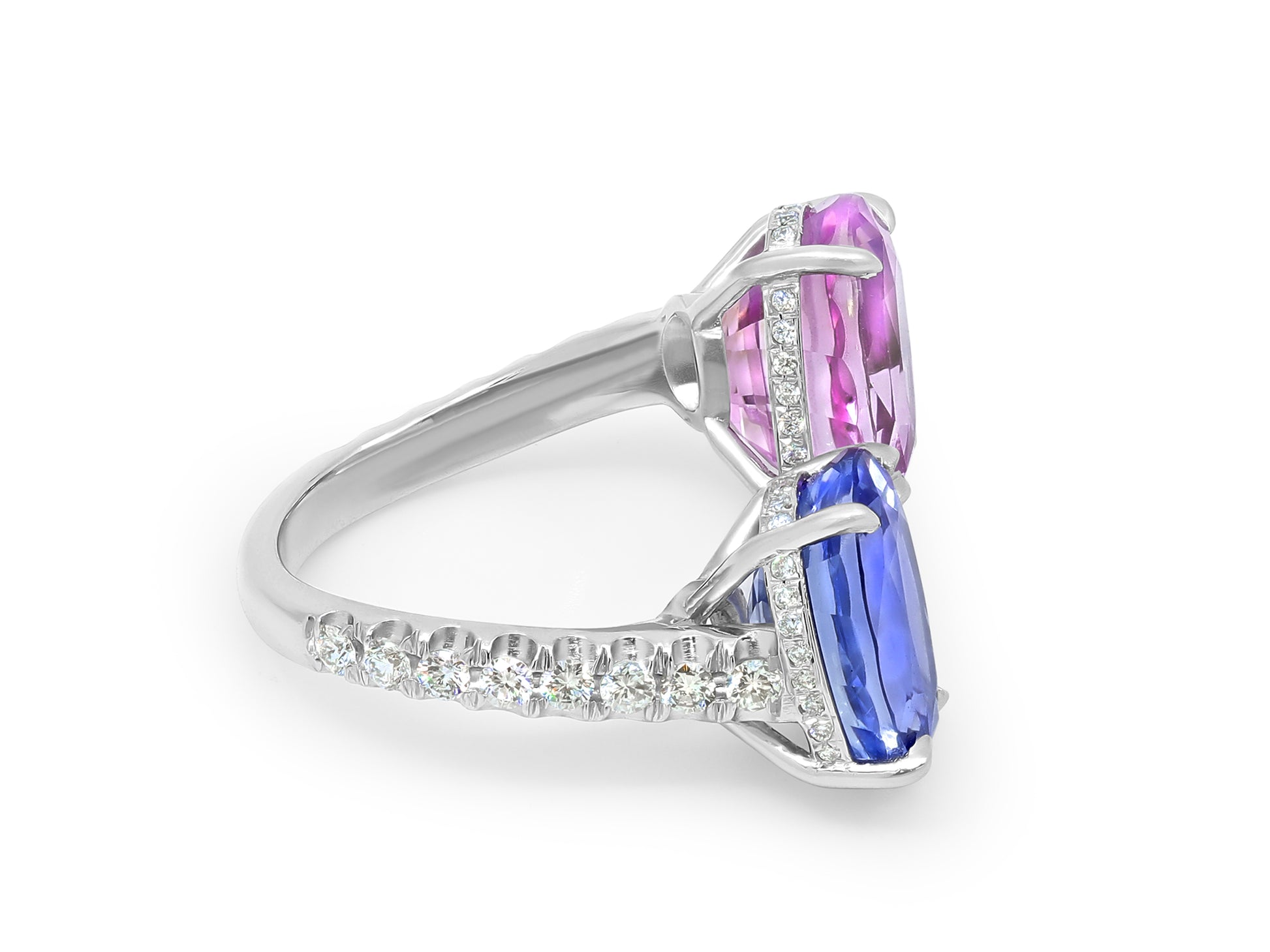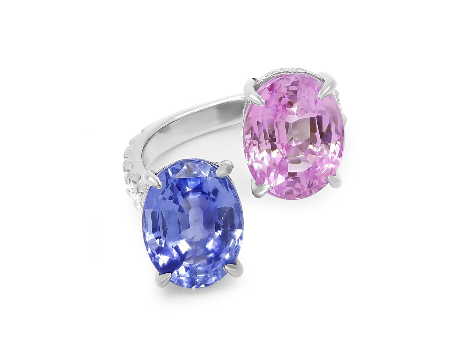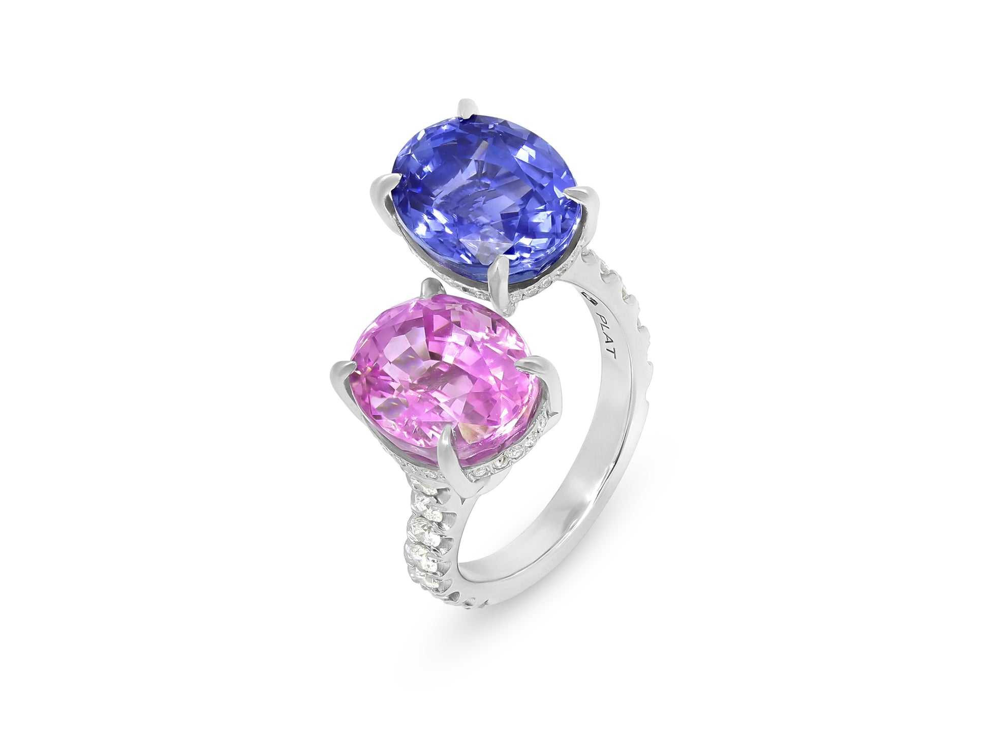 Platinum bypass ring set with an oval-cut pink sapphire of 8.02 carats, an oval-cut blue sapphire of 7.05 carats, and diamonds on the shank. The American Gemological Laboratories (AGL) describe the pink sapphire as having no gemological evidence of heat; and the blue sapphire as having no gemological evidence of heat.