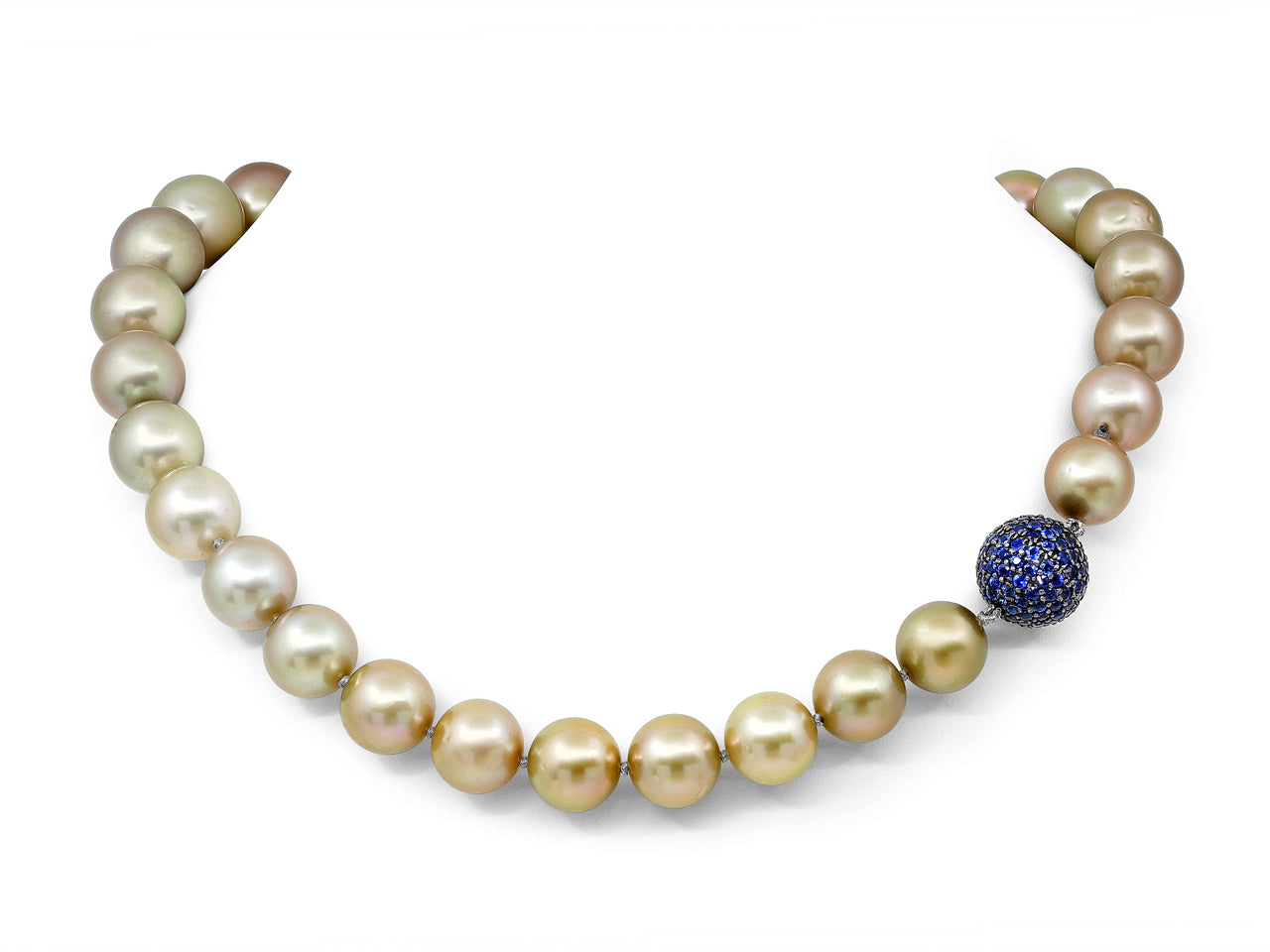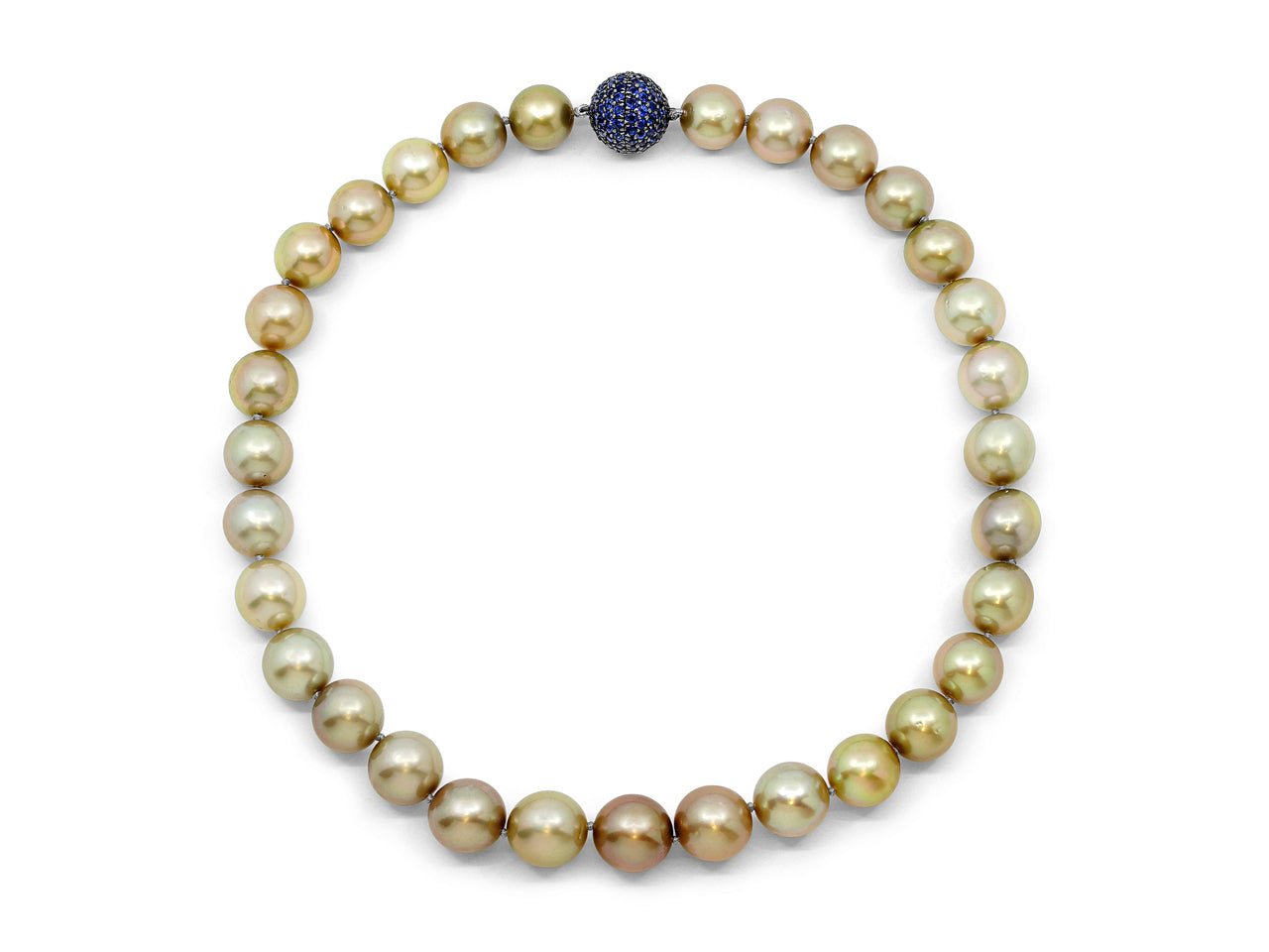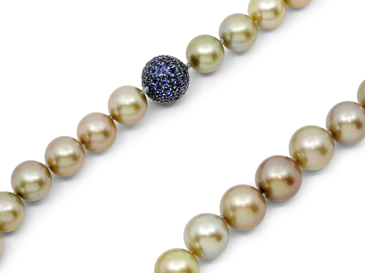 Pistachio South Sea Pearl Necklace with a Sapphire Ball Clasp in 18K White Gold