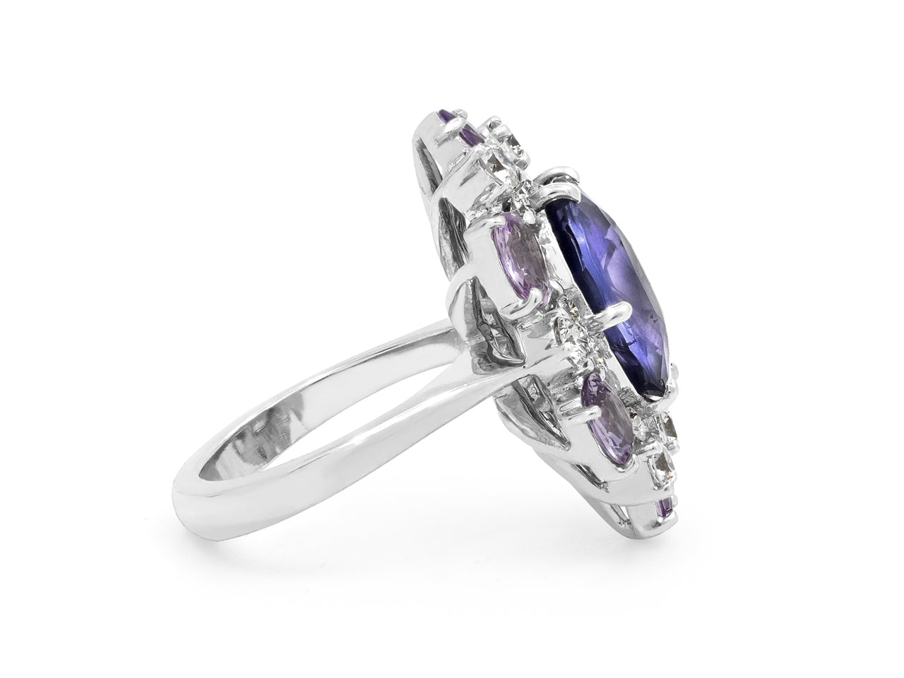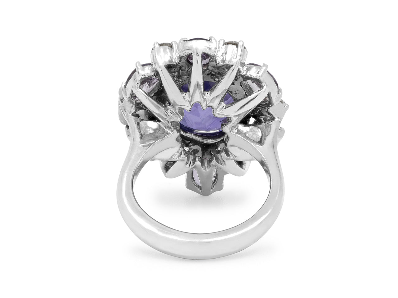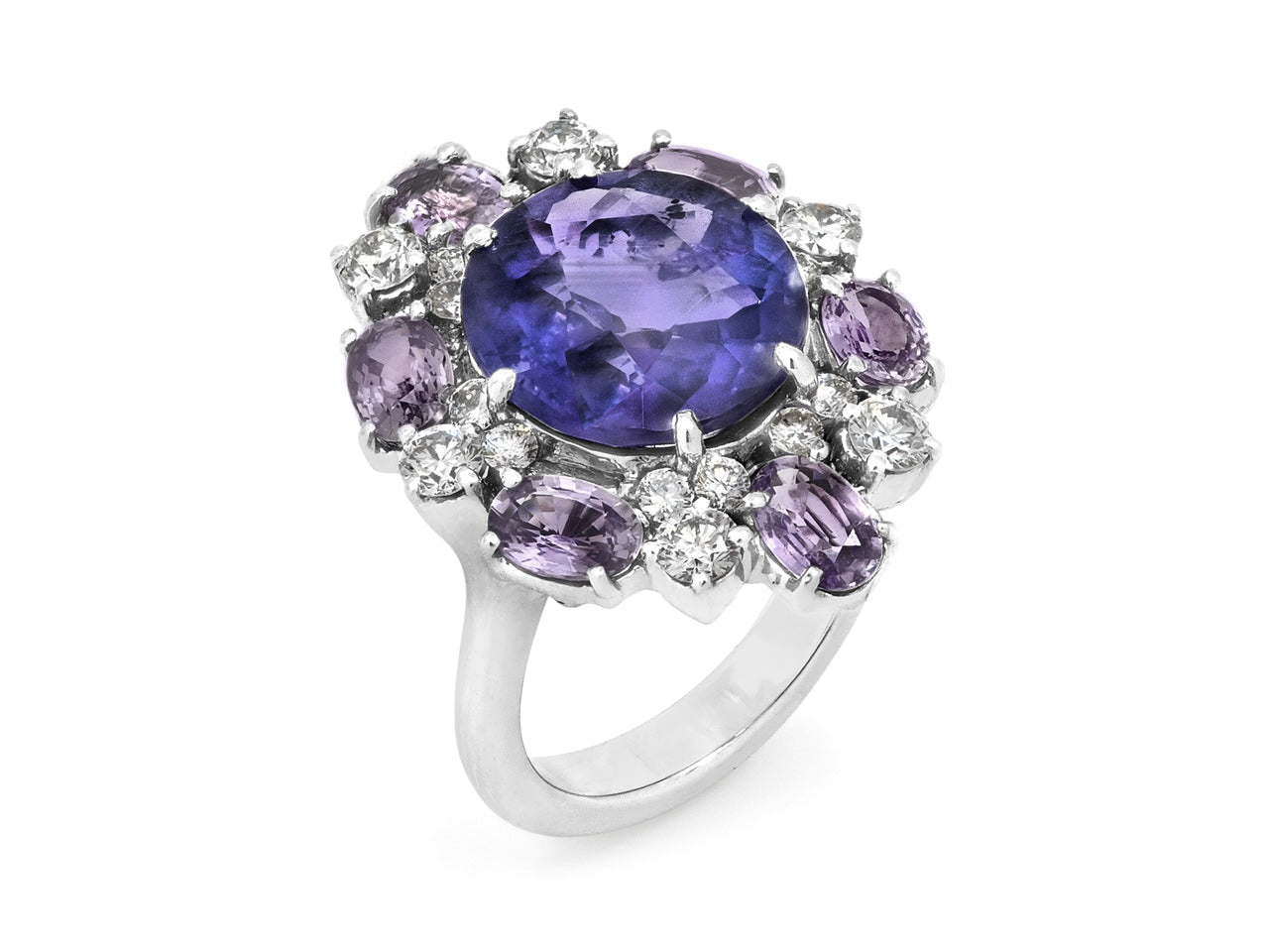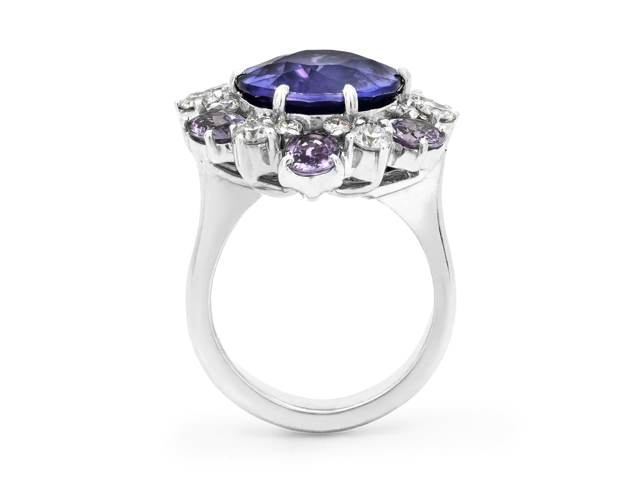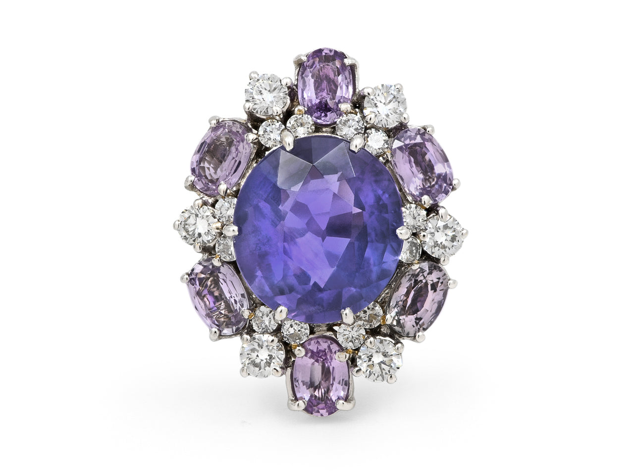 A round purple sapphire set with six oval purple sapphires and round diamonds on a platinum shank.