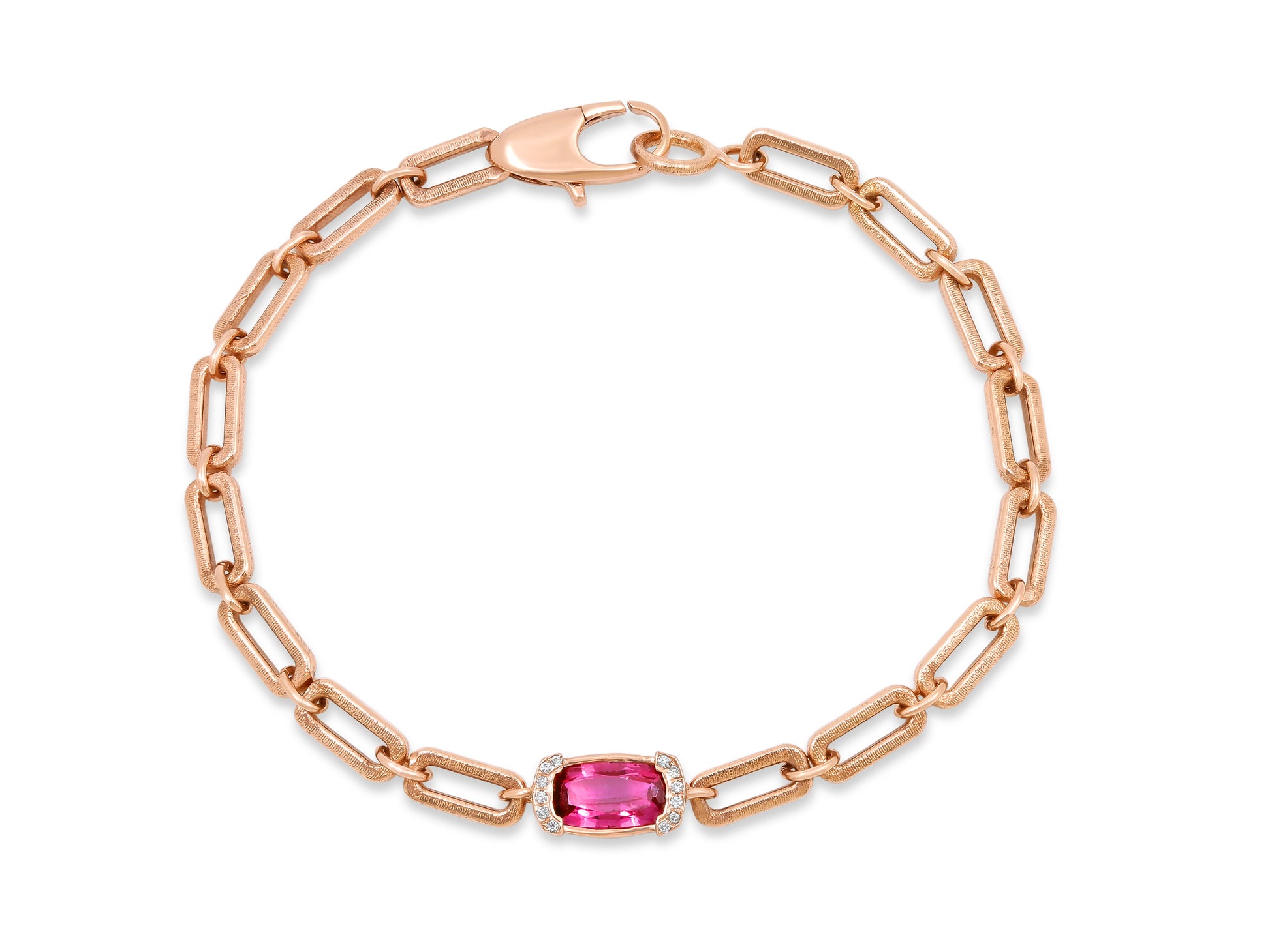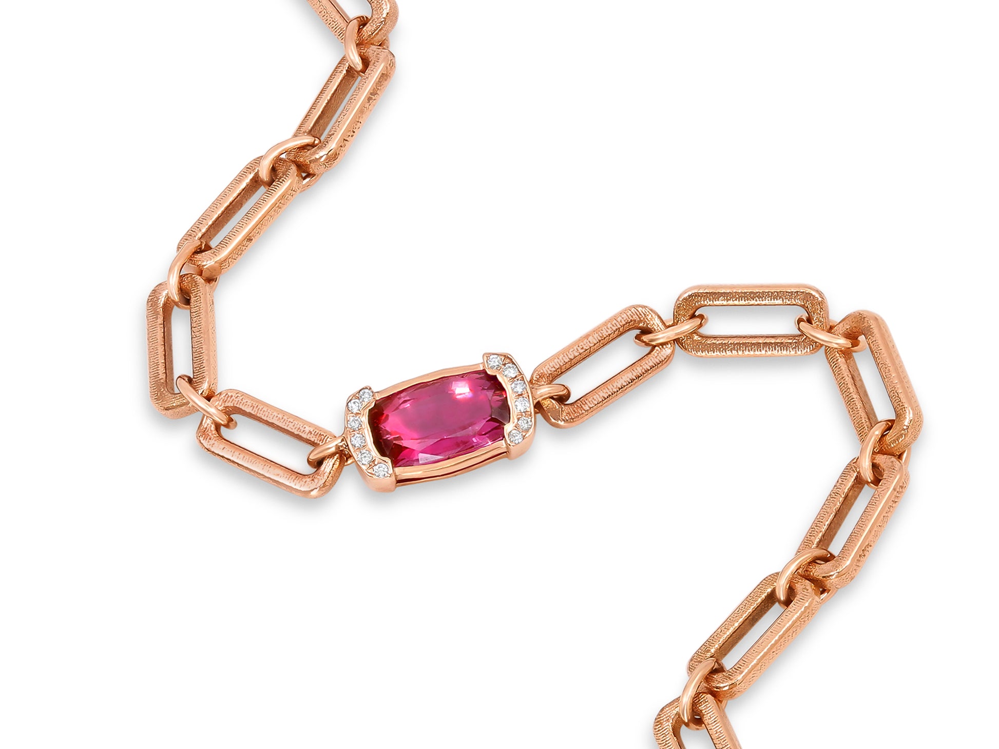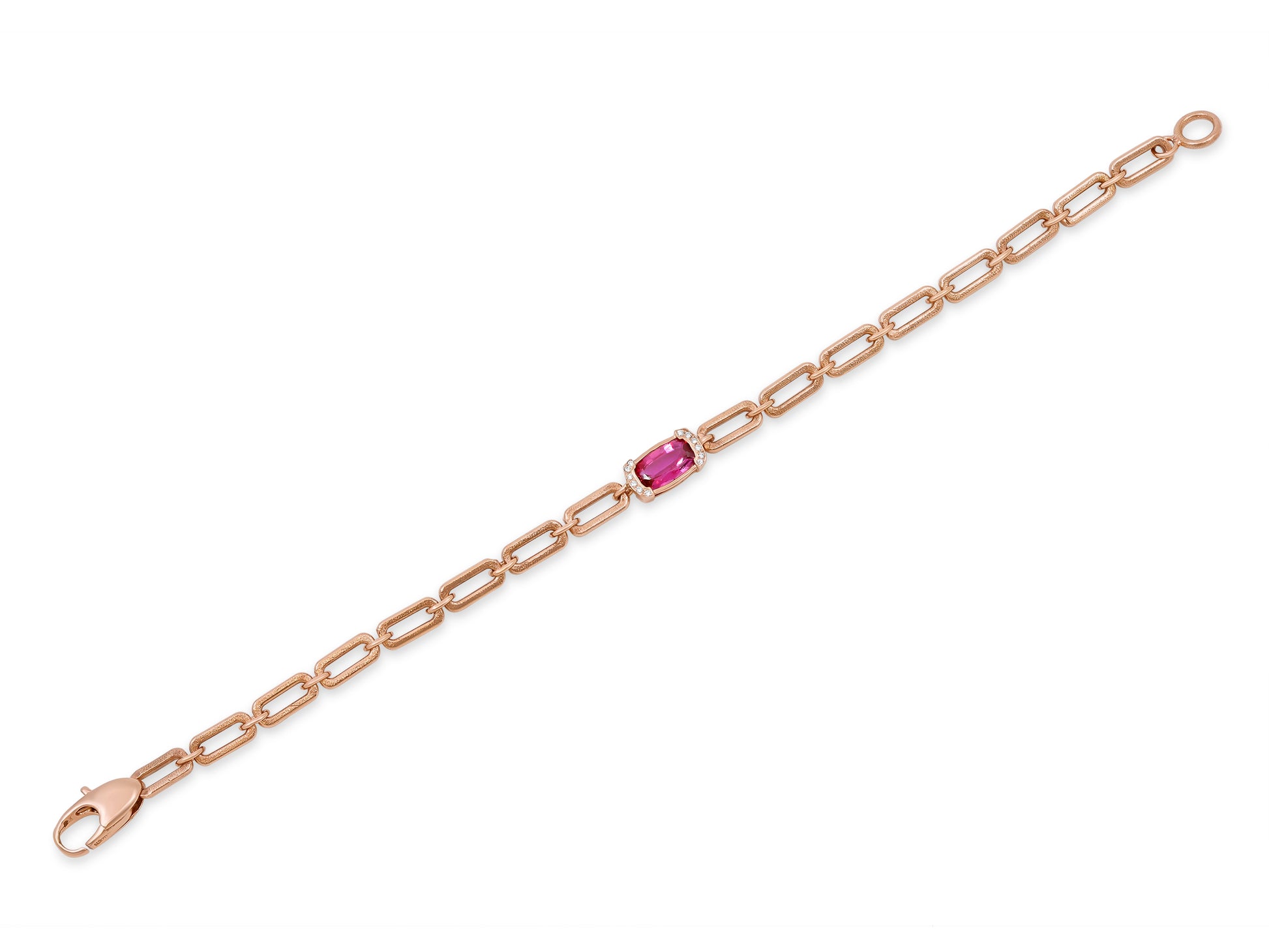 An elongated cushion cut ruby set with diamonds on a handmade 16K red gold textured paperclip bracelet chain. The Gemological Institute of America (GIA) describes the ruby as natural with no indication of heating.