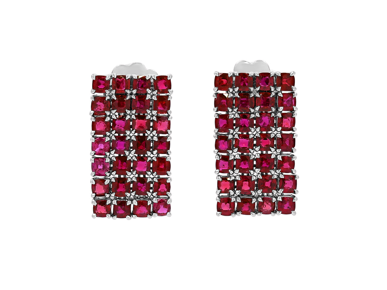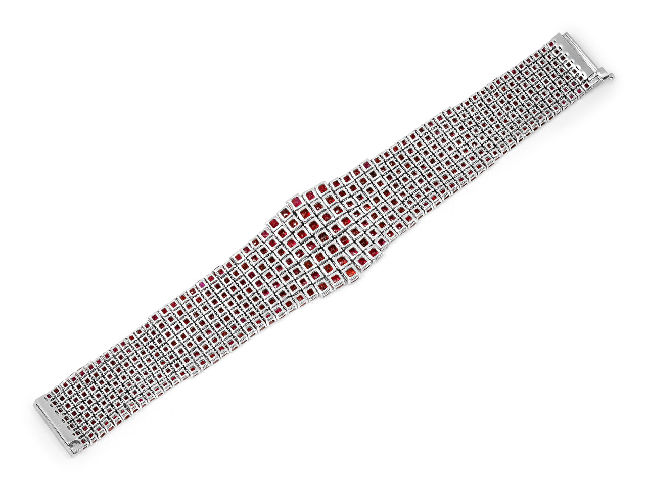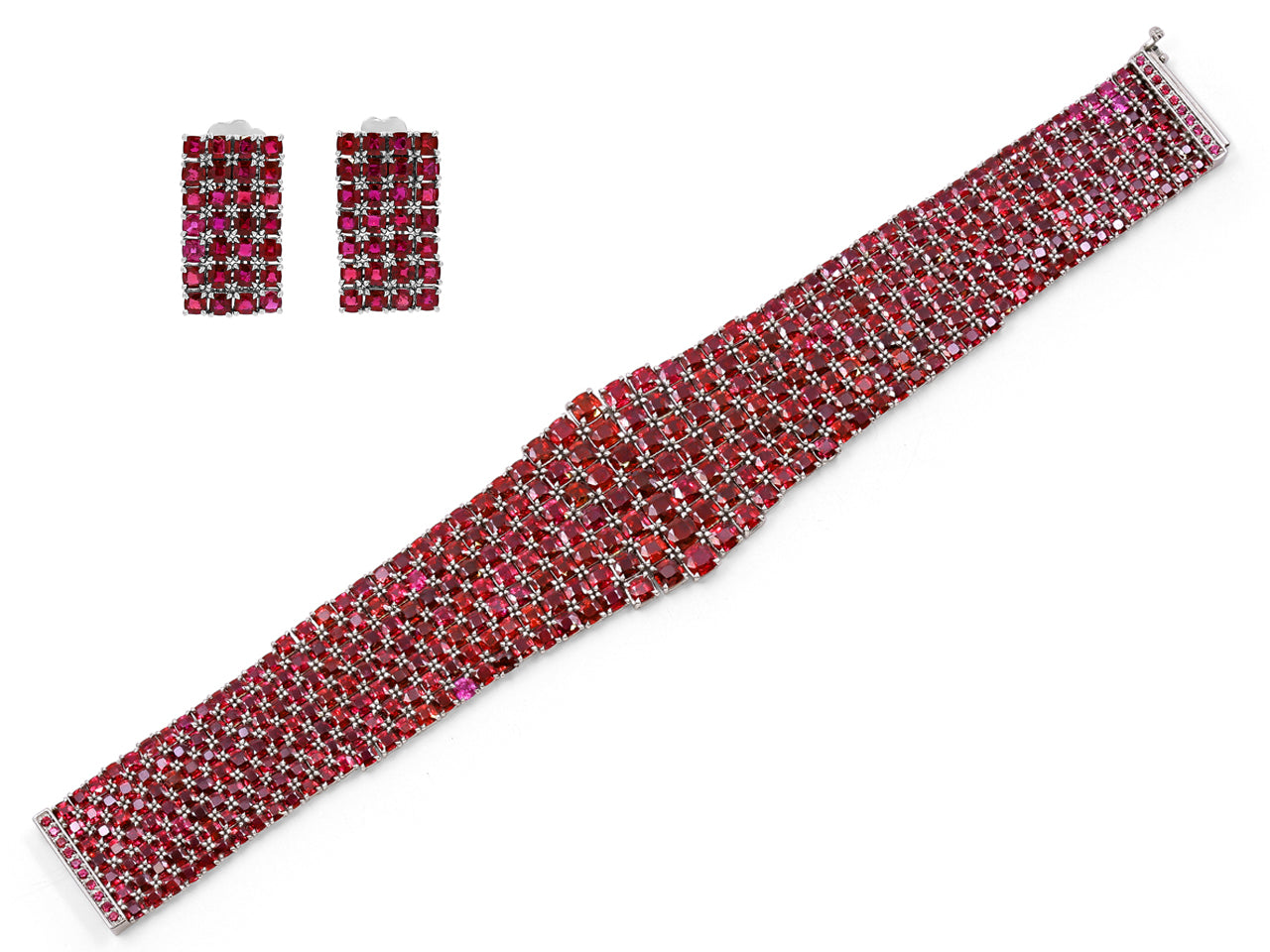 A flexible platinum bracelet set with four hundred and nineteen rubies weighing 62.85 carats total. Matching platinum earrings set with fifty six rubies weighing 5.48 carats total. The rubies are Mozambique, with no evidence of heat enhancement.