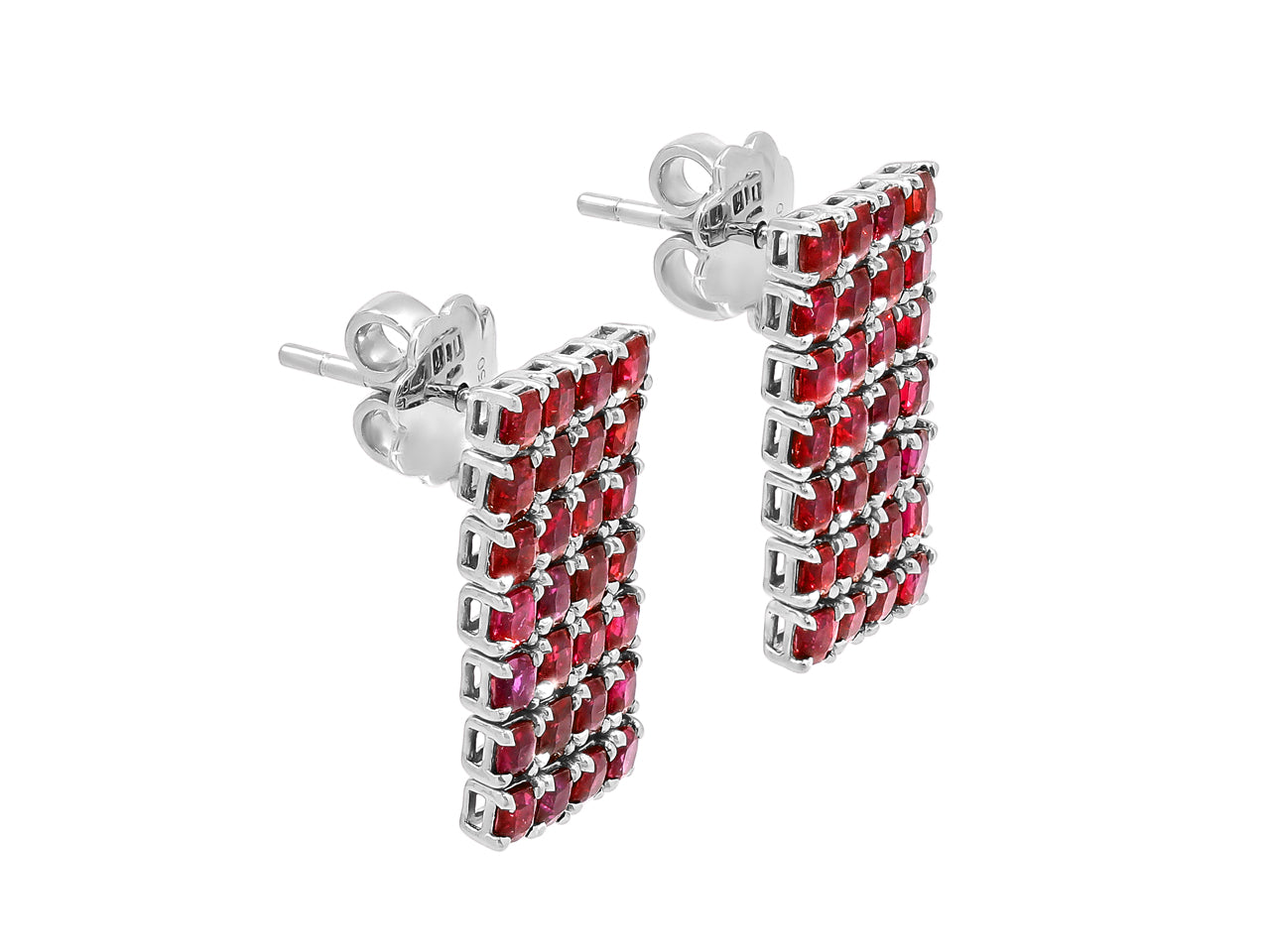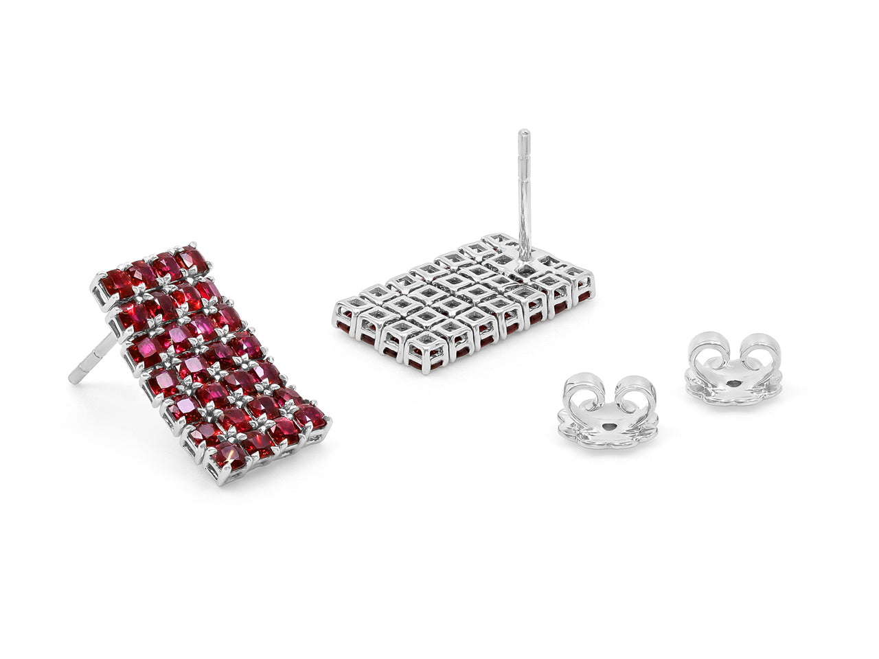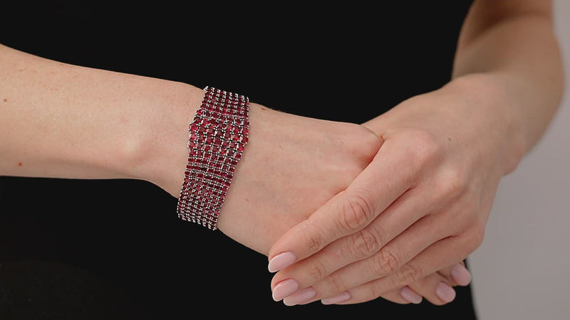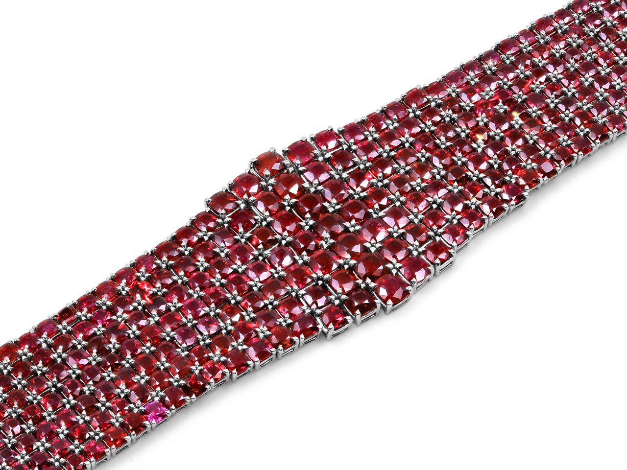 A flexible platinum bracelet set with four hundred and nineteen rubies weighing 62.85 carats total. Matching platinum earrings set with fifty six rubies weighing 5.48 carats total. The rubies are Mozambique, with no evidence of heat enhancement.