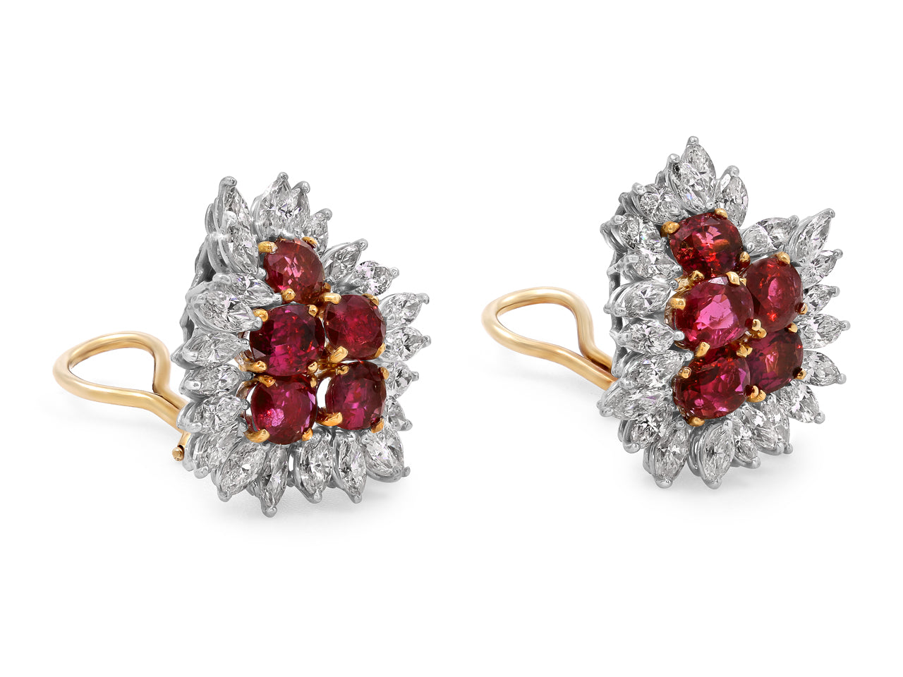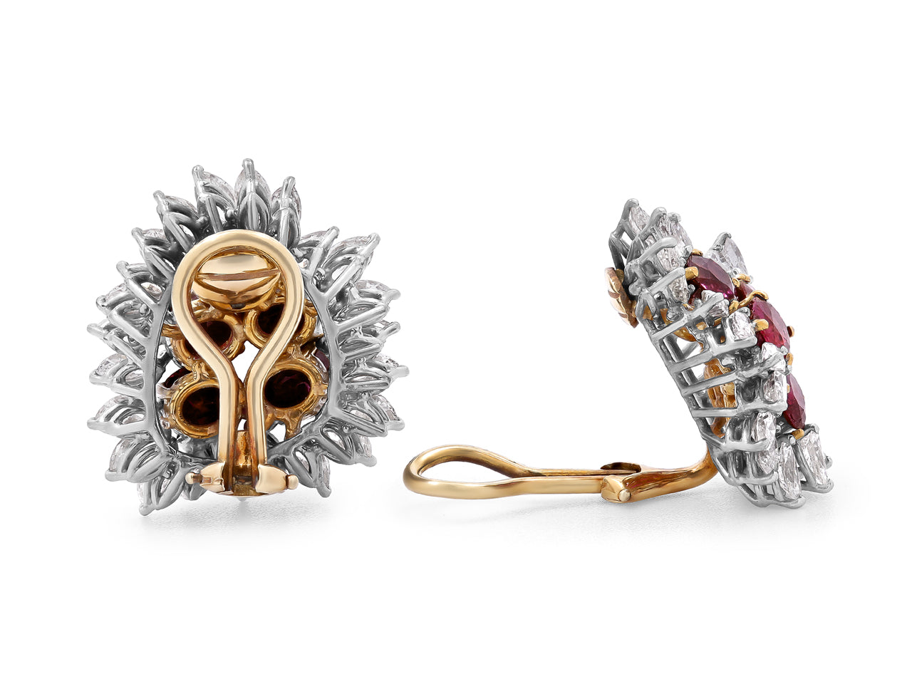 A gorgeous pair of earring clips with ten oval rubies prong-set in 18K yellow gold, surrounded by forty-six marquise cut diamonds, set in 18K white gold.
