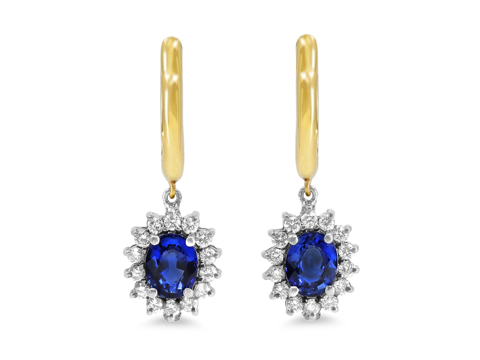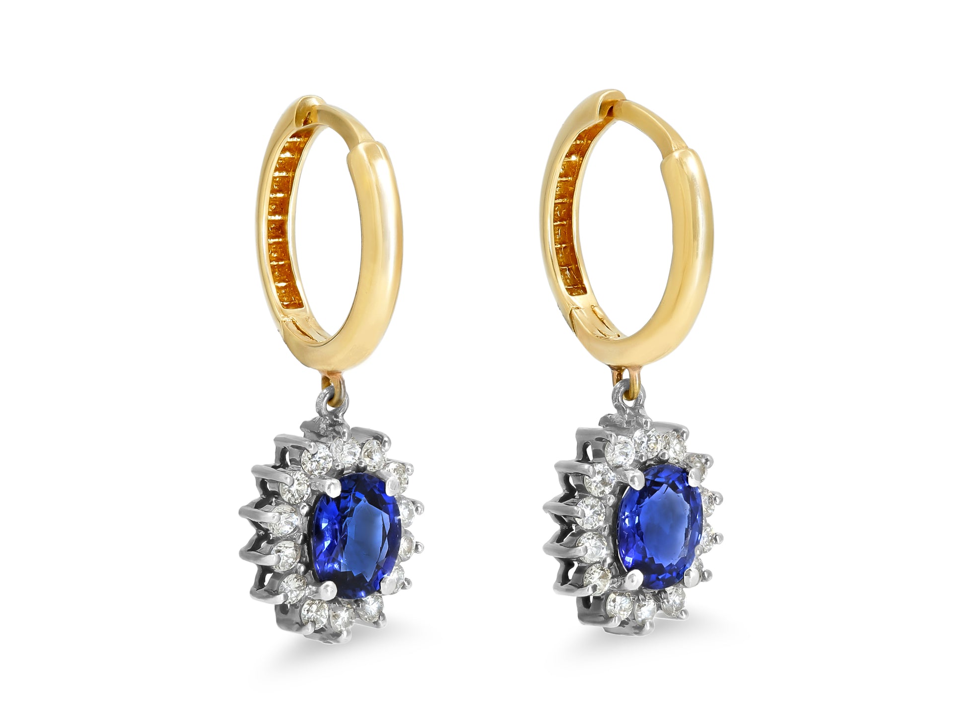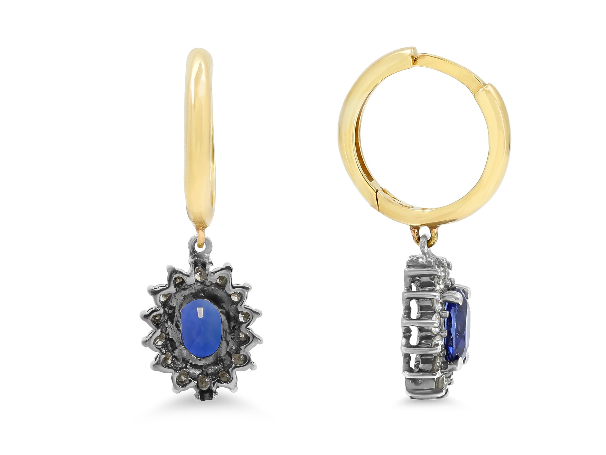 A pair of 14K yellow gold small hoop earrings set with oval sapphire drops, each with a halo of diamonds, set in 14K blackened gold.