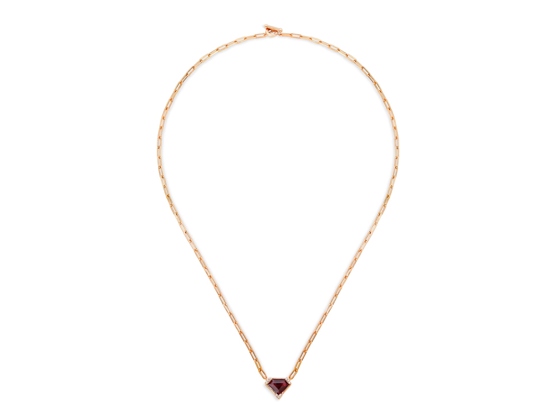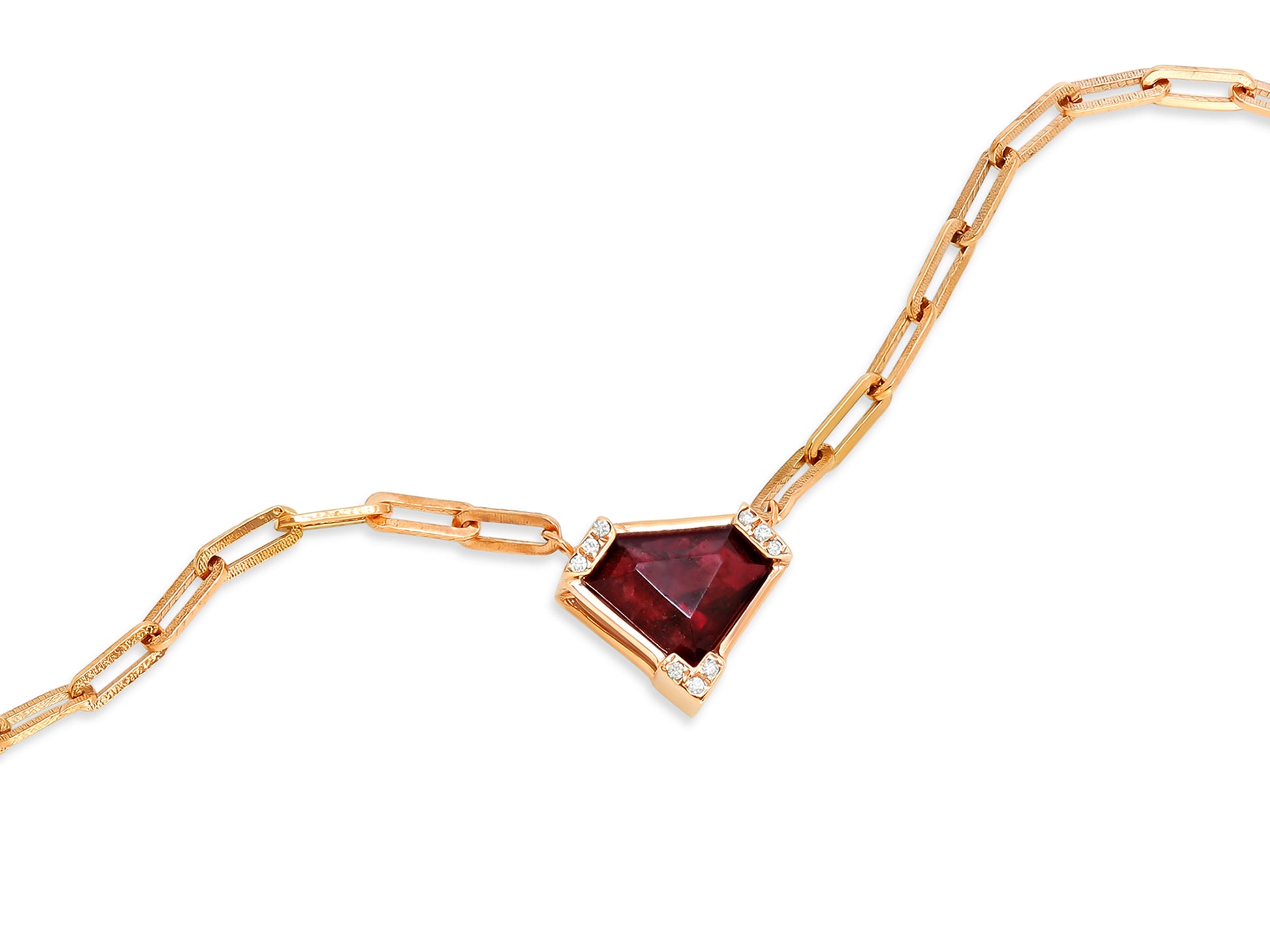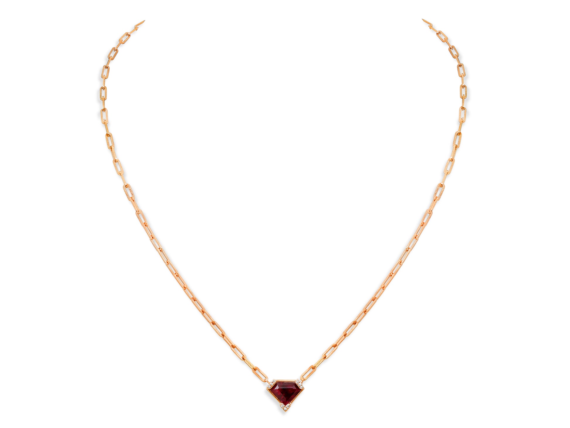 An 16K red gold pendant set with a deep red shield cut ruby on a handmade textured chain.