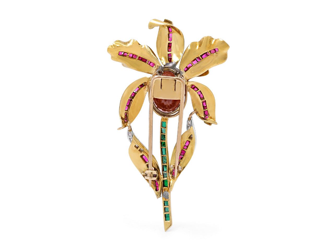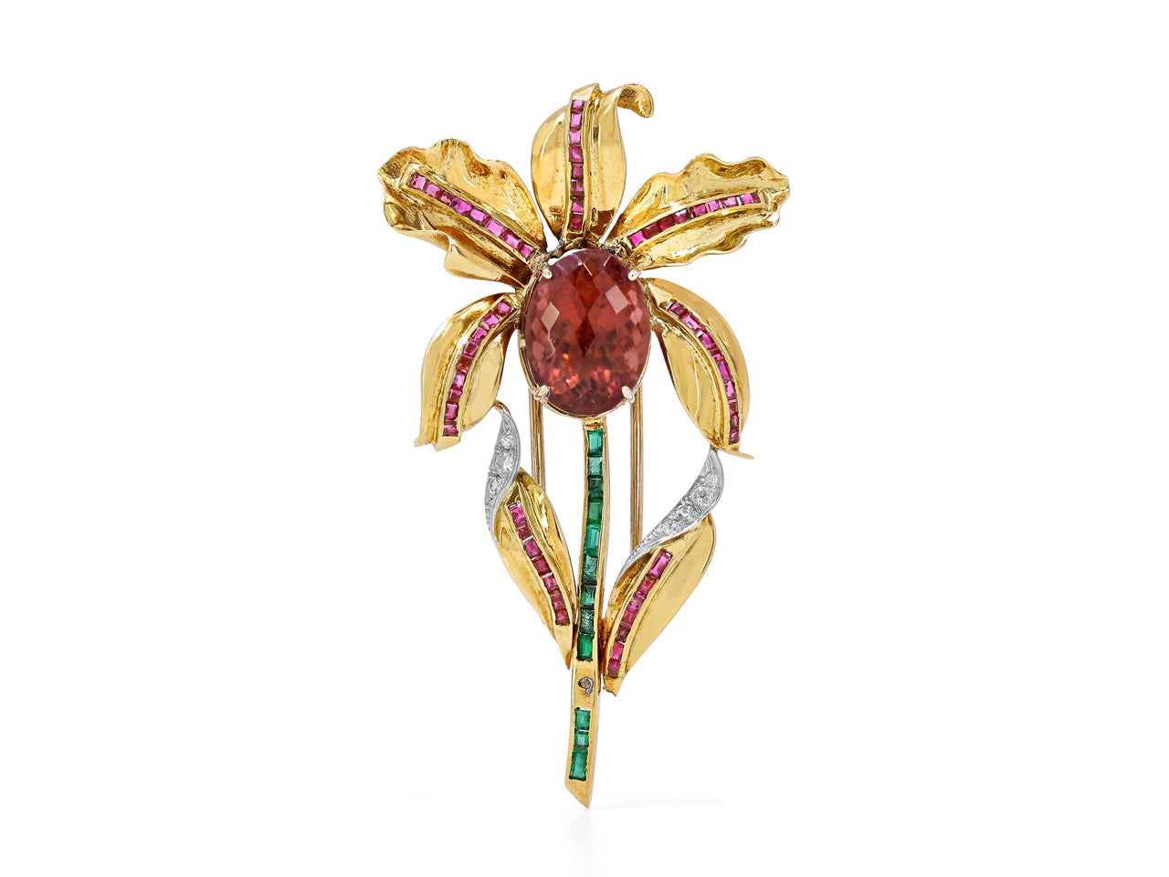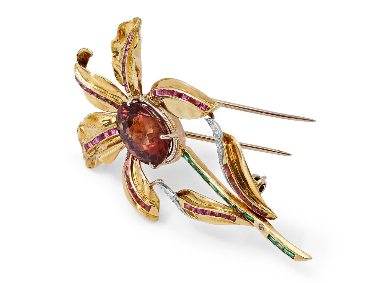 An 18K yellow gold flower brooch circa 1940s, set with an oval tourmaline and calibre rubies and emeralds. French make.