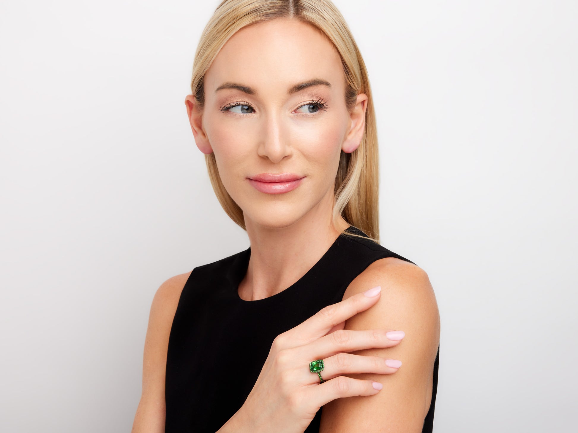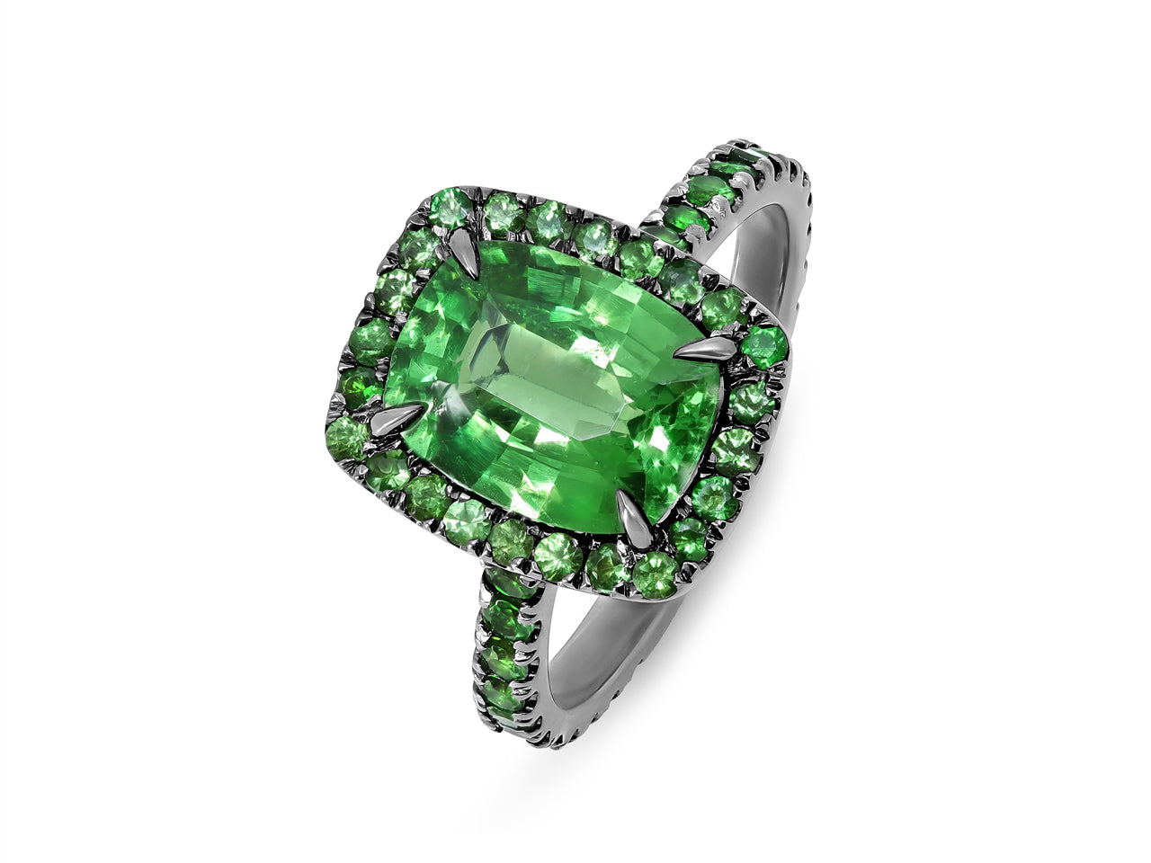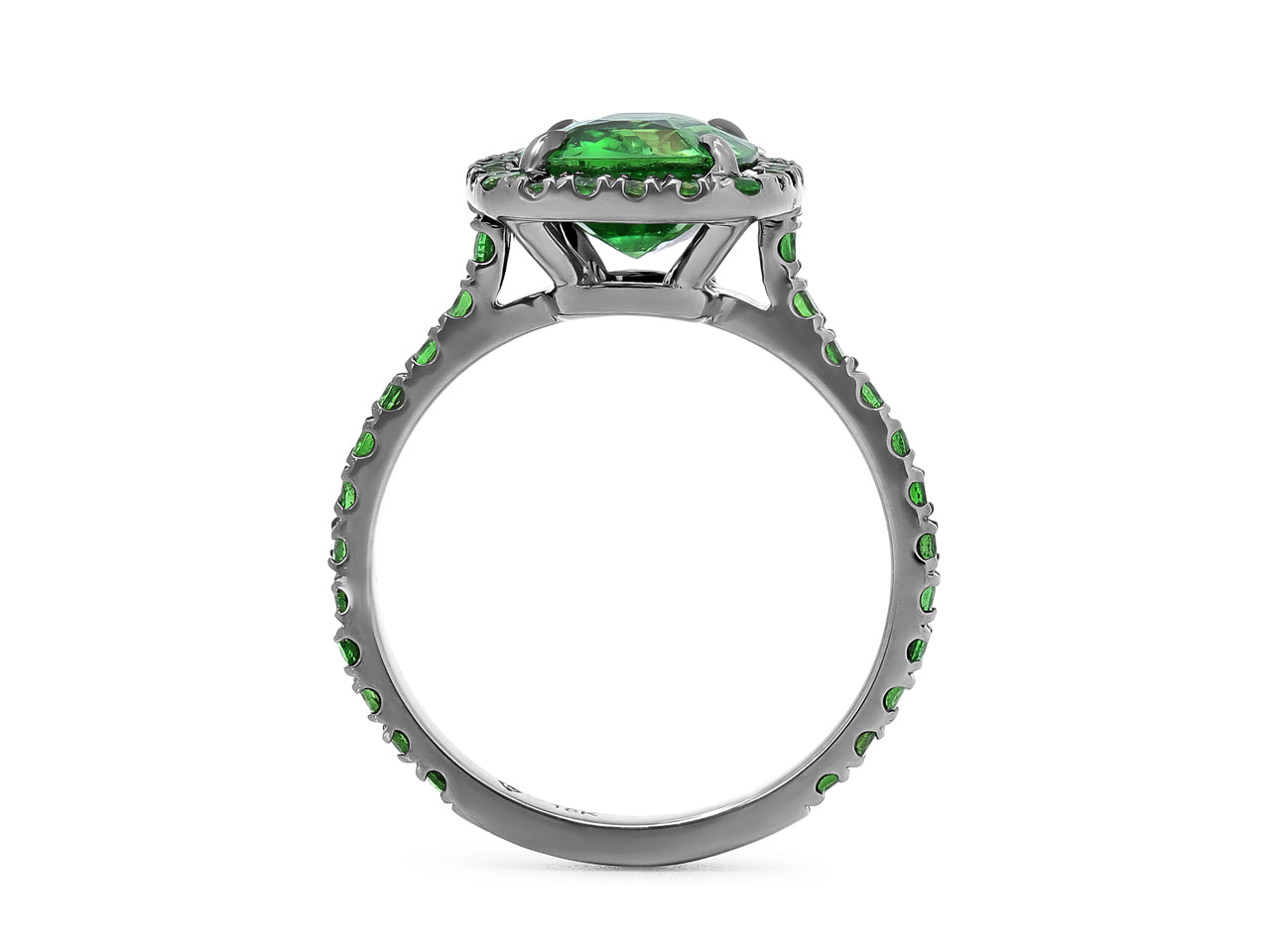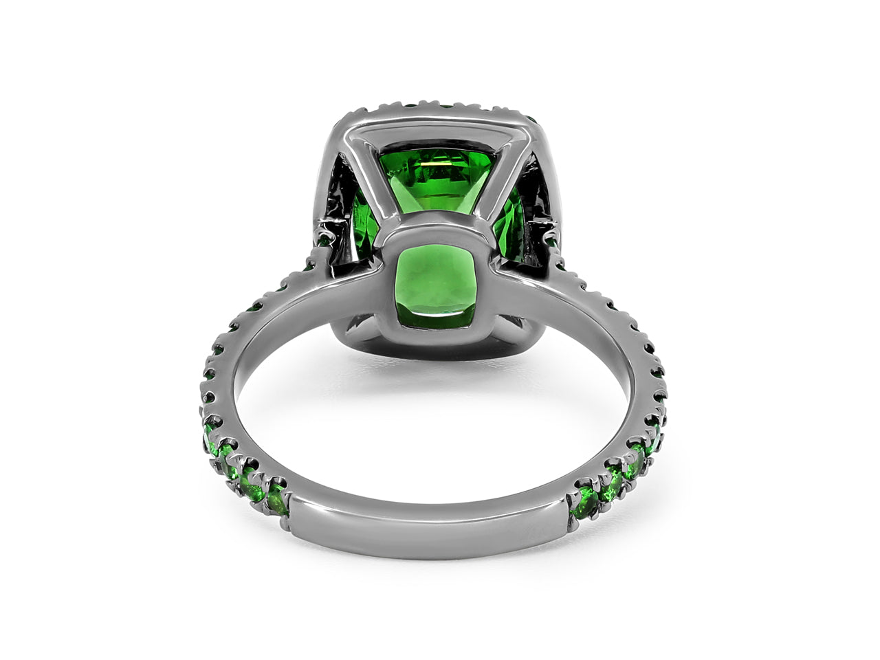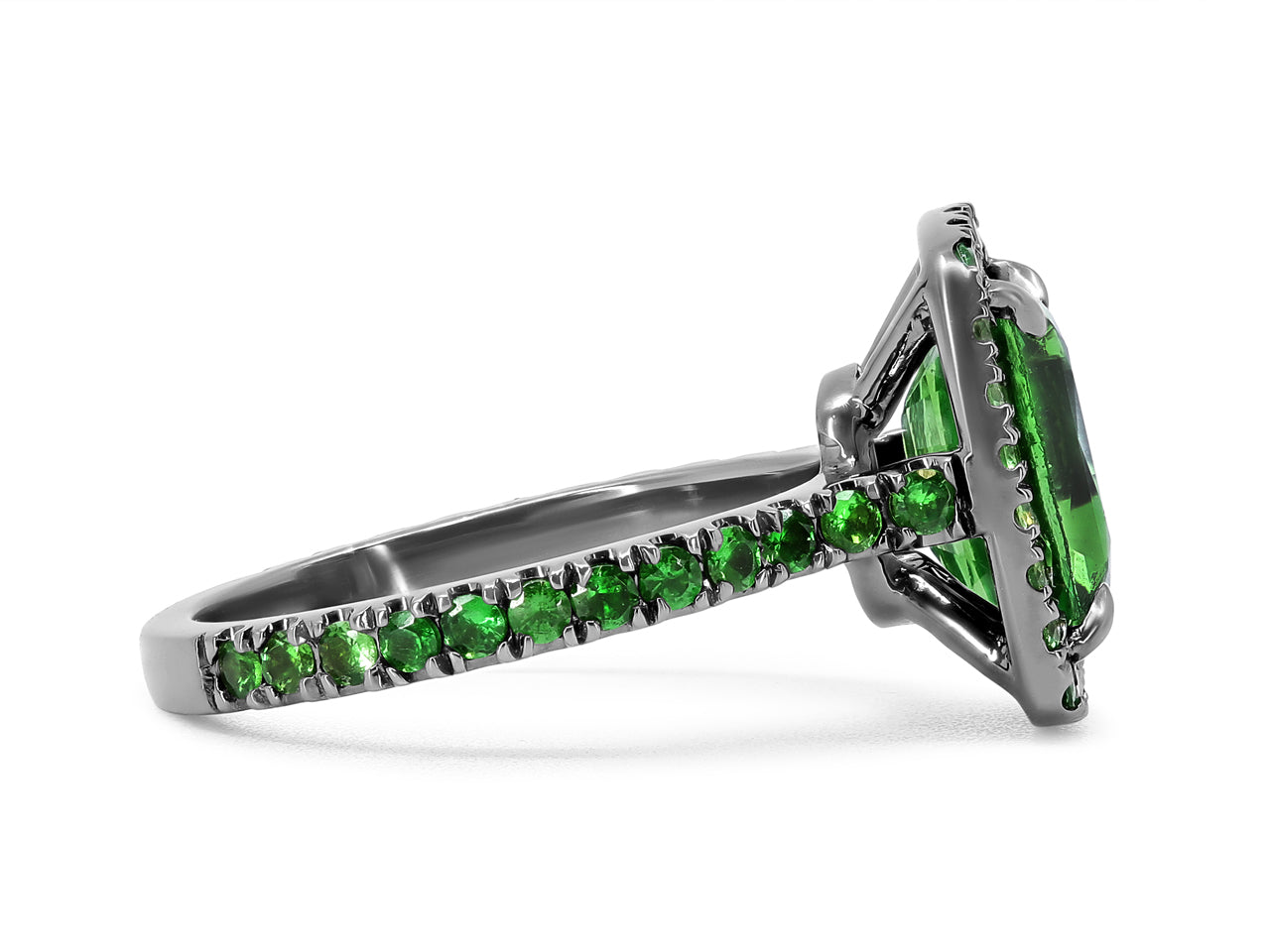 A cushion cut tsavorite garnet set with a halo of melee tsavorite garnets in 18K blackened gold.