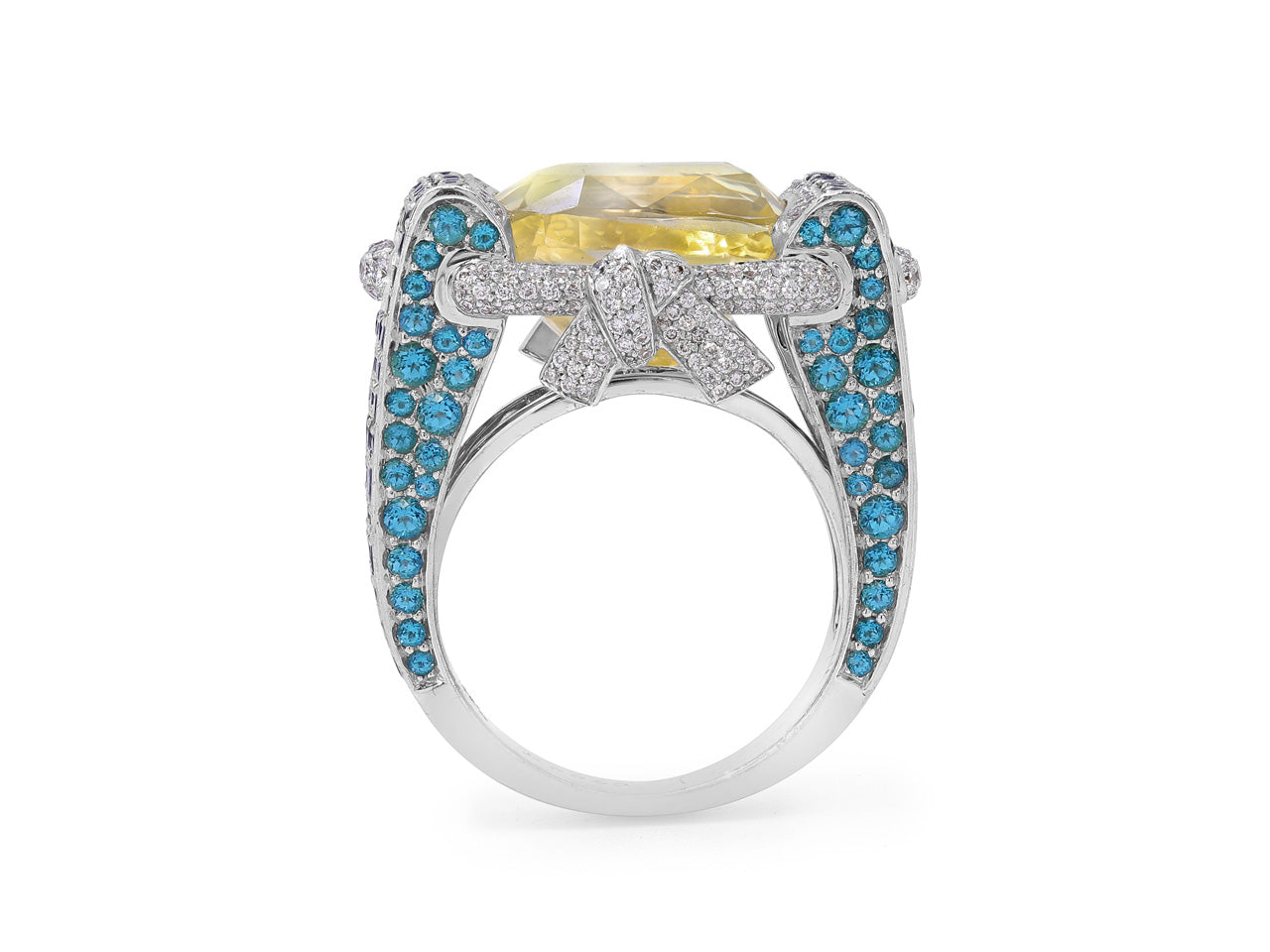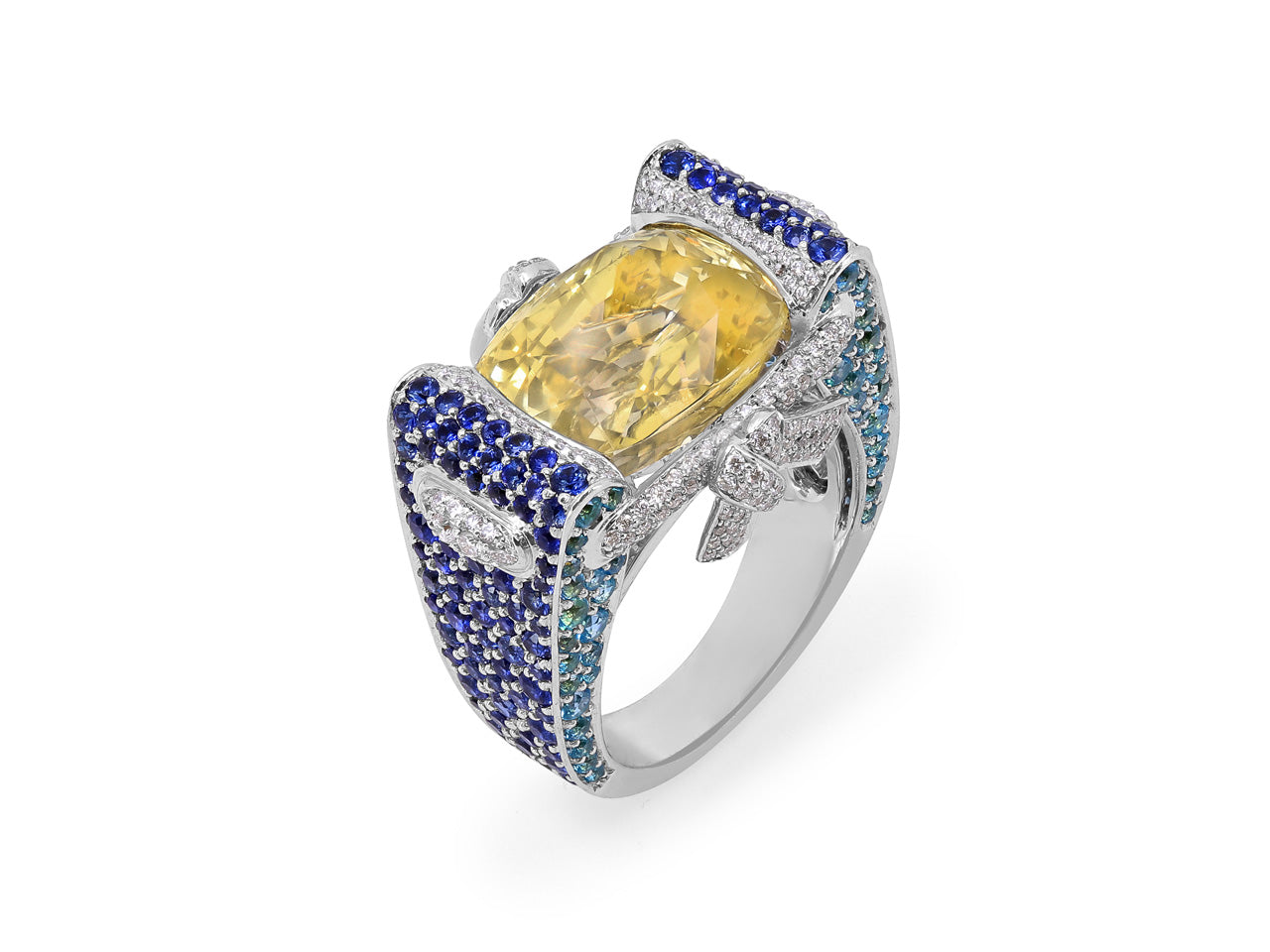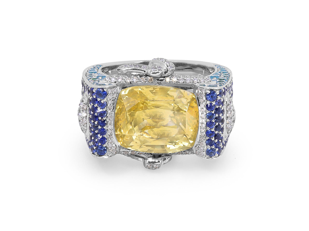 Horizontally set cushion-cut yellow sapphire set with diamonds, blue topaz, and blue sapphires. The GIA describes the yellow sapphire as having no indications of heating.