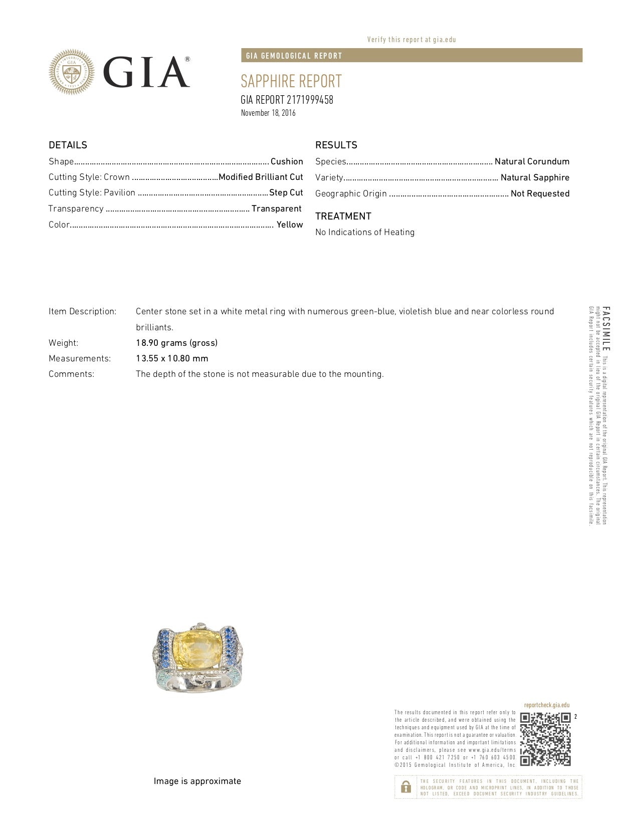Gemstone: Yellow Sapphire: 18.16 carats. GIA Report #2171999458