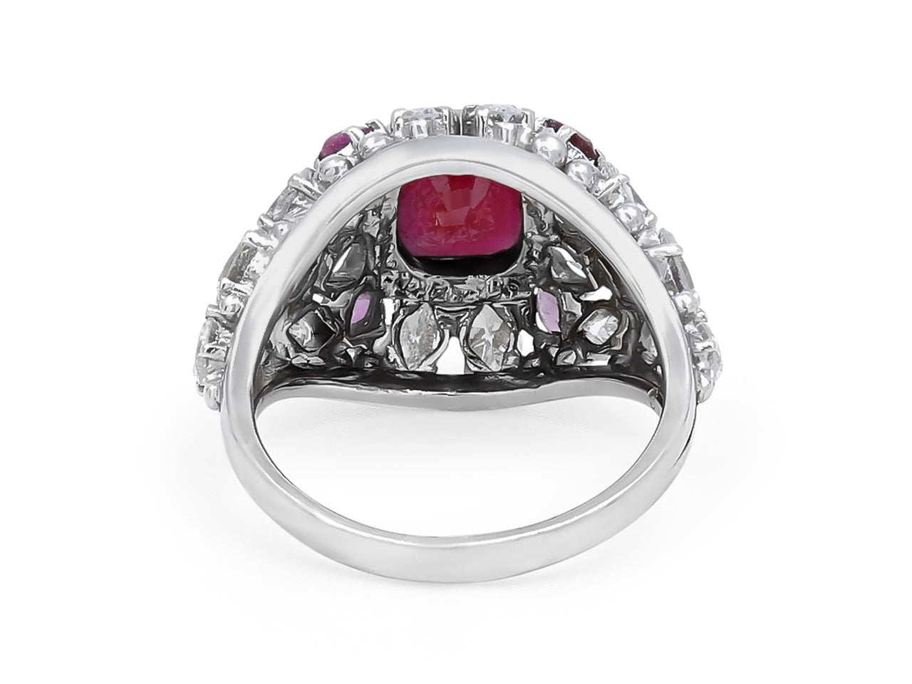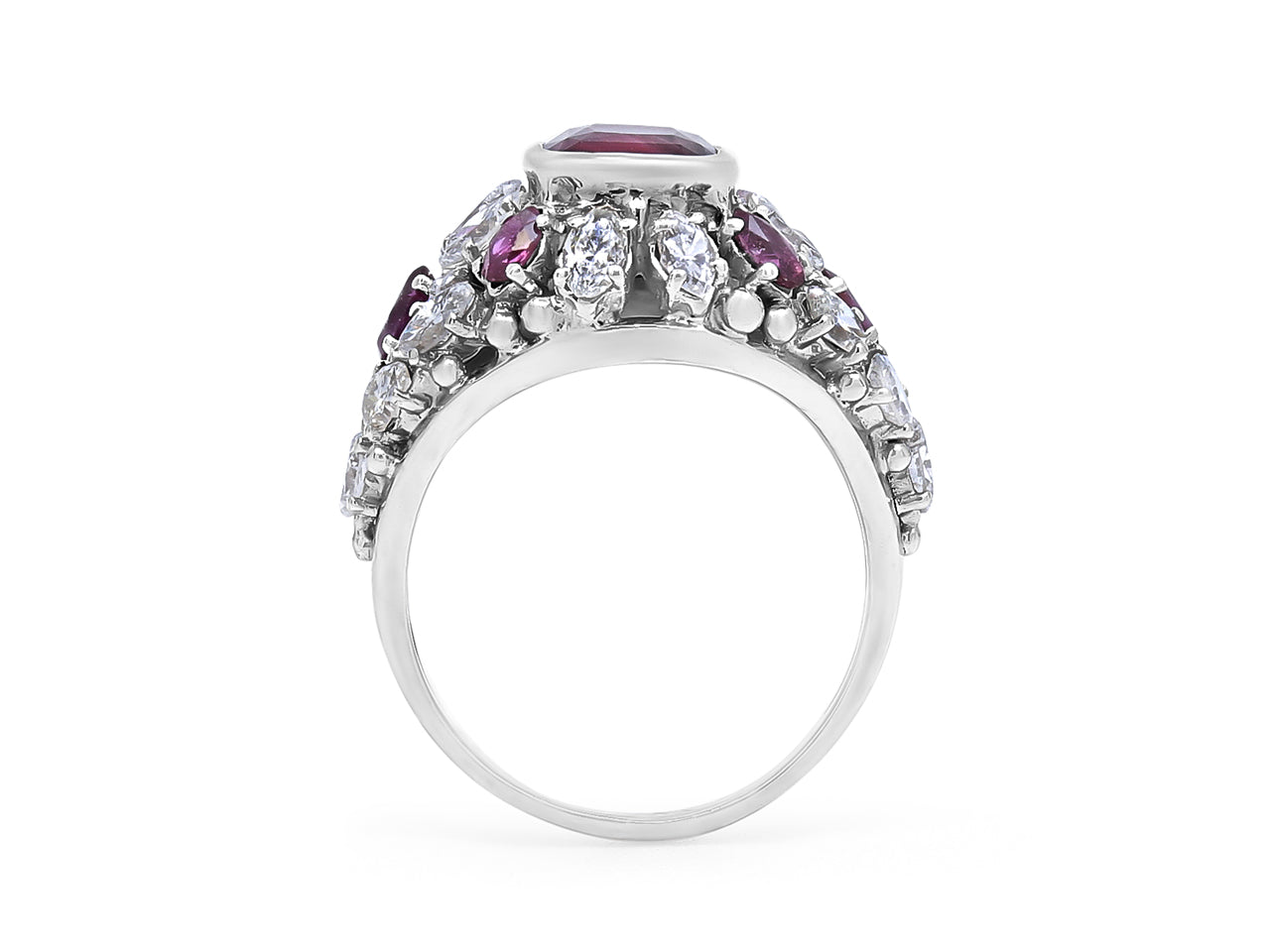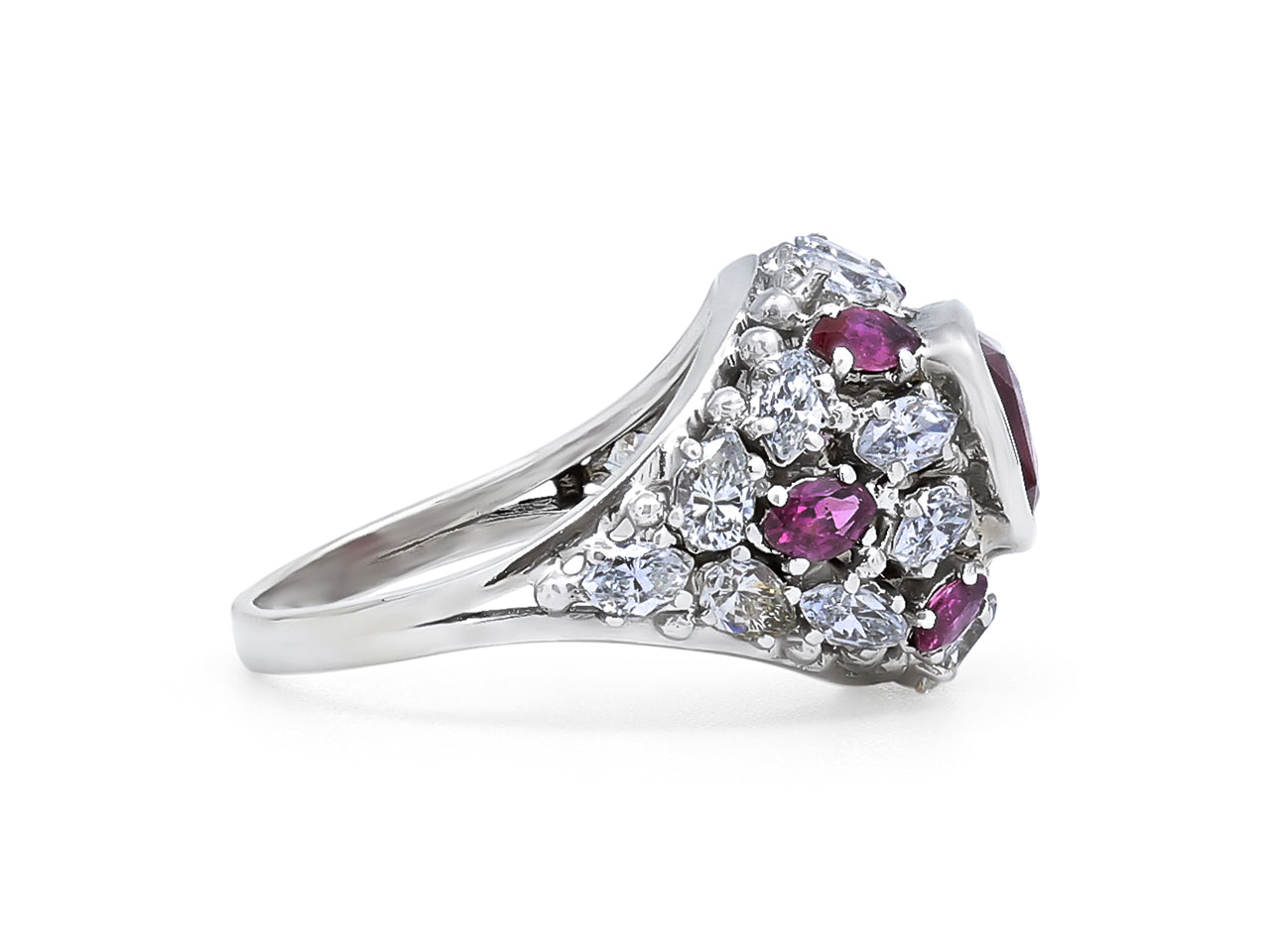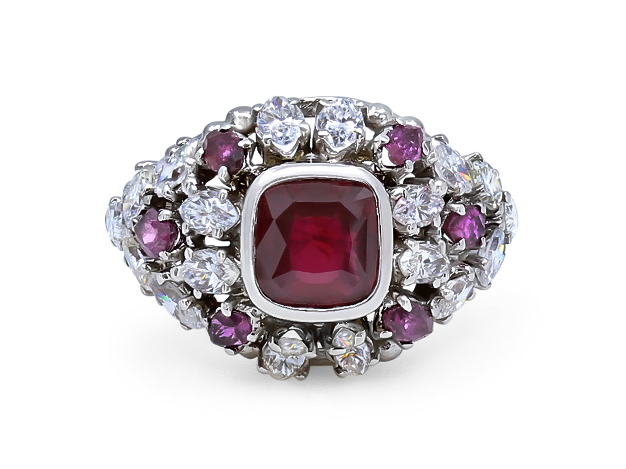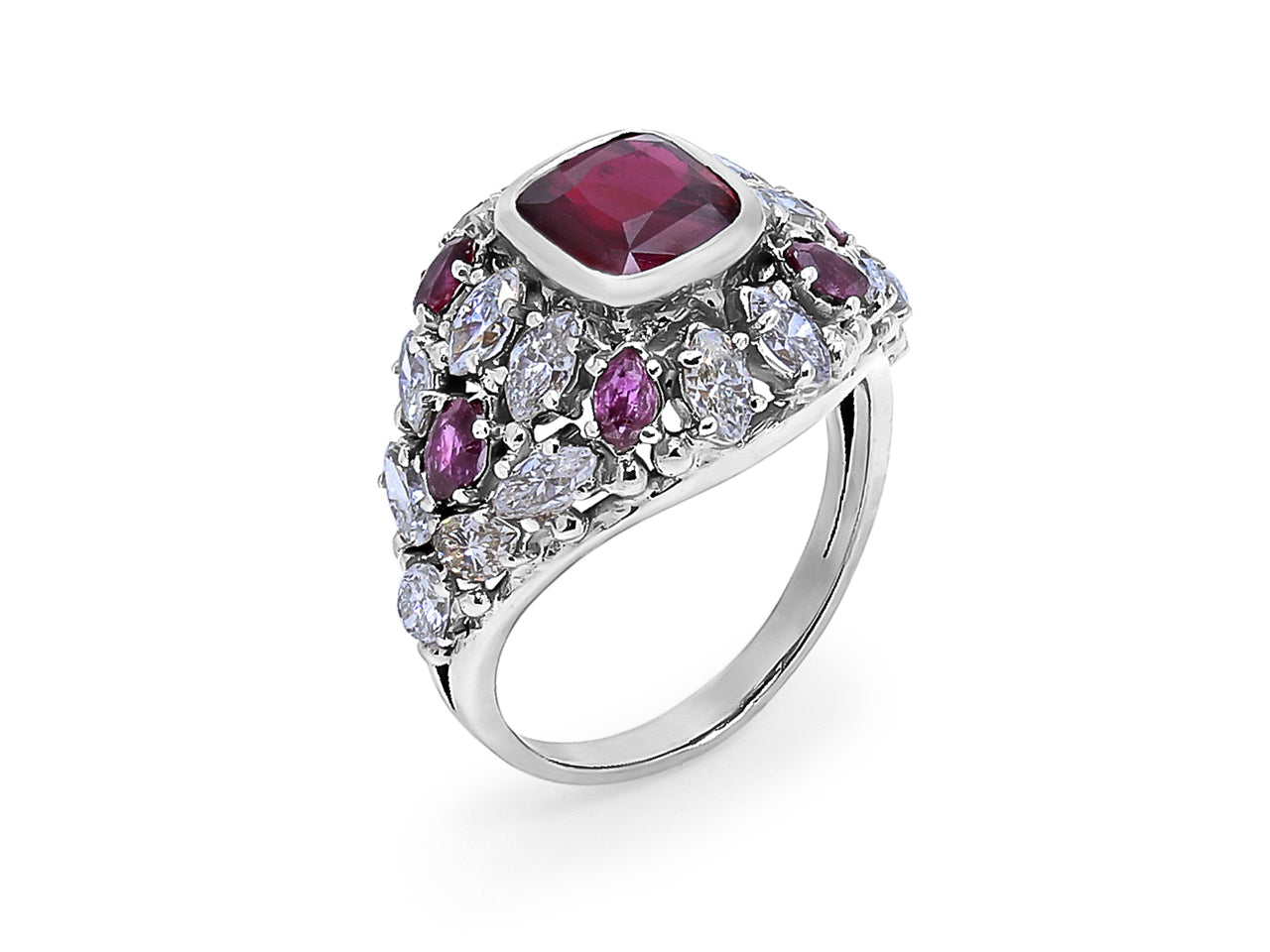 An 18K white gold ring center-set with a 2.01 carat cushion-cut ruby surrounded by six marquise rubies, fourteen marquise-cut diamonds of 1.05 carats, and four pear-cut diamonds of 0.32 carats. The Gemological Institute of America (GIA) describes the cushion-cut ruby as having no indication of heating.