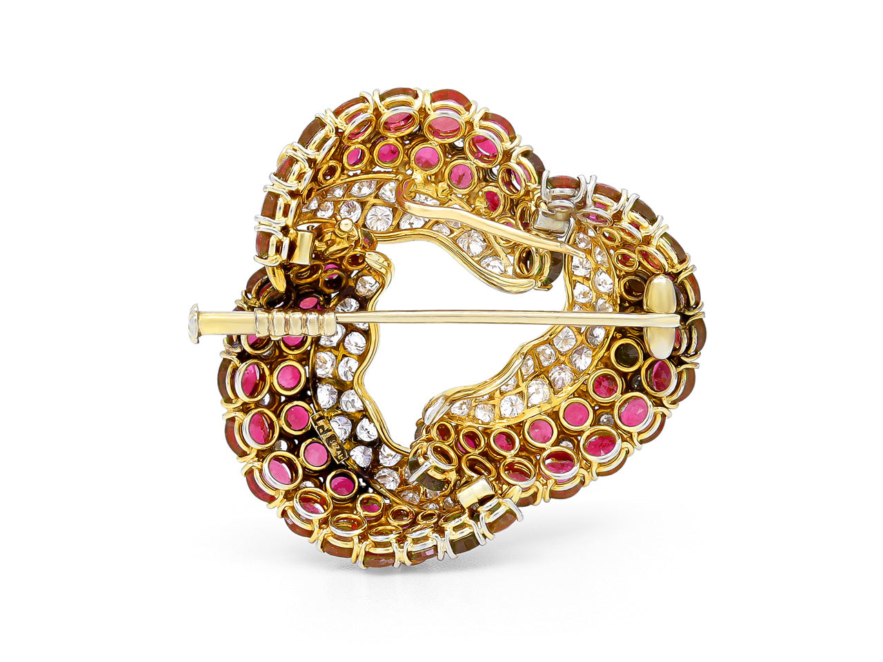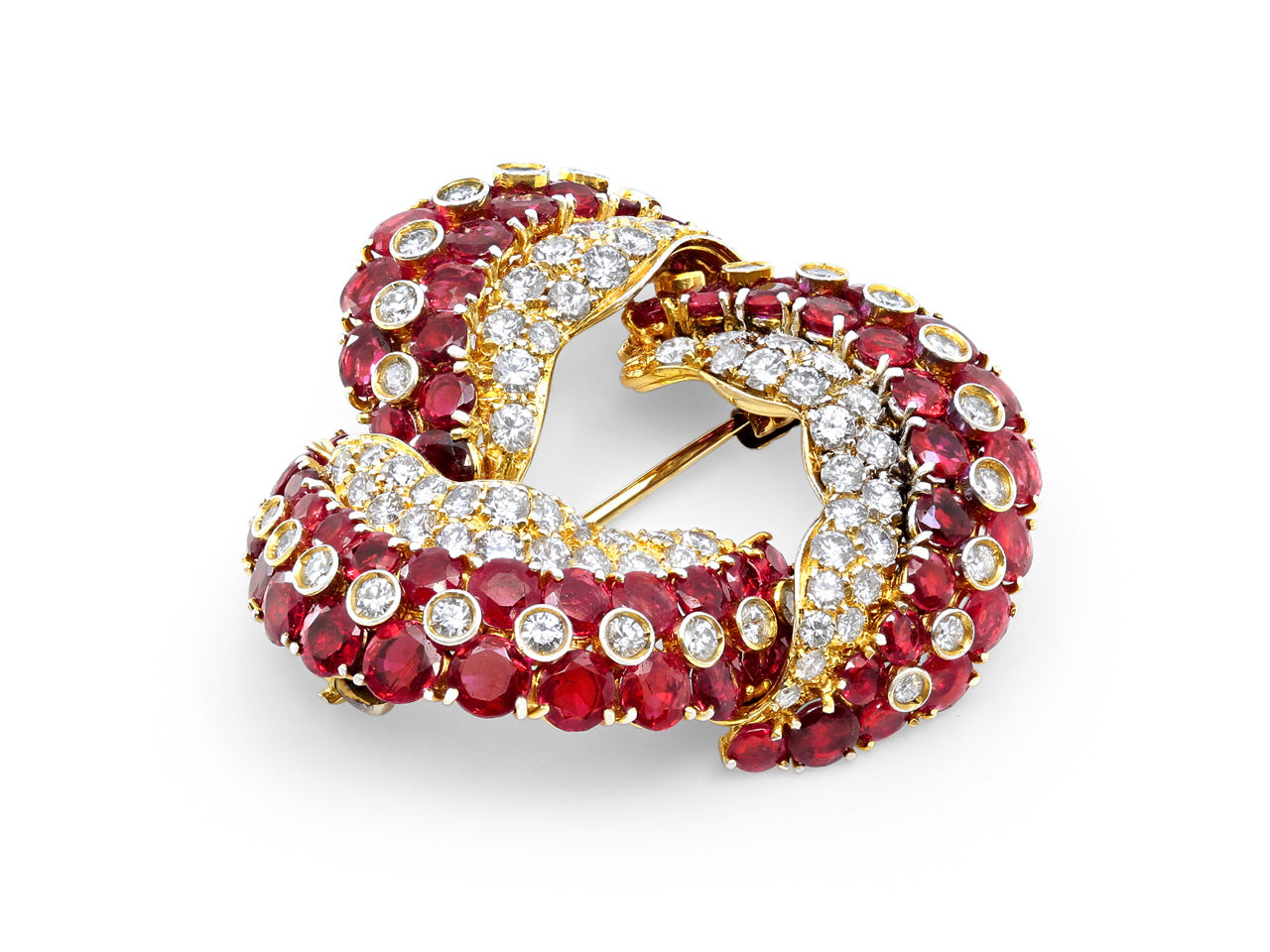 Open Swirl Ruby & Diamond Brooch in 18K Yellow Gold