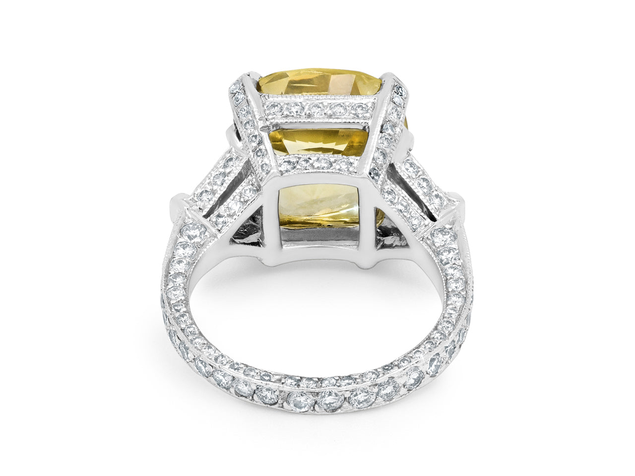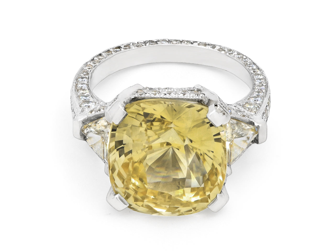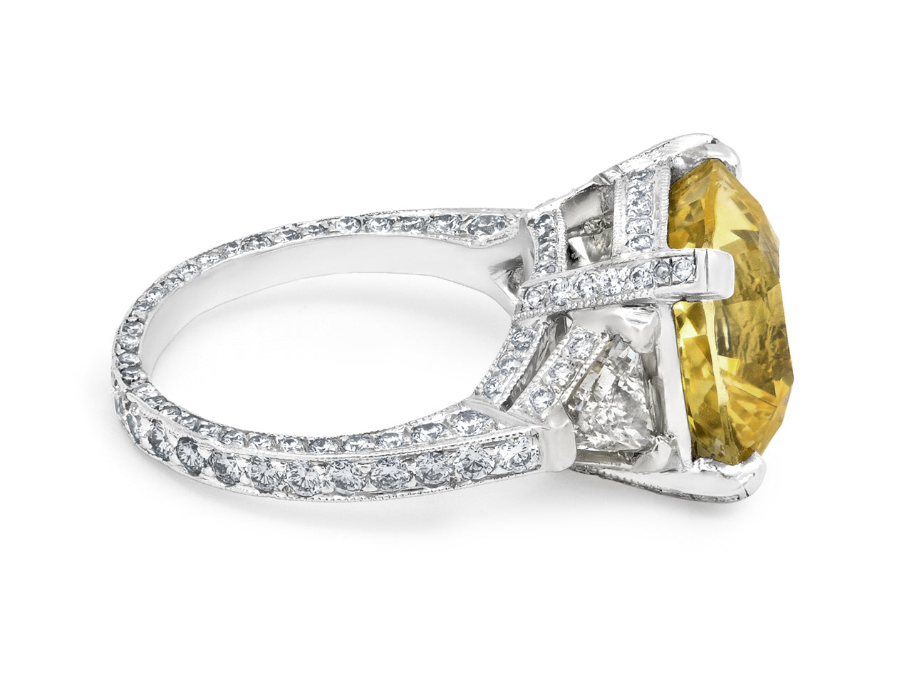 A platinum ring set with a cushion-cut yellow sapphire of 11.69 carats with two trillion-cut diamond side stones of 0.82 carats, and melee diamonds of approximately 2.40 carats along the shank. The Gemological Institute of America (GIA) describes the sapphire as having no indication of heating.